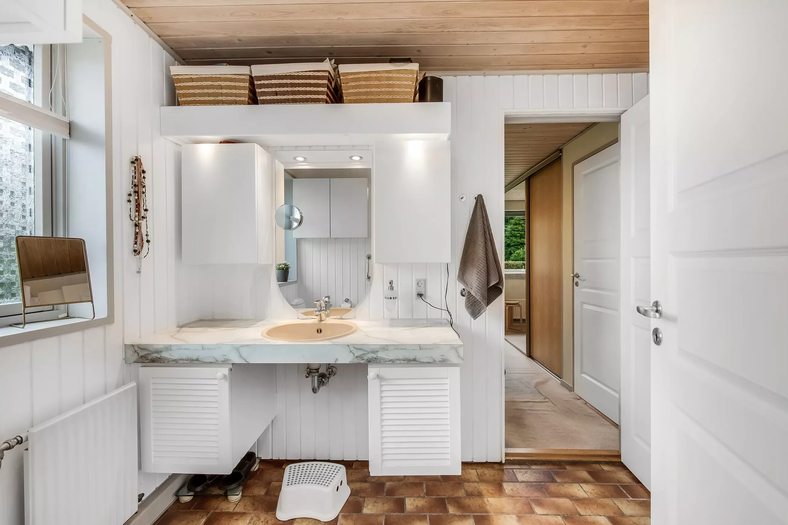 Dejligt badeværelse med vaskemaskine og tørretumbler.