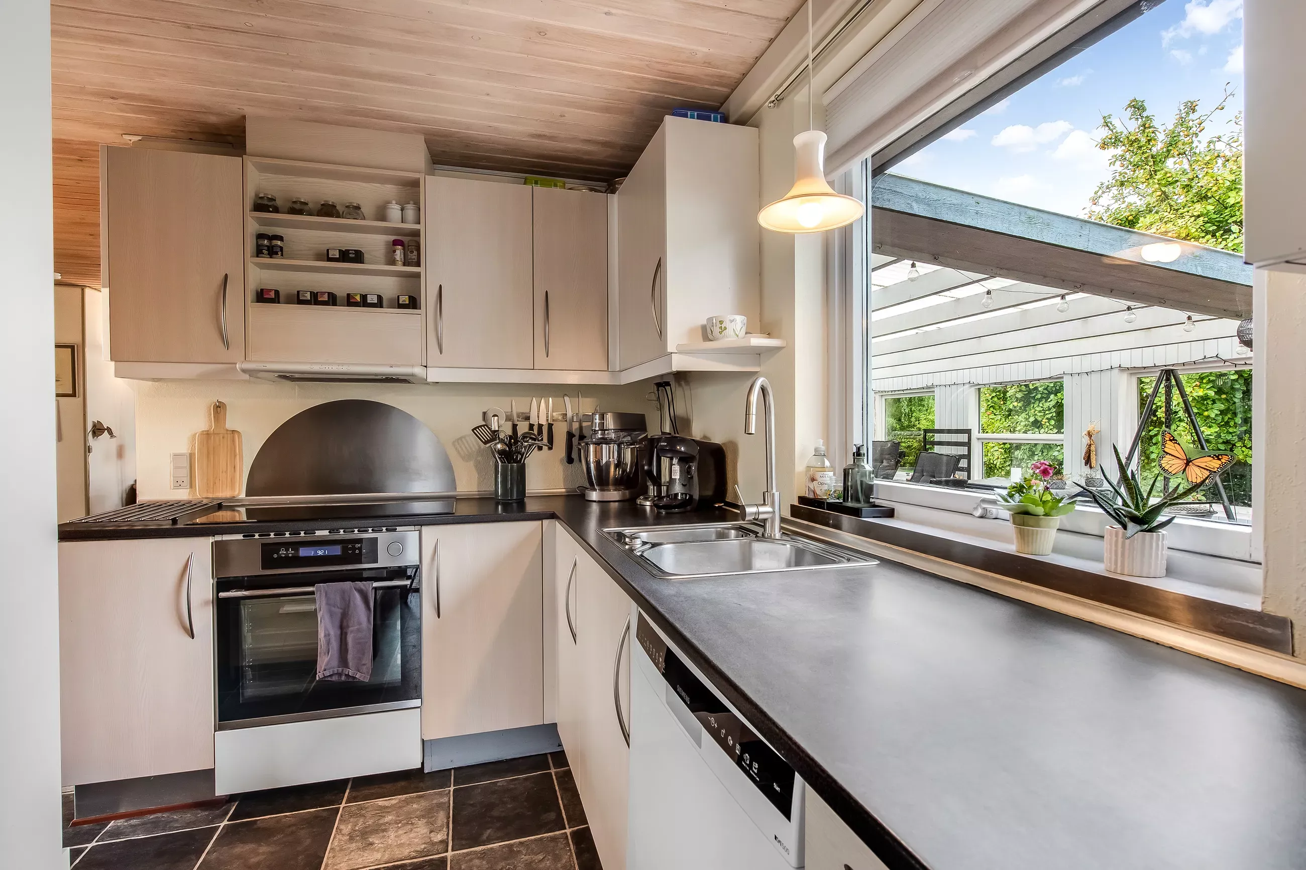 Køkkenet har opvaskemaskine, køl/frys og komfur/emhætte.