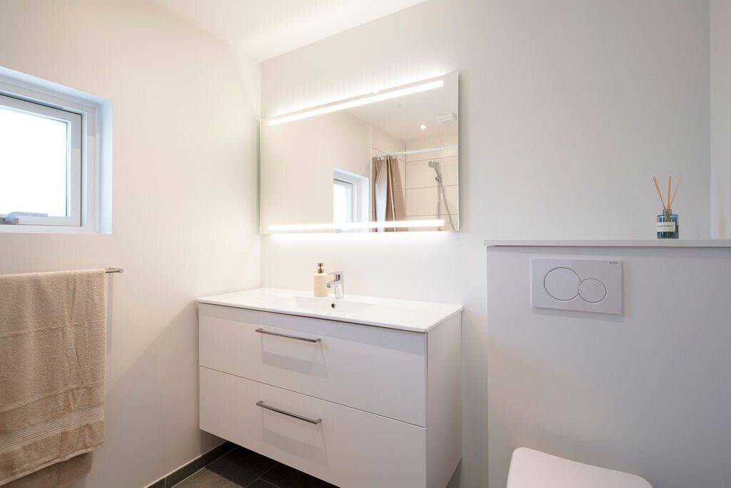 Badeværelset er moderne og velindrettet med bruseniche, væghængt toilet, vaskemøbel med opbevaring samt et vindue, der giver naturligt lys og nem udluftning.