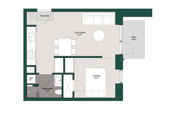 Fra entré hjørnet går man ind i et køkken alrum med et nyt køkken, og hvor man kan have et mindre spisebord samt et mindre stueområde. Fra køkkenalrummet kan man gå ud på altanen, som er rigtig god i størrelsen og med plads til et lille spisebord samt loungesofa m.m.