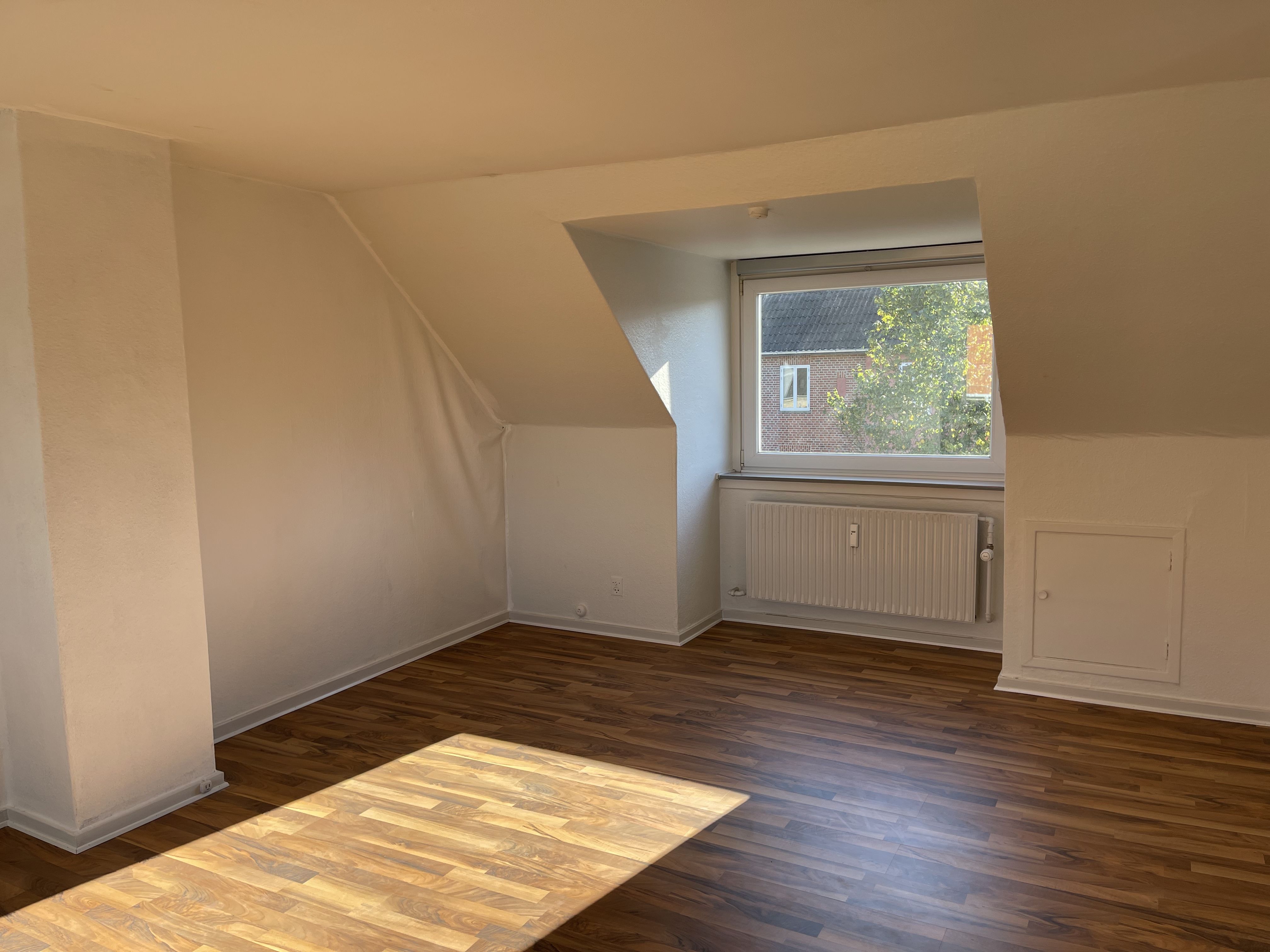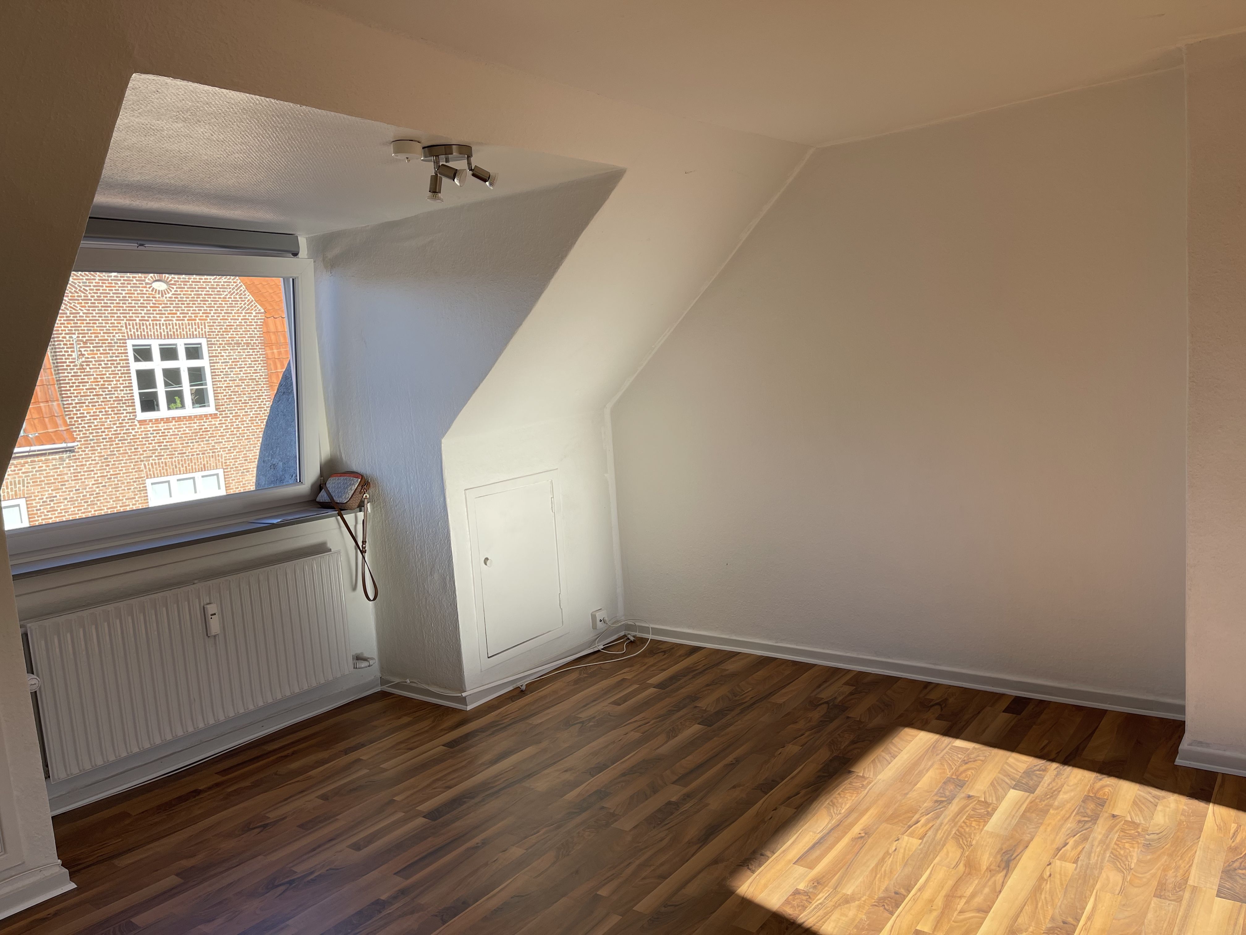 Der er lakerede trægulve i stue og værelse.