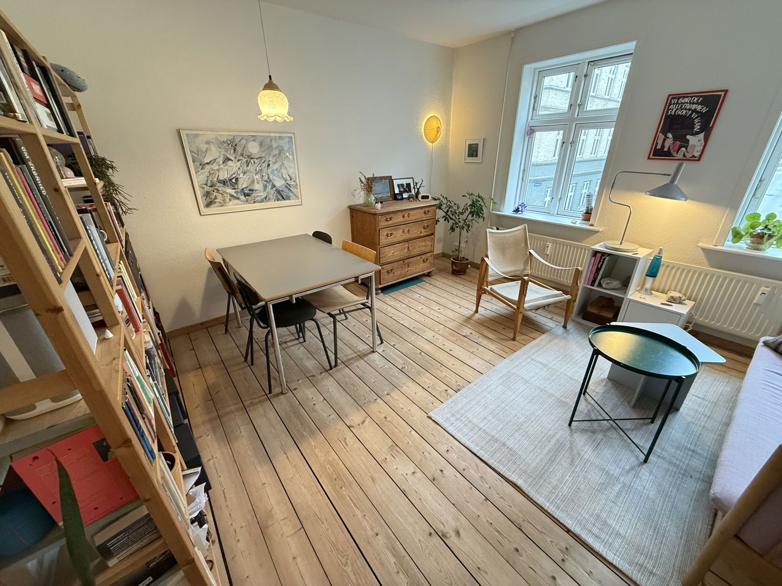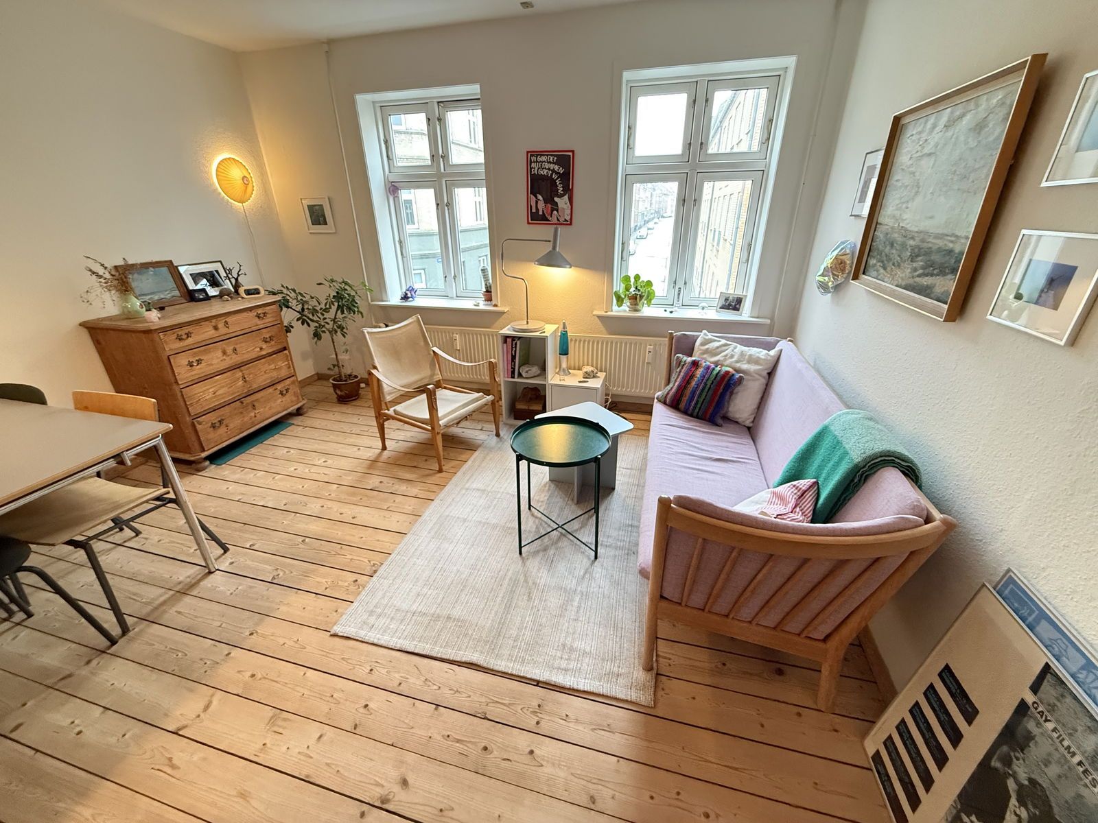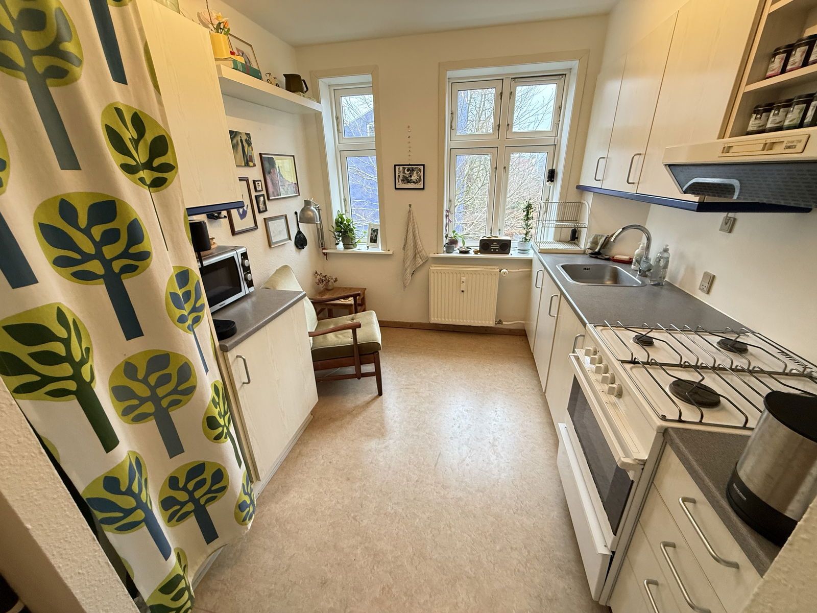 Velkommen til en indbydende og velindrettet 2-værelses lejlighed på 55 m2, hvor lyse gulve, hvide vægge og store vinduer skaber en behagelig atmosfære gennem hele hjemmet. Planløsningen er overskuelig og hverdagsvenlig med entré, stue, separat køkken, soveværelse samt badeværelse med brus. Stuen er lejlighedens naturlige samlingspunkt med to høje vinduer, der giver et flot dagslys og en rar rumfornemmelse. Her er god plads til både sofahjørne og spisebord, og rummet er nemt at møblere med gode vægflader og et roligt, lyst udtryk. Køkkenet ligger separat og fremstår pænt og funktionelt med hvide elementer, flisebeklædt væg og et vindue ved arbejdspladsen. Her er komfur med keramisk kogeplade, ovn og emhætte samt fornuftig skabs- og bordplads i et kompakt, veludnyttet forløb. Soveværelset har en god størrelse med plads til dobbeltseng, garderobeskabe og eventuelt et lille skrivebord. Også her går de lyse gulve igen, og det store vindue sikrer et behageligt lysindfald. Badeværelset er enkelt og velholdt med bruser, håndvask og toilet – samlet i et funktionelt rum med praktiske overflader. Entréen giver plads til overtøj og sko, så hverdagen glider let. Alt i alt et oplagt valg for singlen eller parret, der ønsker en lys og indflytningsklar lejlighed med separat soveværelse og køkken – lige til at gøre til sit eget. Kontakt os for en fremvisning.