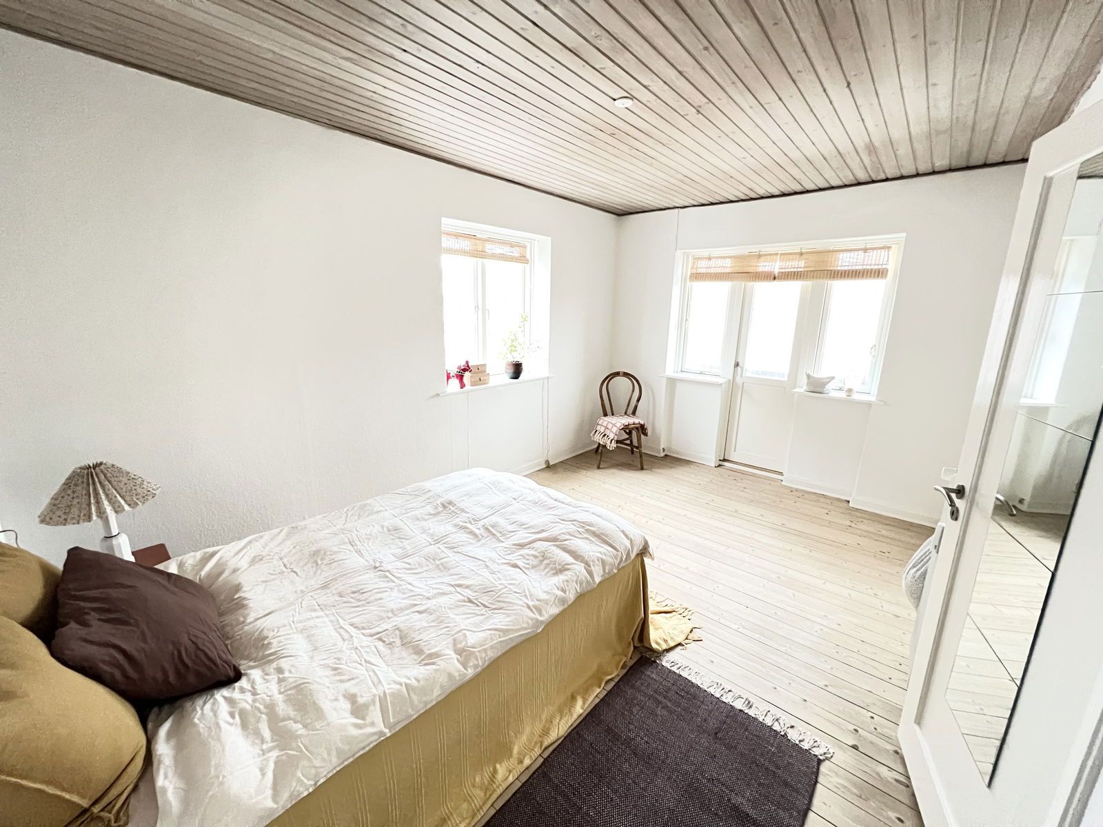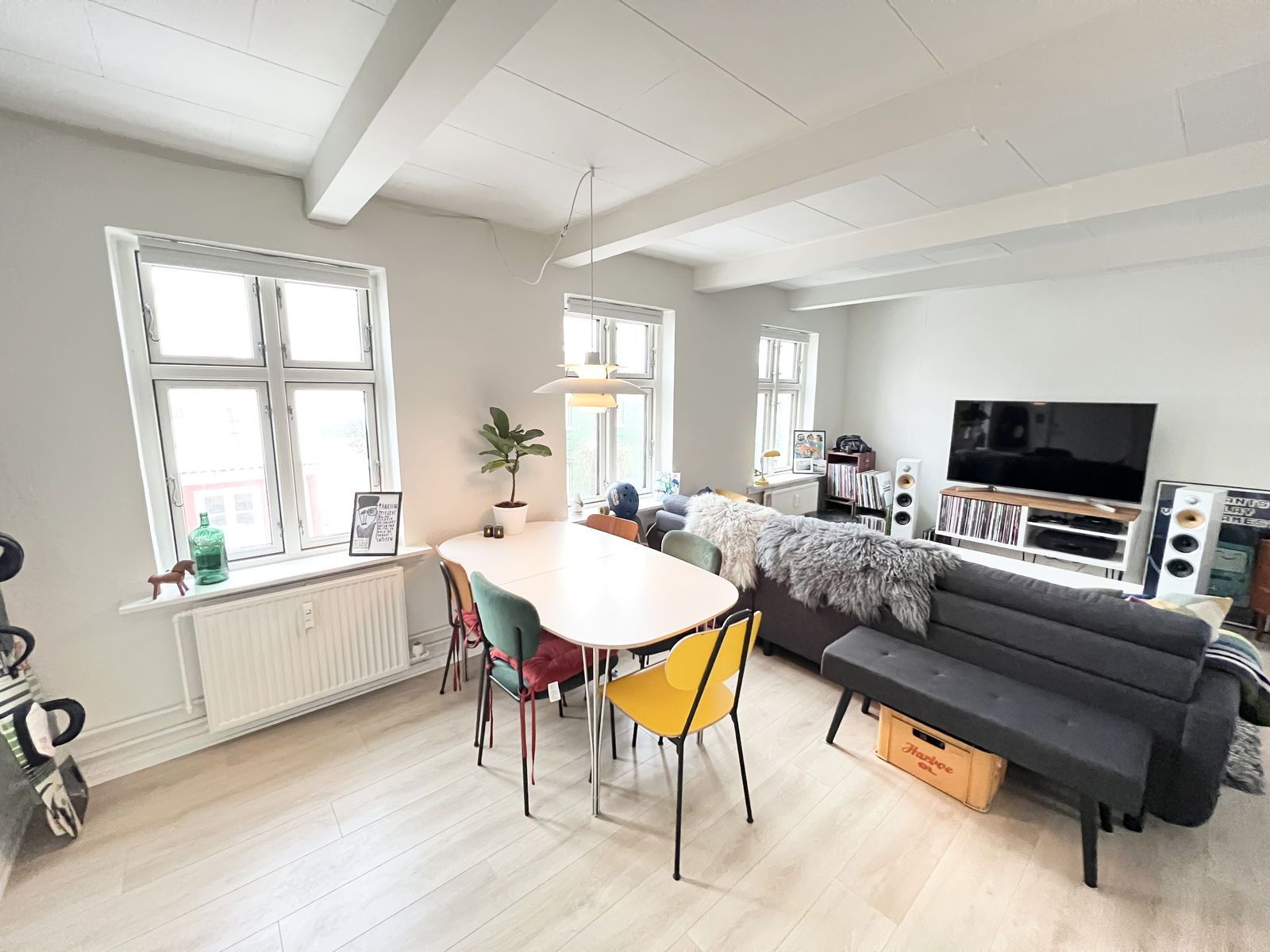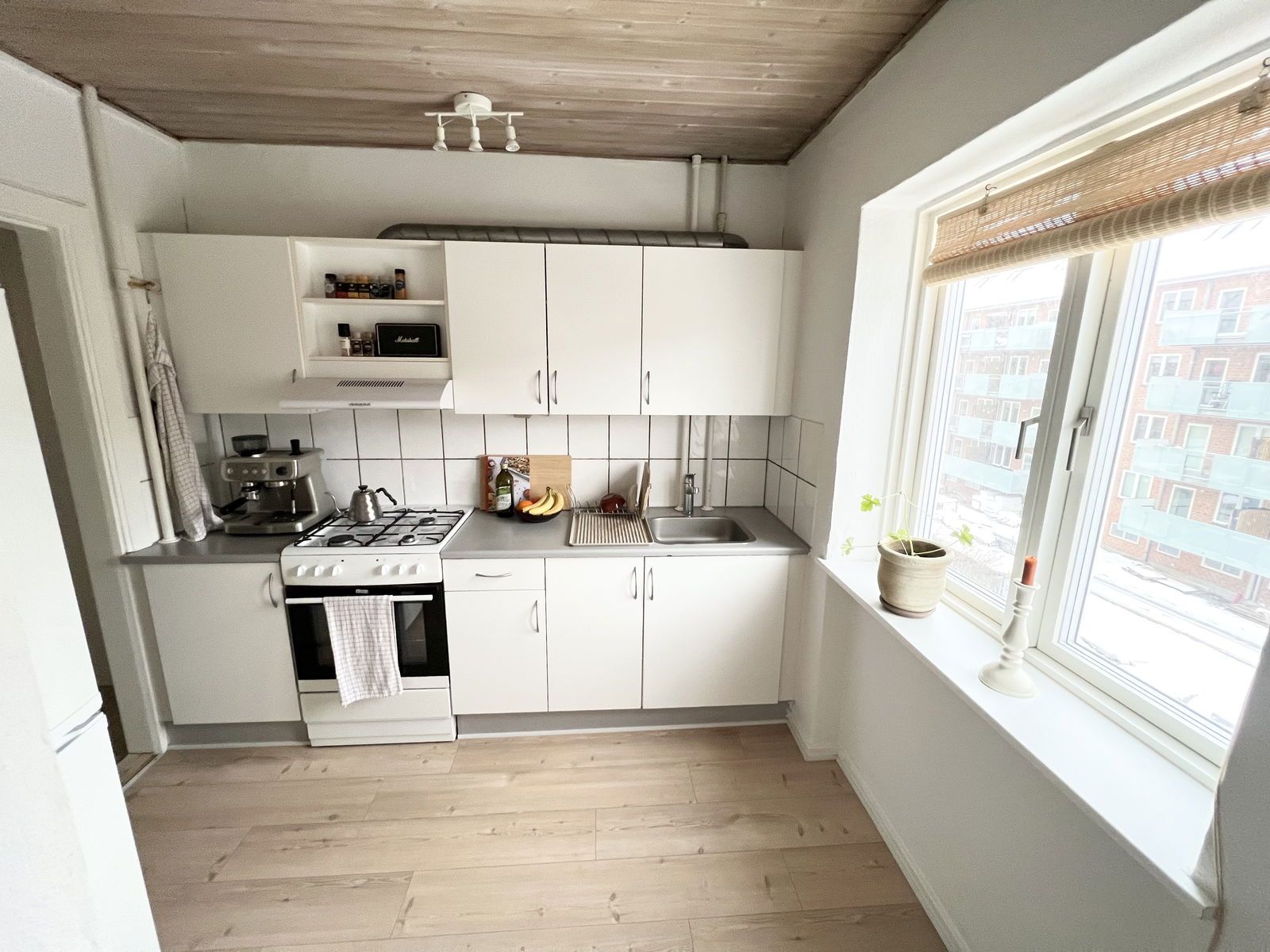 Lejligheden er 57 m2 og indeholder et dejligt køkken, bad og to værelser, hertil en stor hems på 12 m2.