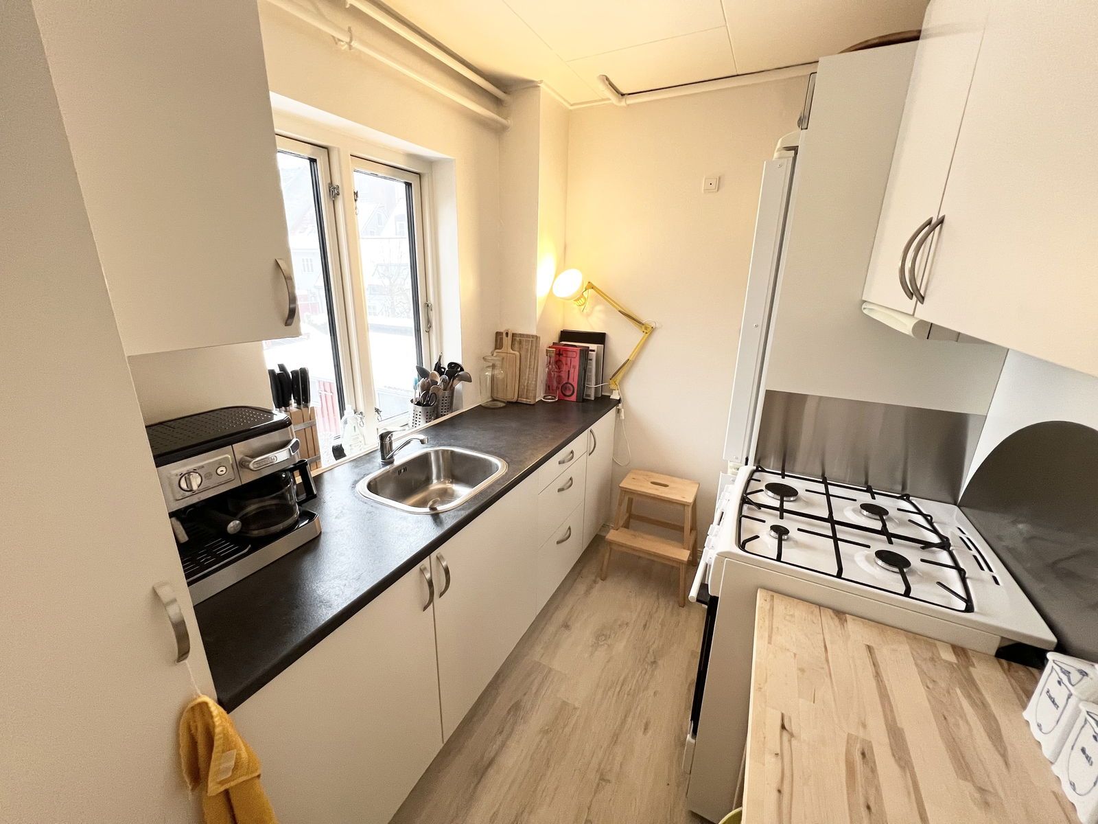 Lejligheden ligger over for Saxogade Handelsskole, få hundrede meter fra øvrige uddannelsesinstitutioner, havnen med rekreative områder, indkøb, gågader, Jomfru Ane Gade, bus til Uni m.m.