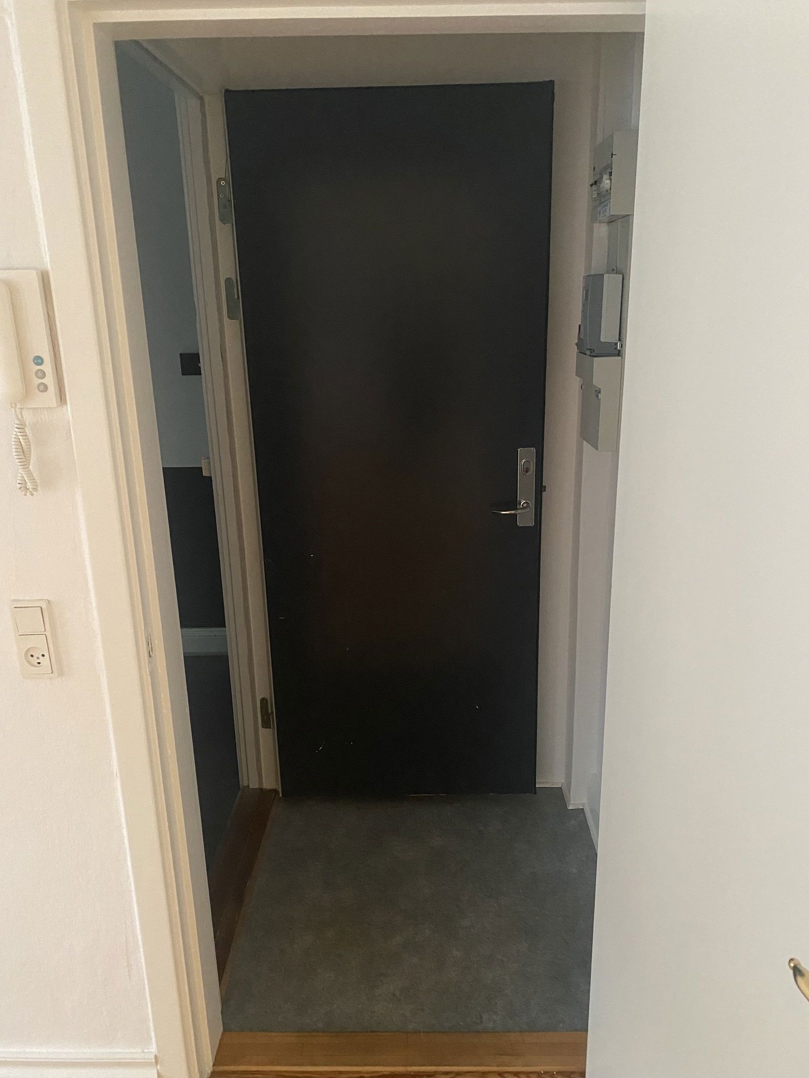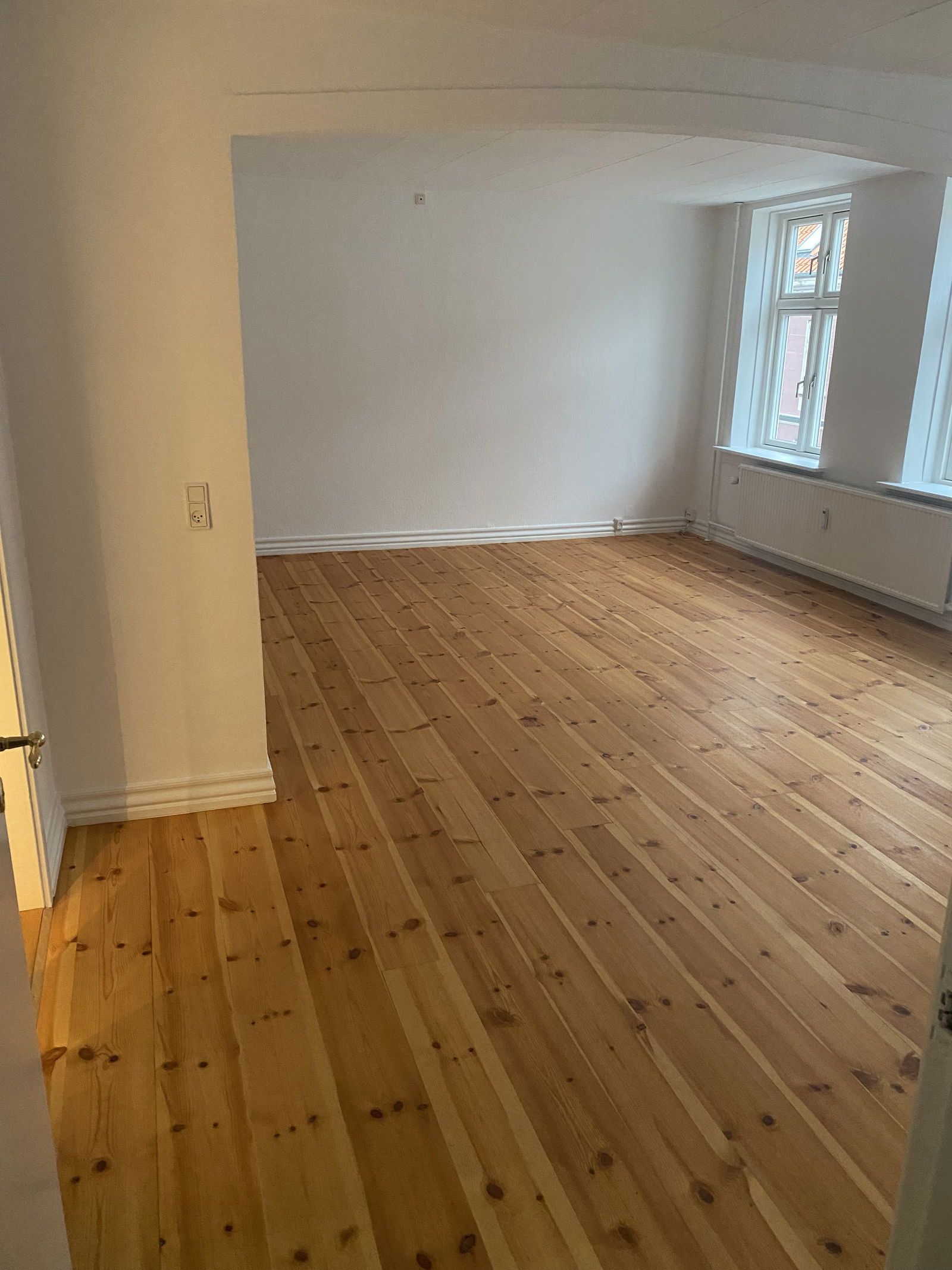 - Gulvene er belagt med smukt asketræ fra Tarkett og de flotteste grå fliser på badeværelset.