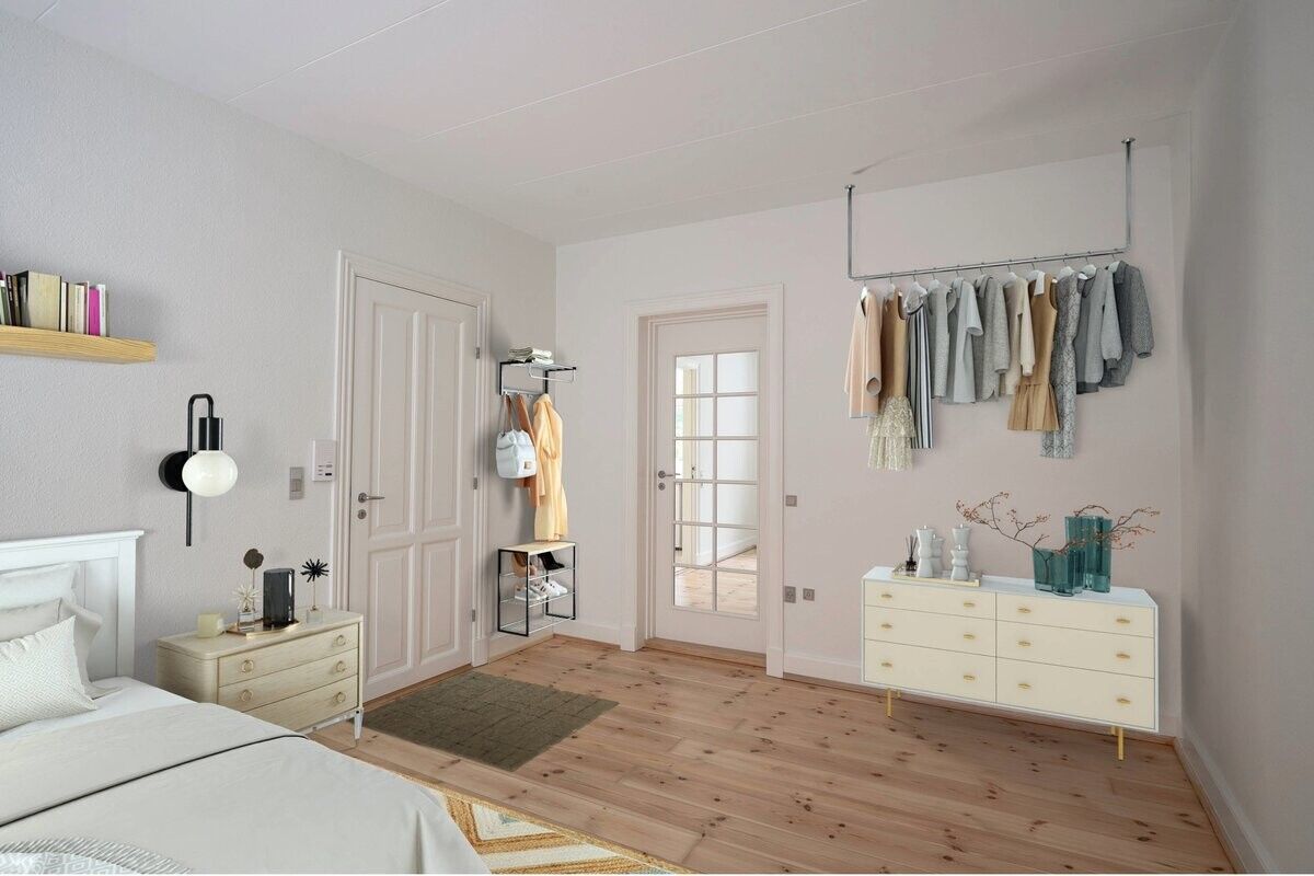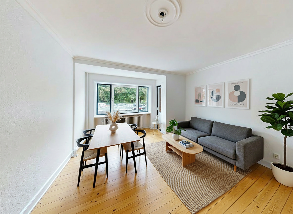 Lejligheden er nymalet fra gulv til loft – gulve, vægge, lofter og træværk er netop opfrisket – og de hvidmalede plankegulve i stue, soveværelse og entré skaber et lyst og rent udtryk. I køkkenet er der slidstærkt vinyl, som er praktisk i dagligdagen. Køkkenet er holdt i hvide, tidløse fronter med mørk bordplade og komplet hvidevarepakke: emhætte, keramisk kogeplade, indbygningsovn, køle-/fryseskab og opvaskemaskine.