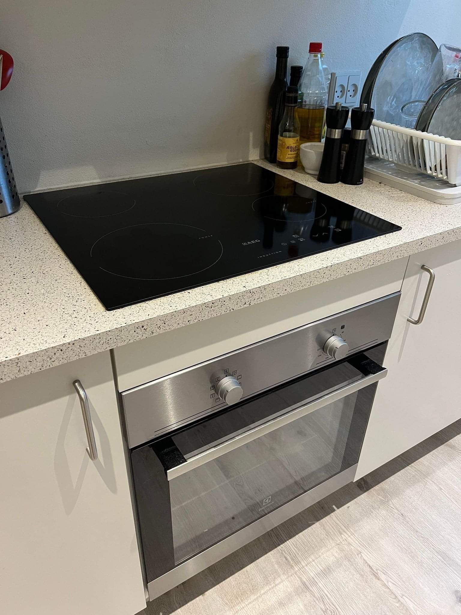 Lejligheden er med hvidt køkken med induktionskogeplade, indbygningsovn, opvaskemaskine og køle-/fryseskab.