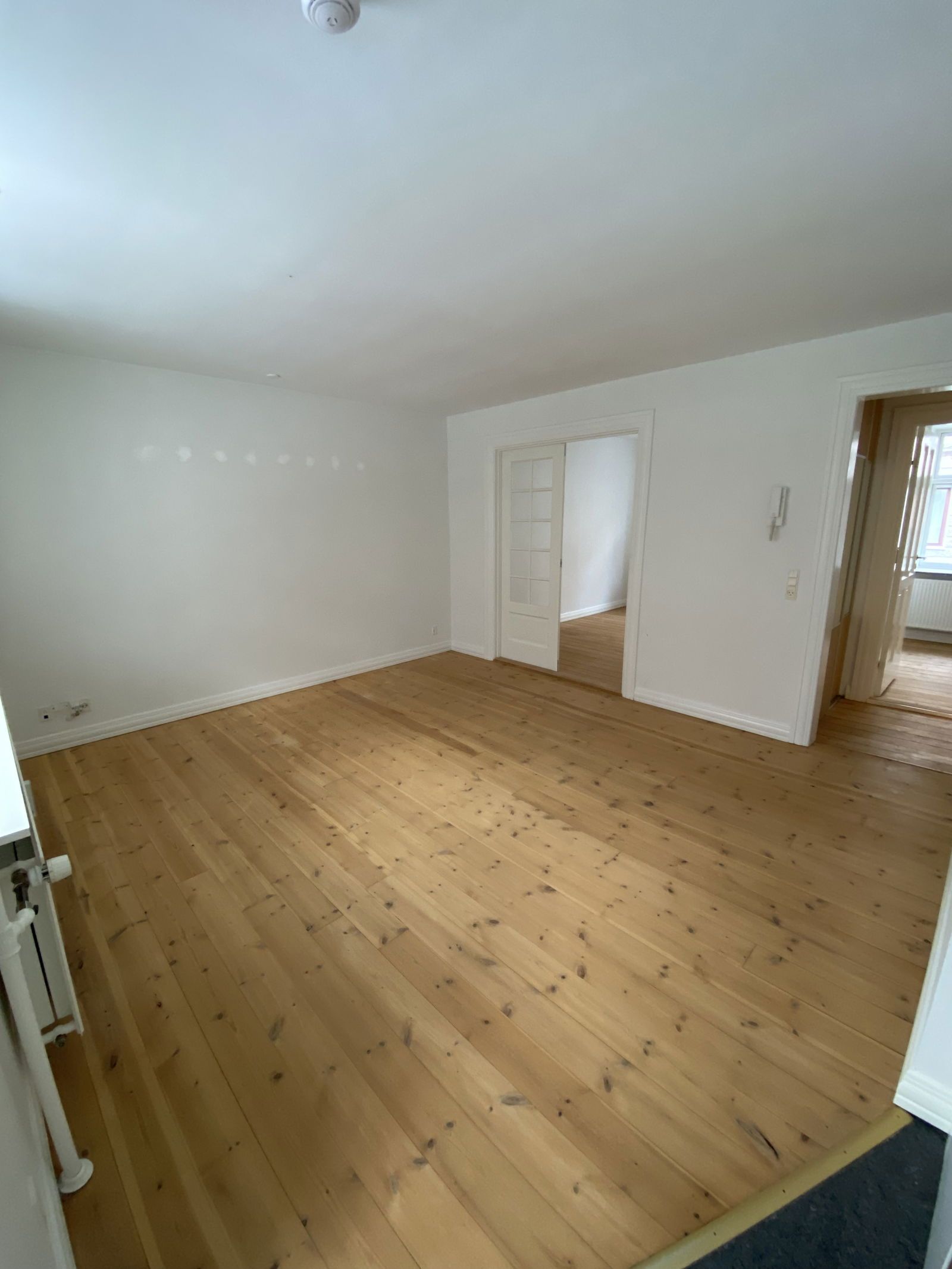 Du bydes velkommen i entréen, som fører direkte videre til køkkenet. Til højre ligger det første soveværelse med vindue mod den rolige baggård. Fra stuen er der adgang til lejlighedens andet værelse samt trappen ned til kælderrummet. Badeværelset er rummeligt og indrettet med bruseniche.
