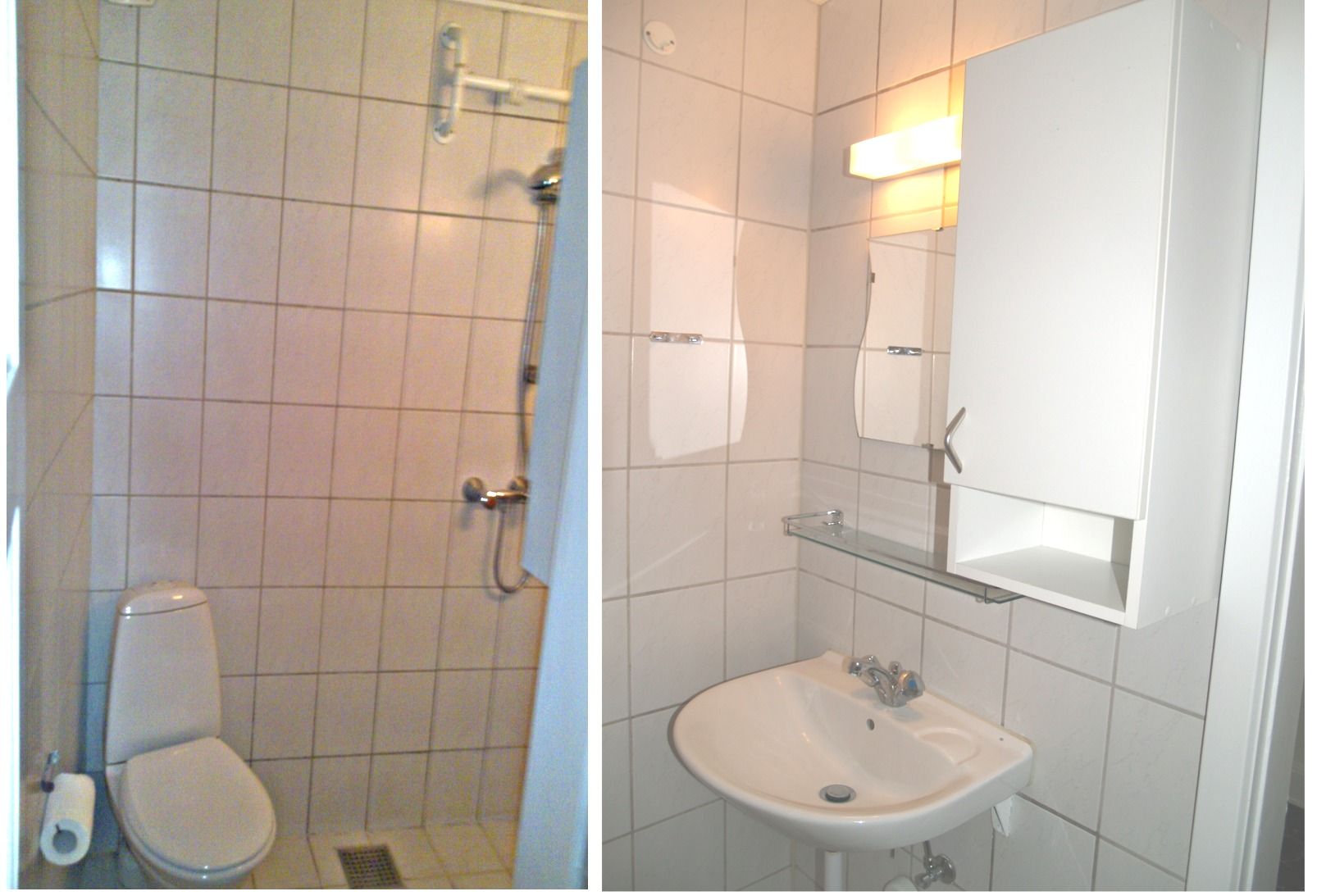 - Badeværelse med lyse fliser, samt soveværelse og stue.