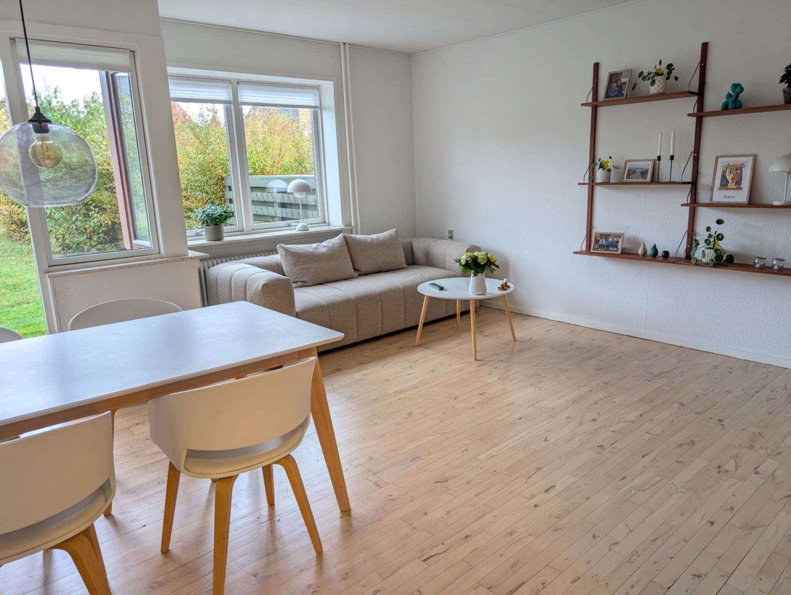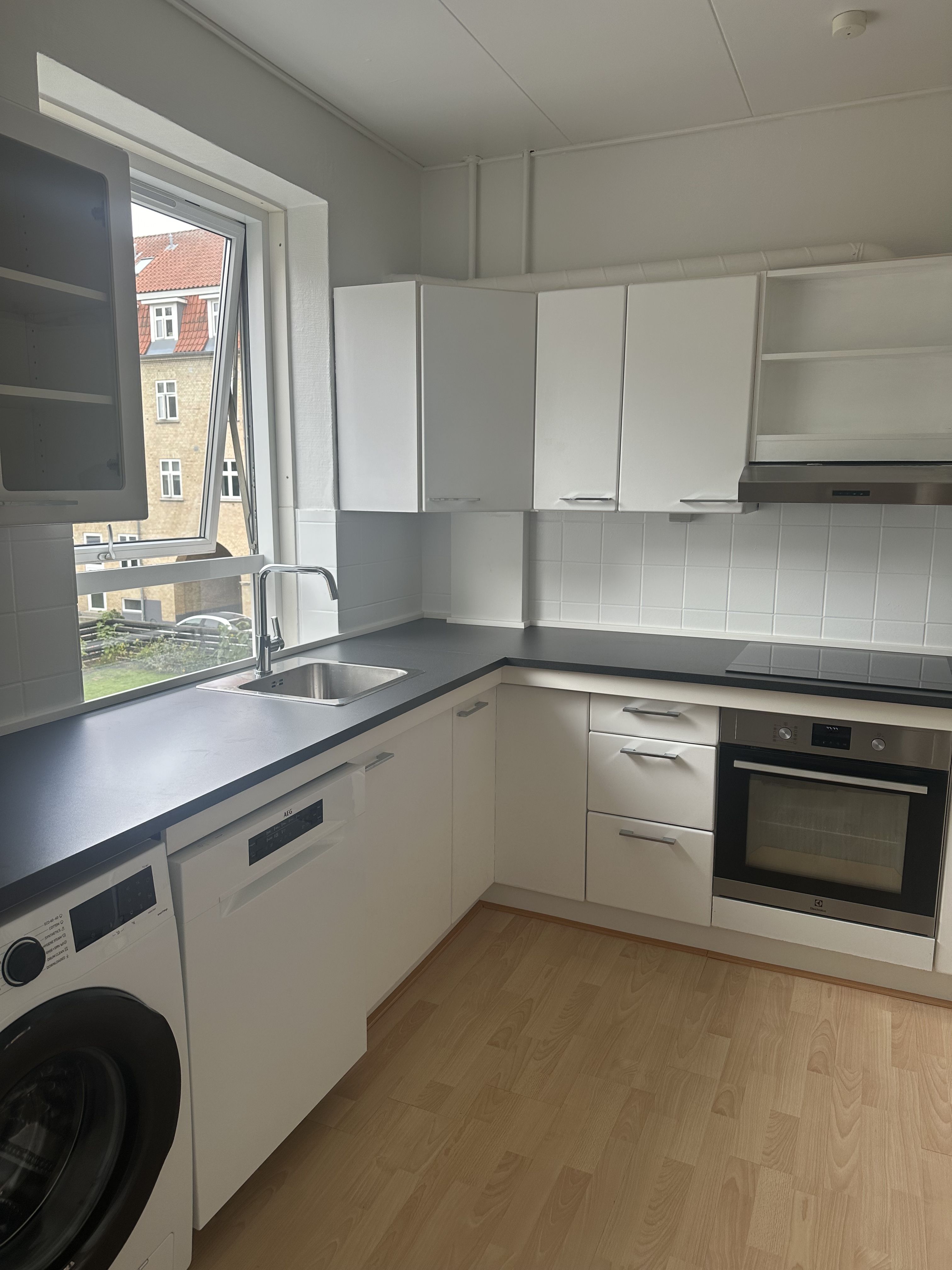 Stuen fremstår lys og rummelig med sin rektangulære form, der gør den nem at indrette. Herfra er der direkte udgang til en hyggelig terrasse – et skønt uderum til afslapning og hyggelige stunder. Køkkenet ligger i forlængelse af stuen og fremstår moderne og lyst med hvide elementer, opvaskemaskine og gode opbevaringsmuligheder.