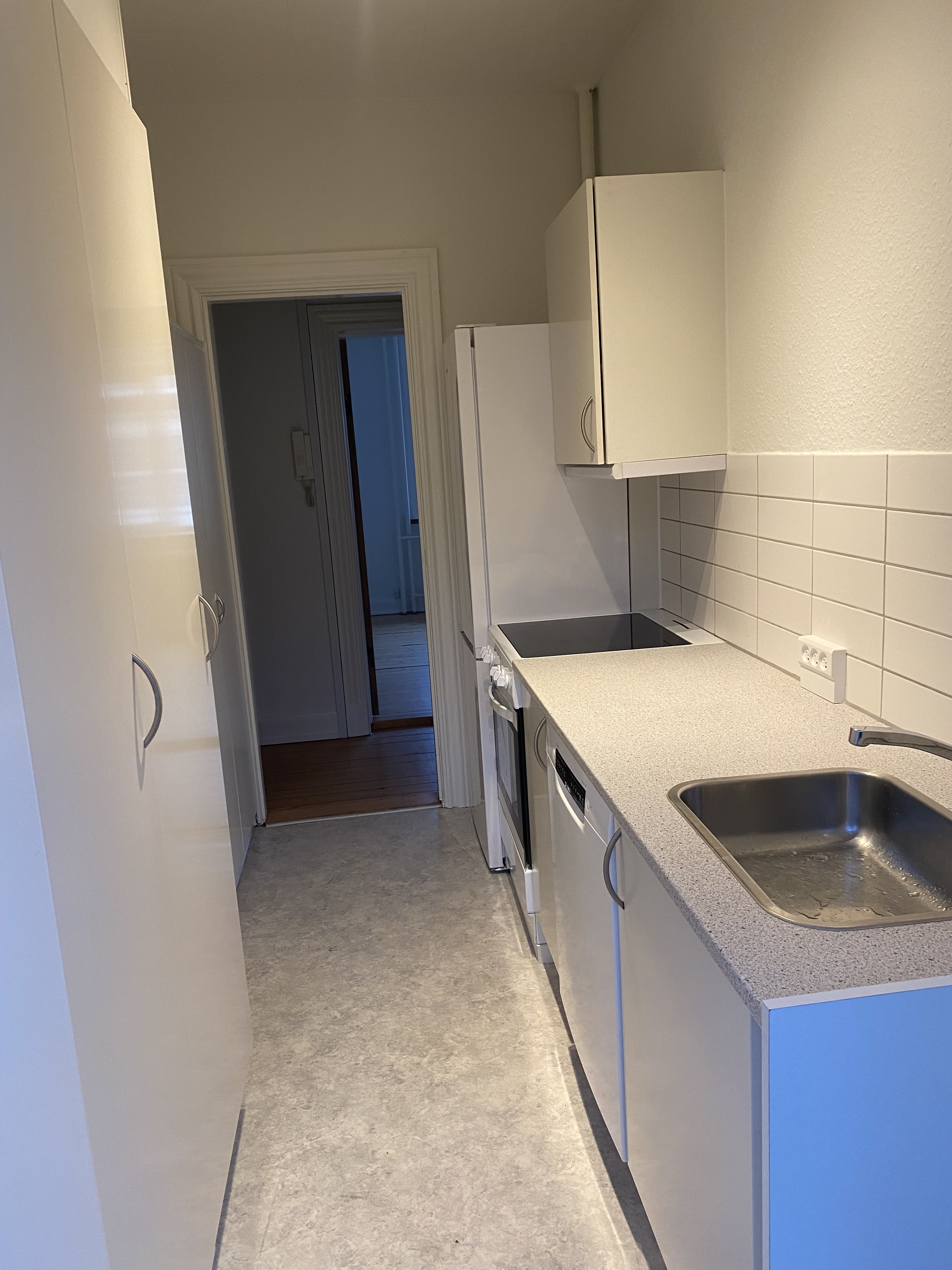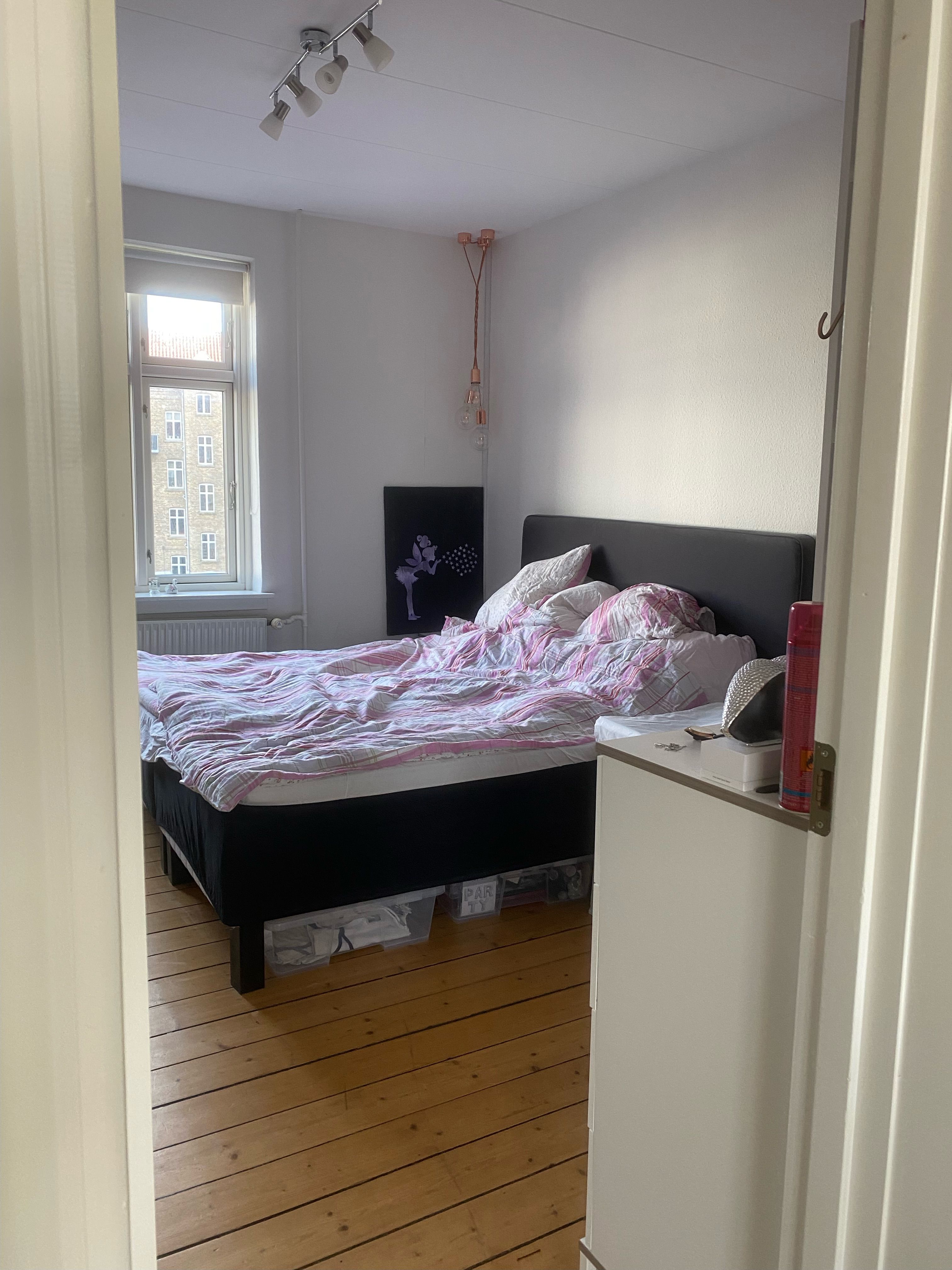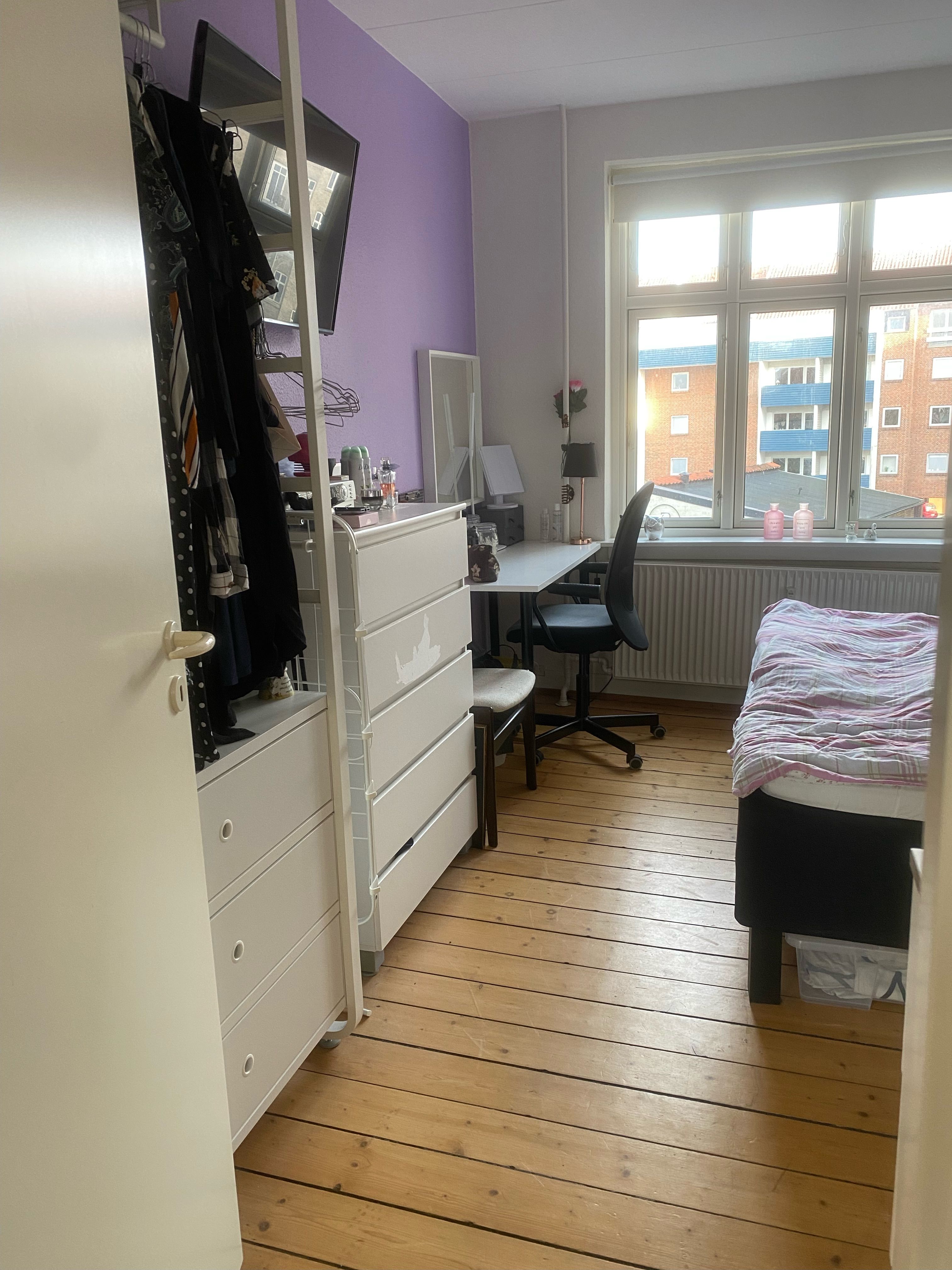 Fra entréen er der adgang til lejlighedens soveværelse, der har indbygget skab og plads til en stor seng – et perfekt rum til ro og afslapning. For enden af entréen finder du det rummelige badeværelse, hvor der er gjort klar til installation af vaskemaskine, hvilket giver ekstra bekvemmelighed i hverdagen.