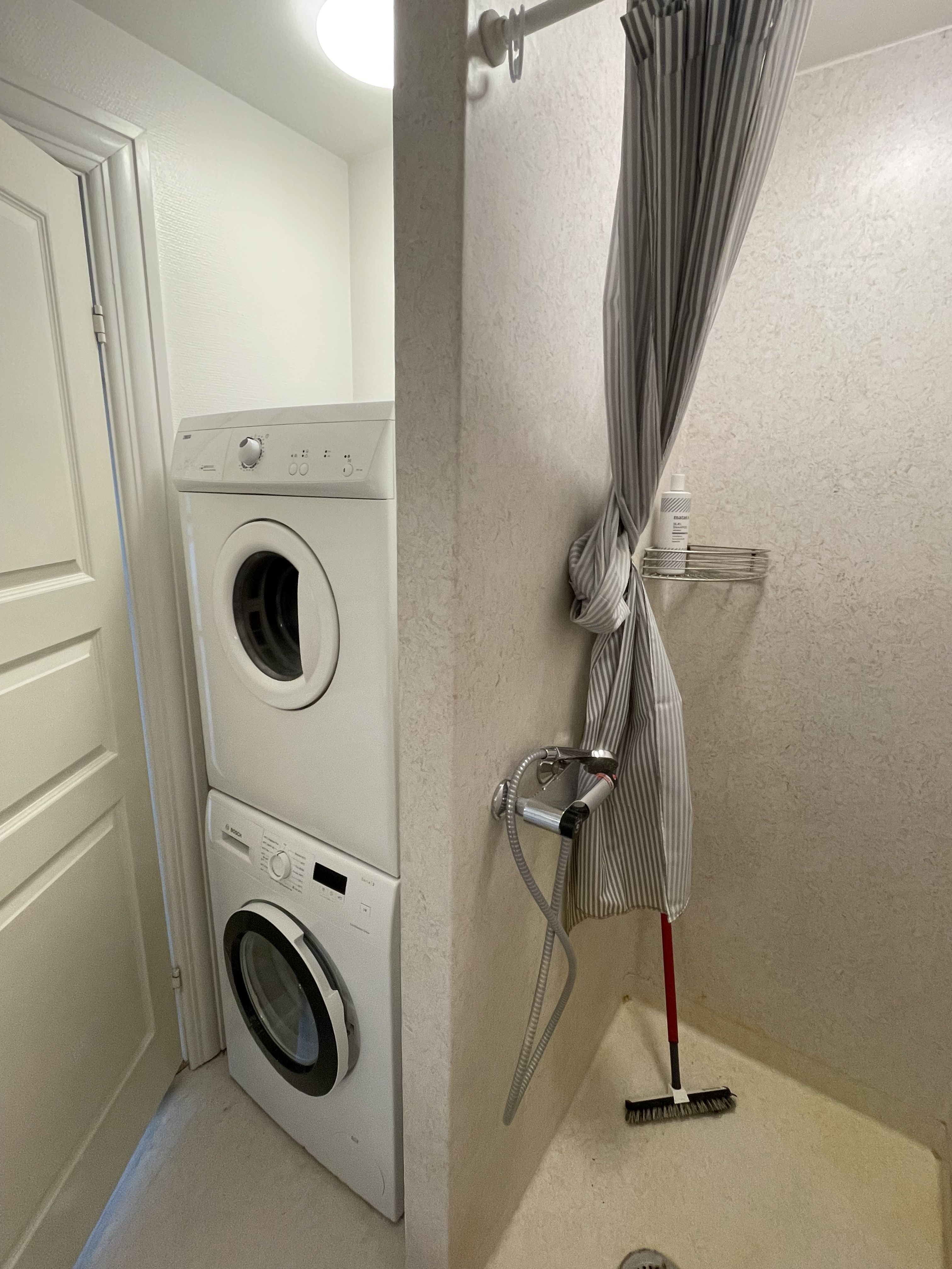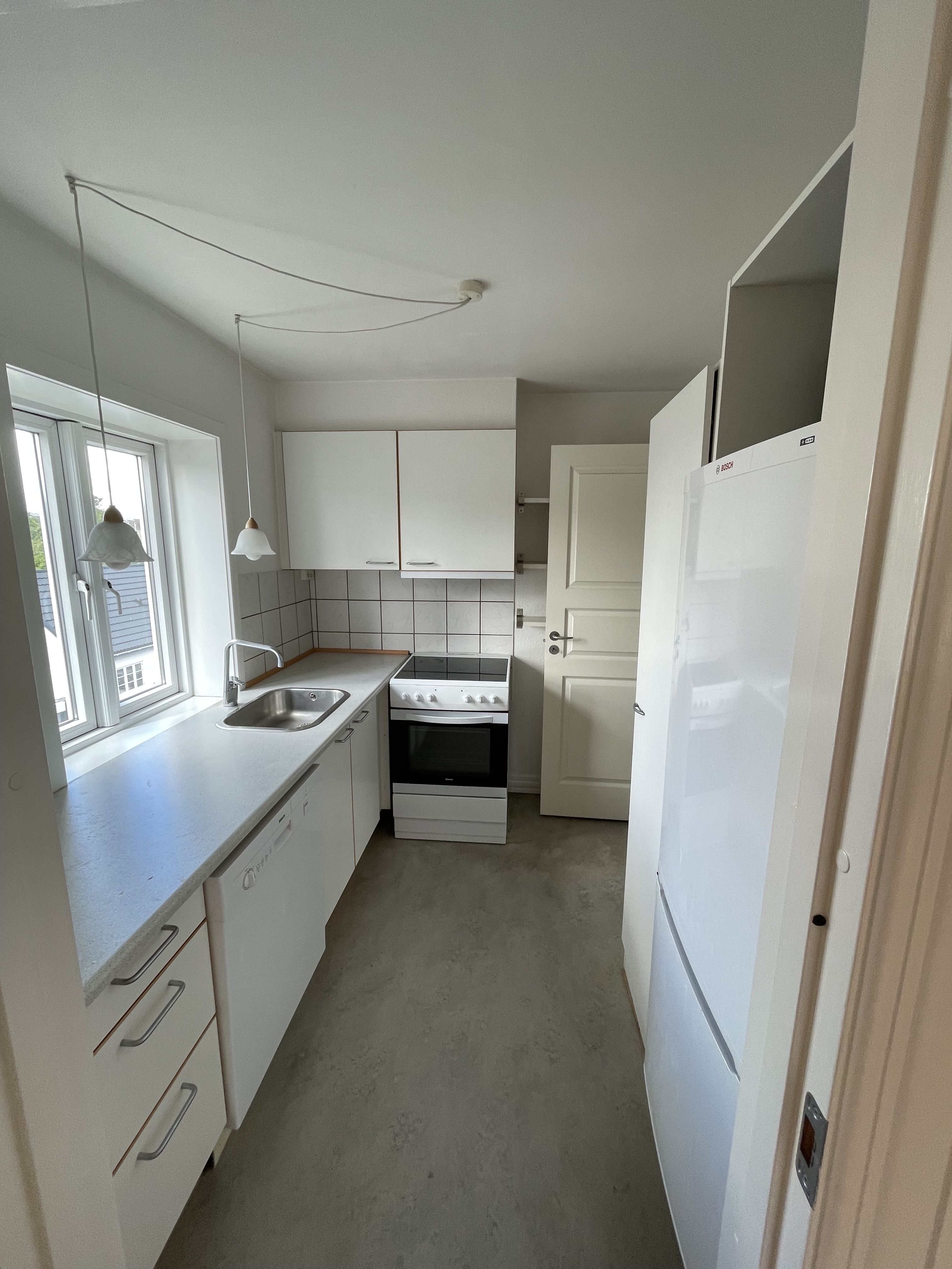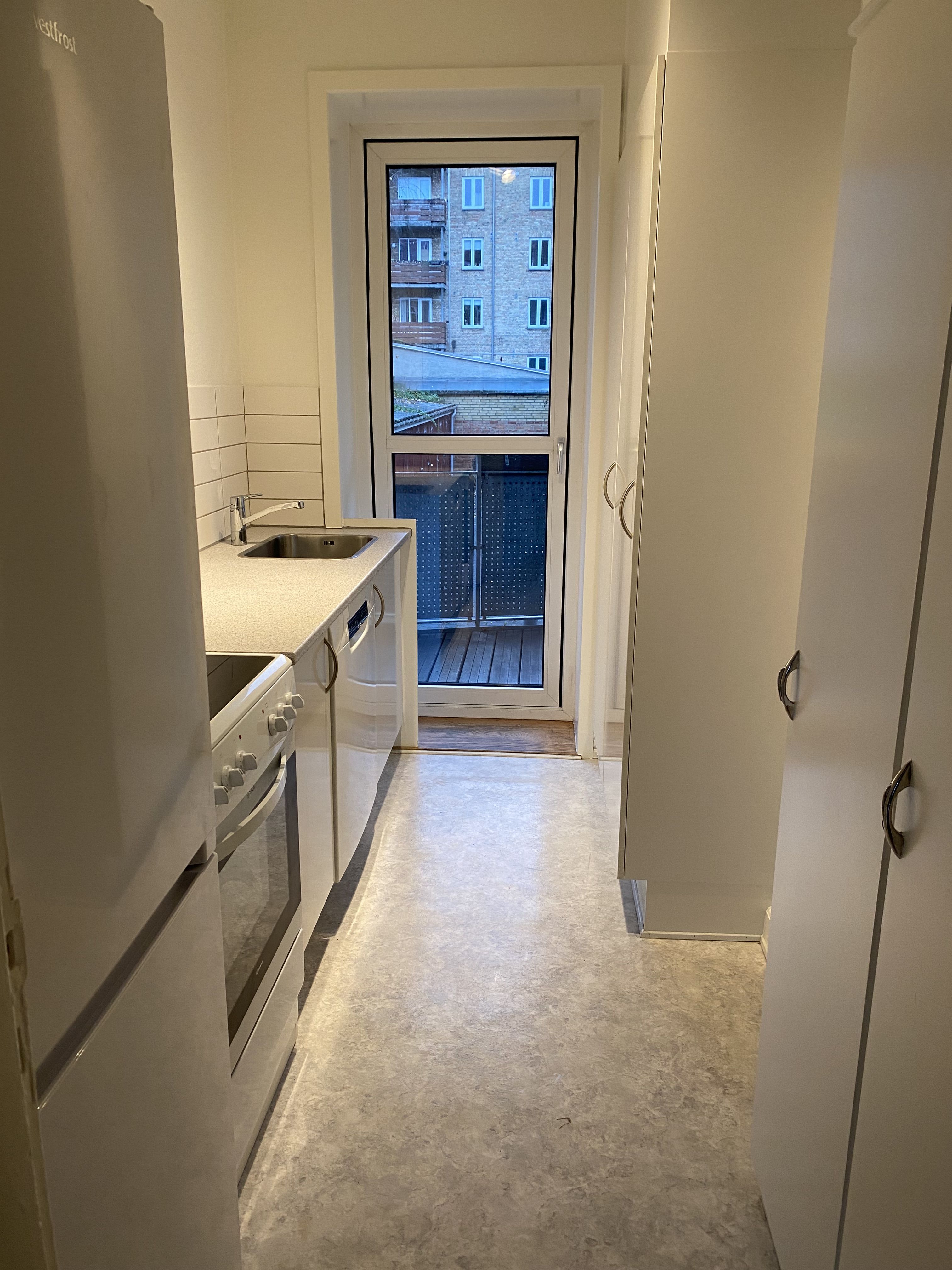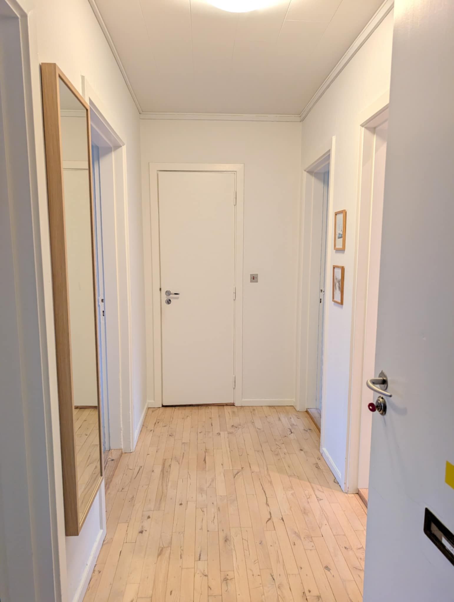 Fra entréen er der adgang til lejlighedens soveværelse, der har indbygget skab og plads til en stor seng – et perfekt rum til ro og afslapning. For enden af entréen finder du det rummelige badeværelse, hvor der er gjort klar til installation af vaskemaskine, hvilket giver ekstra bekvemmelighed i hverdagen.