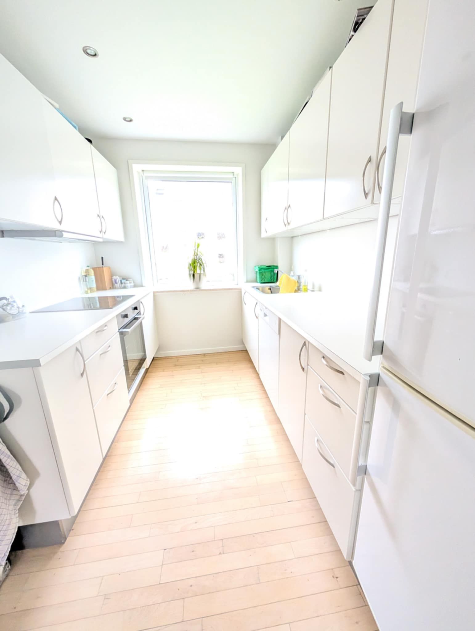 Lejligheden er gennemgående belagt med flotte laminattrægulve, der skaber en sammenhængende og indbydende atmosfære.