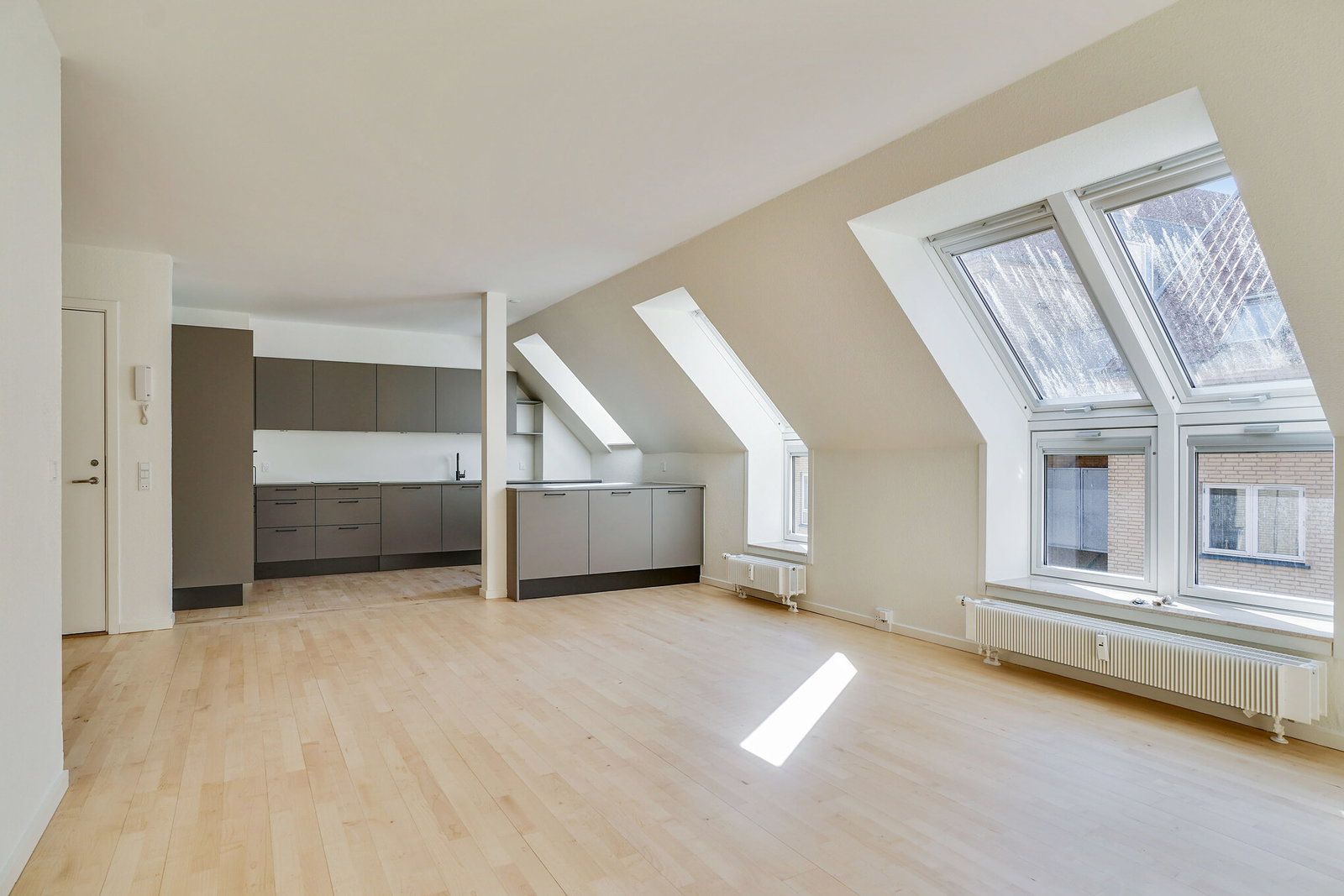 Uanset hvilken størrelse lejlighed du vælger, vil boligens hjerte være det store køkken alrum og stue samlet i ét. Rummet har et fantastisk lysindfald fra begge sider. De attraktive lejeboliger i Aalborg midtby er indrettet i nordisk stil med hvidmalede betonvægge og flotte trægulve, hvor du nemt kan sætte dit eget personlige indretningsmæssige præg på boligen.