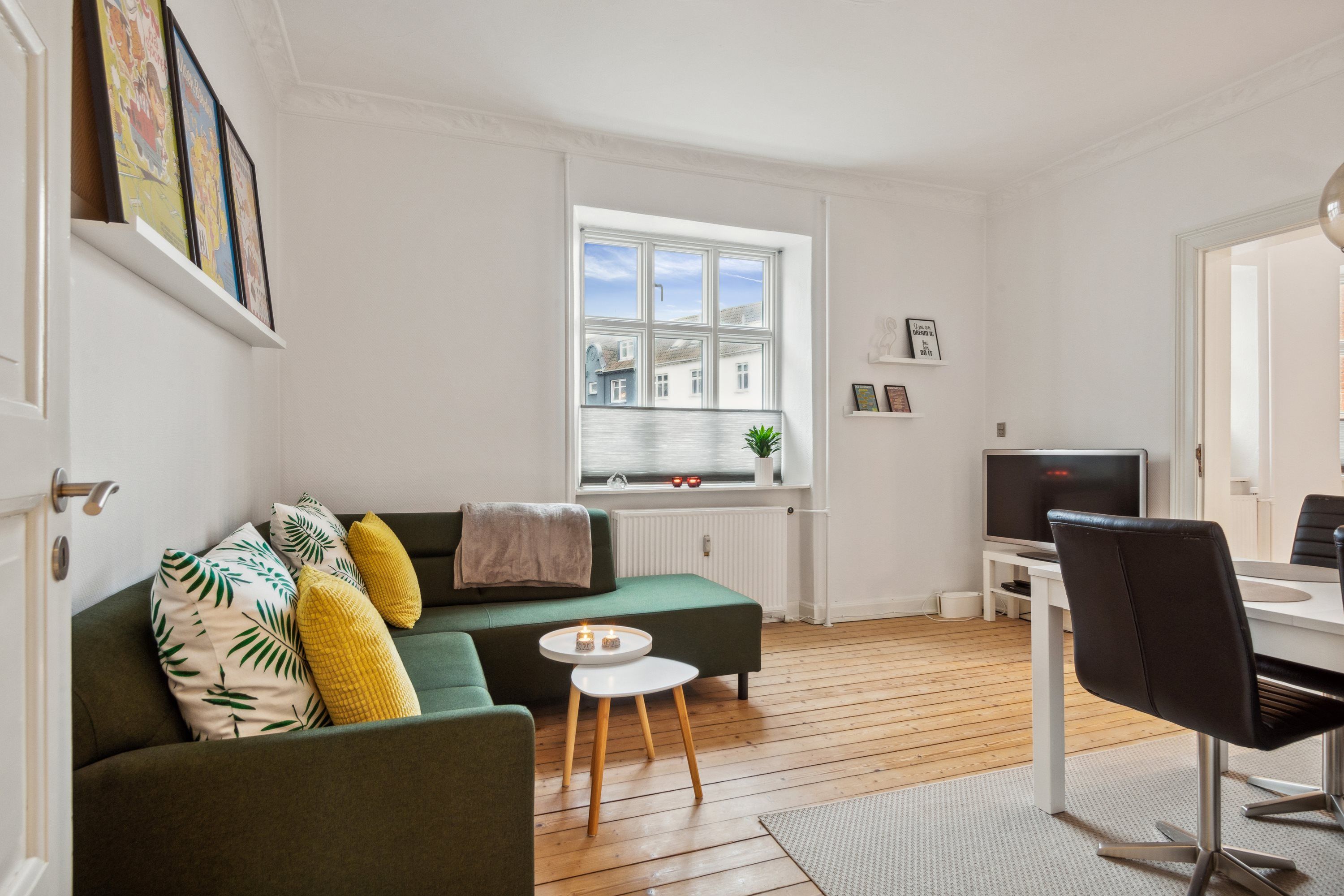 Lejligheden har et store vinduespartier, som vender mod syd og fjorden. Der er et skønt lysindfald og man er fri for indkig fra naboer og forbipasserende.