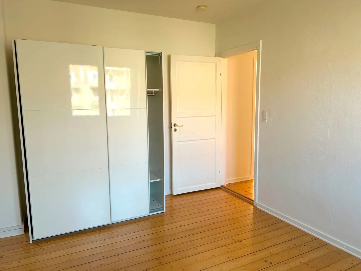 Lejligheden har et stort soveværelse med rummeligt skab med store skydelåger.