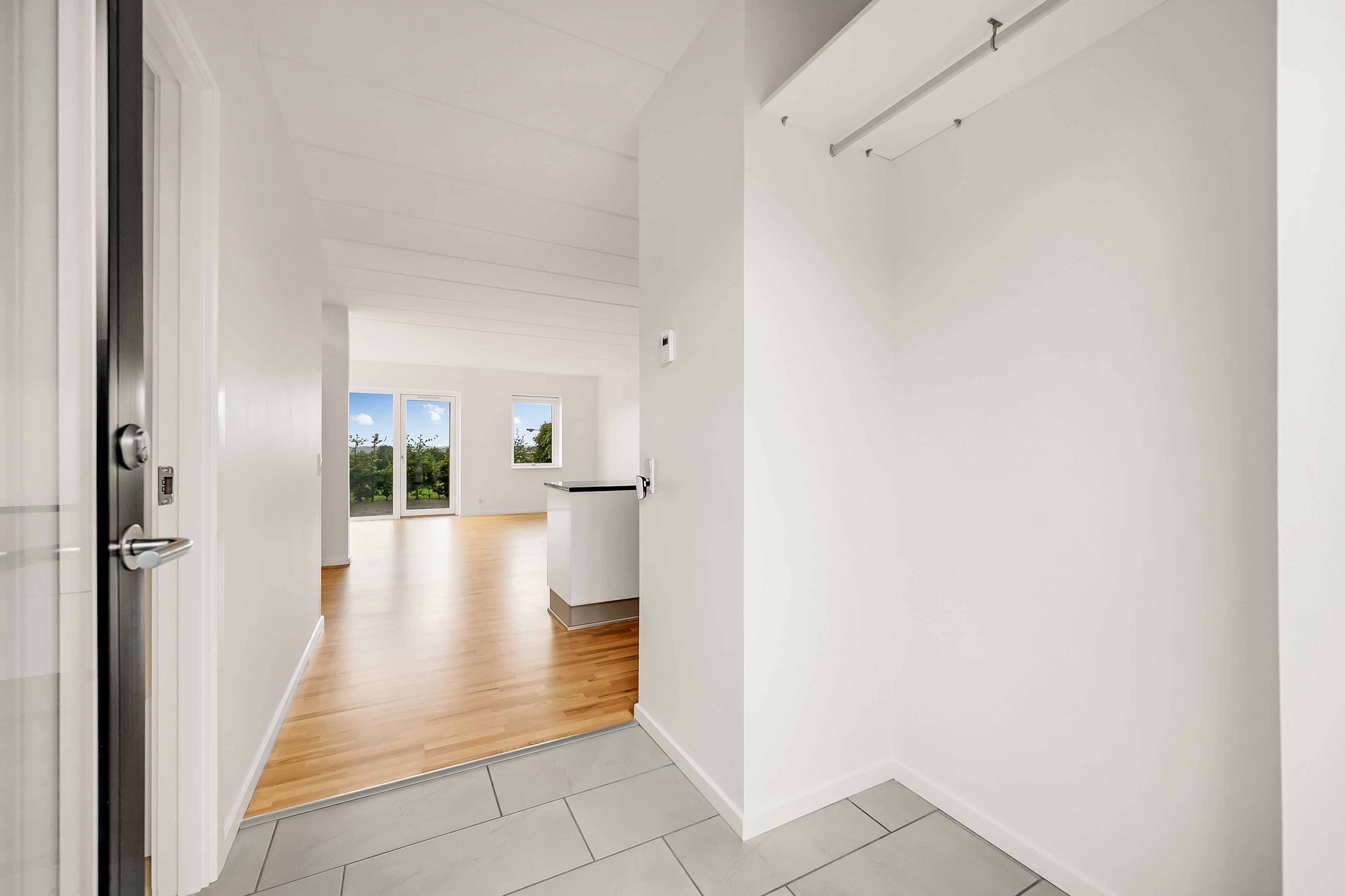 Stor lys entre med masser af skabsplads og adgang til stue fra flot glas dobbelt dør til altan ud mod gaden.