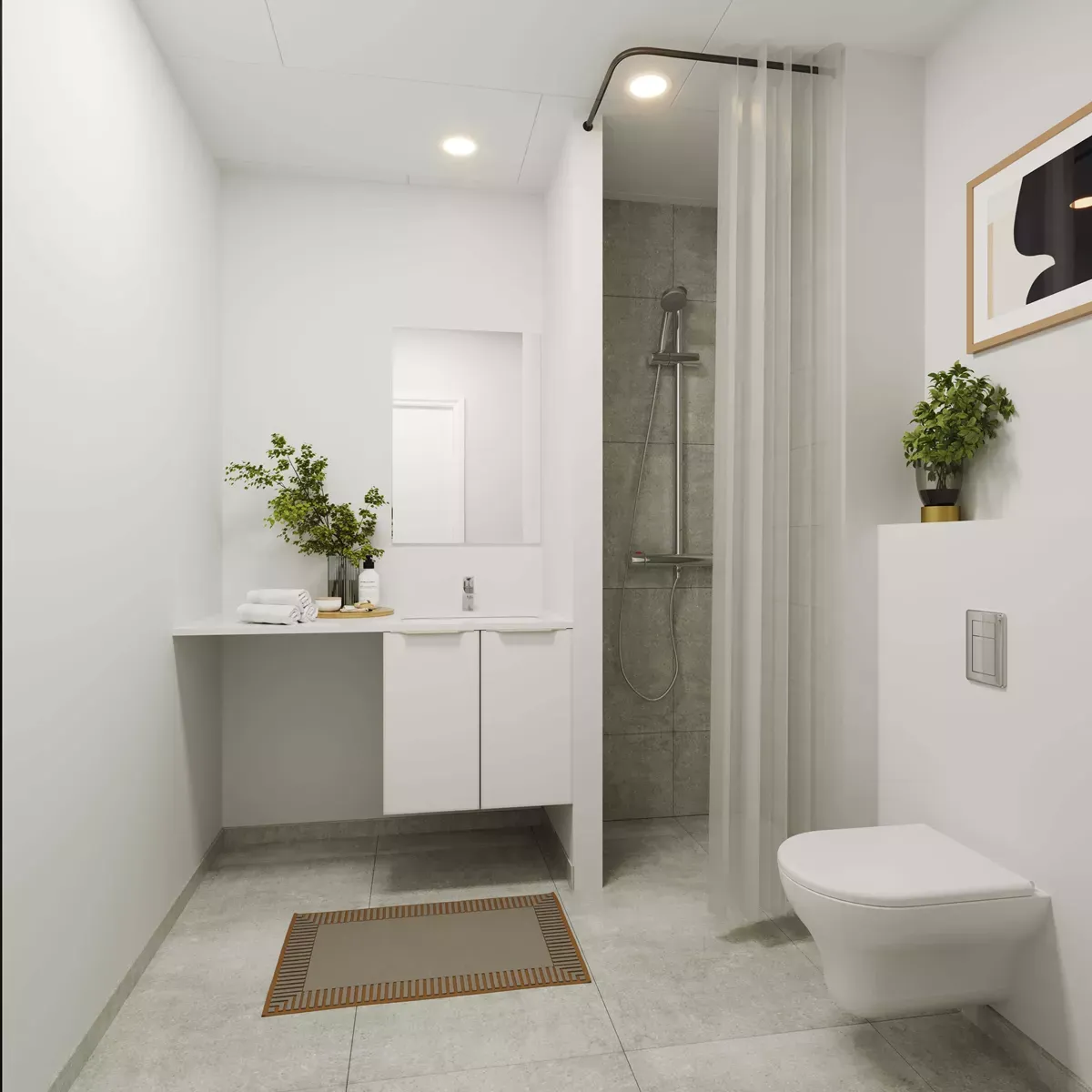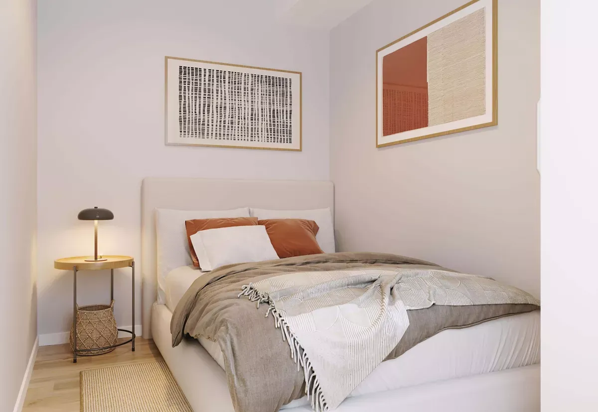 The open floor plan combines the kitchen and living room in a bright and stylish environment. The smart bed functions as both a sofa and a sleeping area, and plenty of storage space has been incorporated. In addition, the apartment offers a practical flex desk. The bathroom is modern and bright with a separate shower.