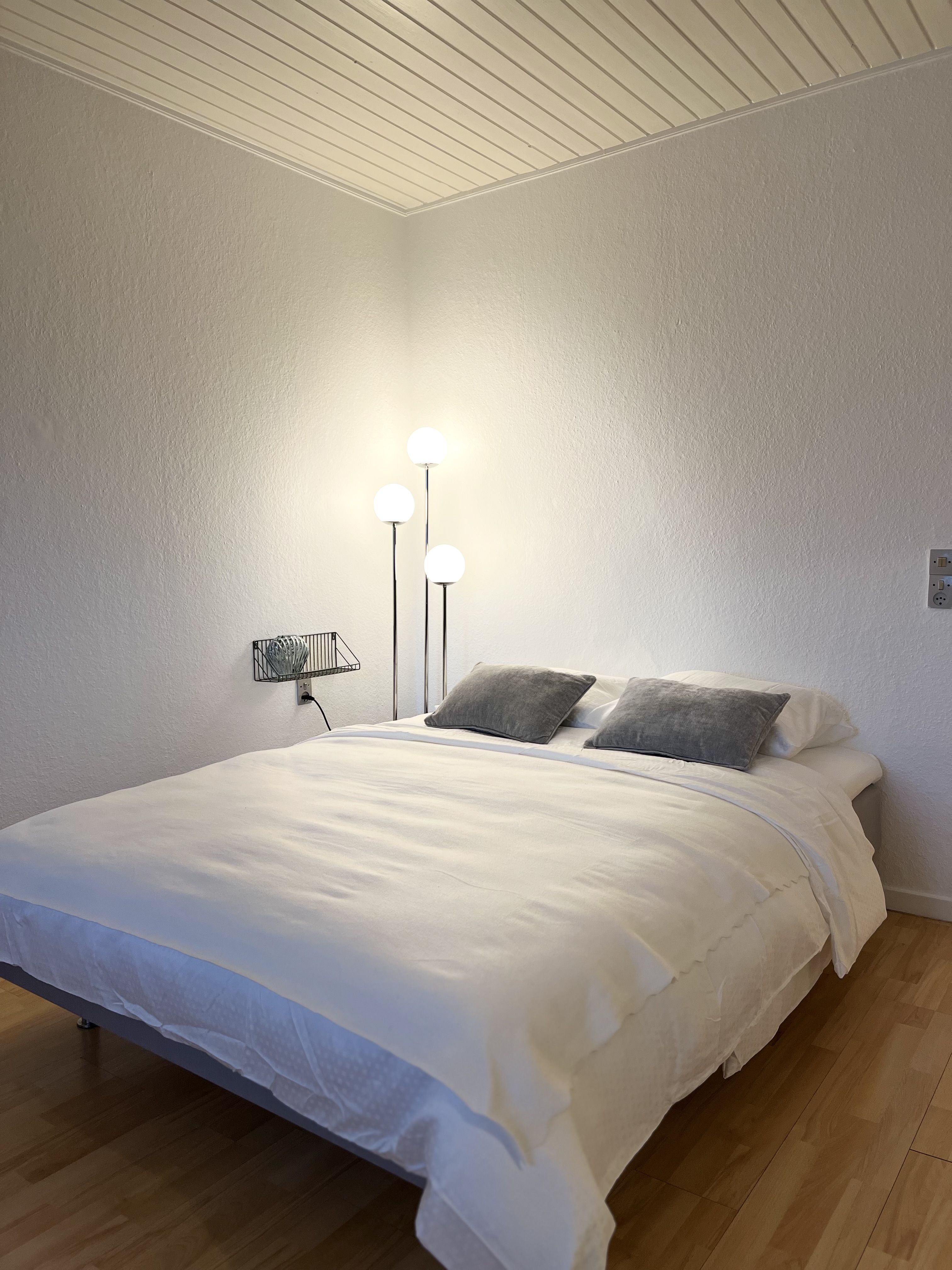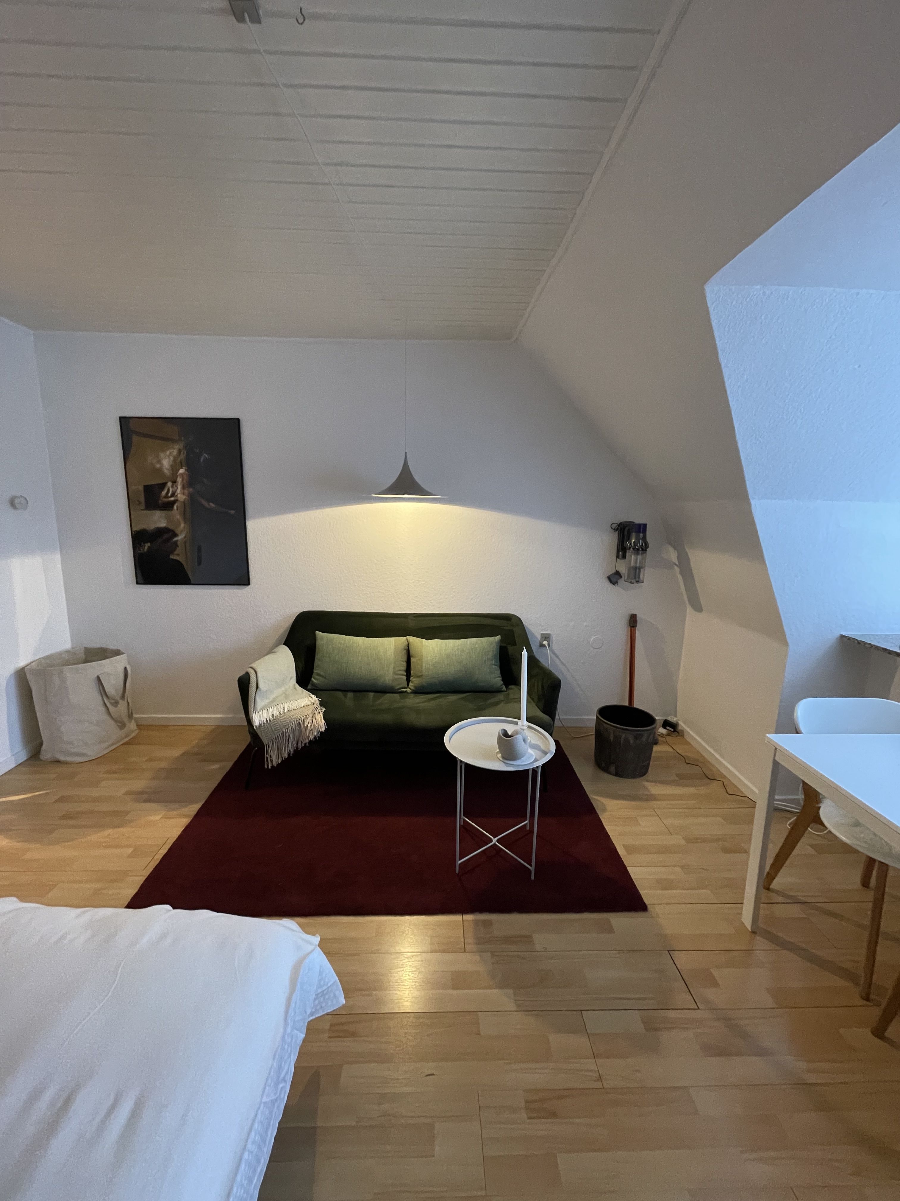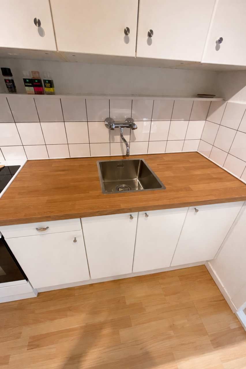 Man kommer ind i en entré-lignende gang med et indbygget skab. Entreén munder direkte ud i det store værelse, hvor der er plads til både seng, skrivebord og spisekrog. Køkkenet er placeret i hjørnet af det store rum.