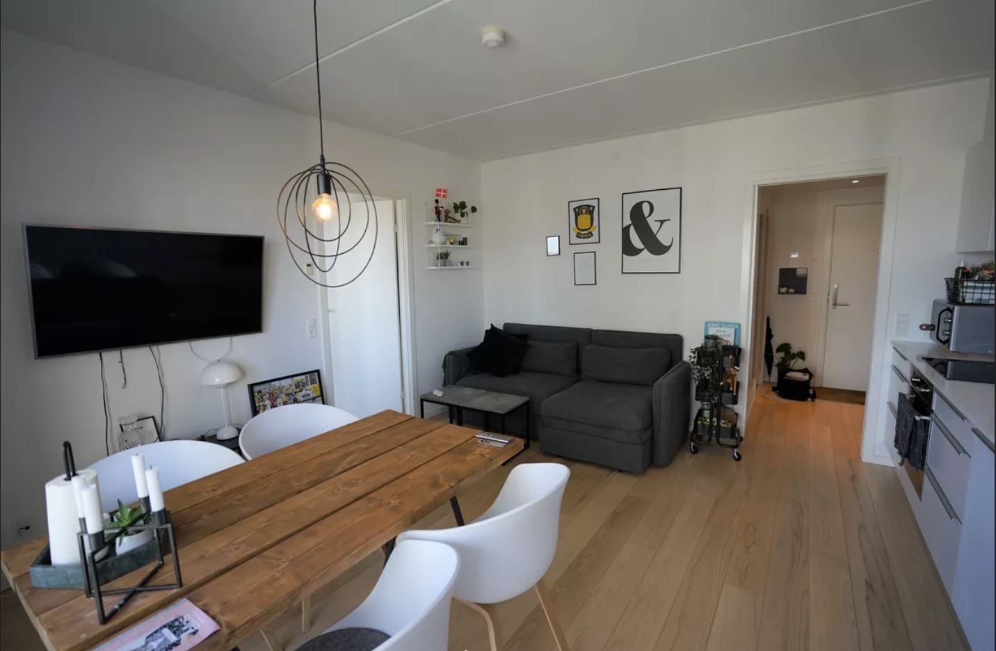 At the entrance a small entryway has room for outerwear and shoes. From the entryway there is access to the living room and kitchen. The living room is furnished with a couch and armchair, a dining table for 4, and a flatscreen TV.
