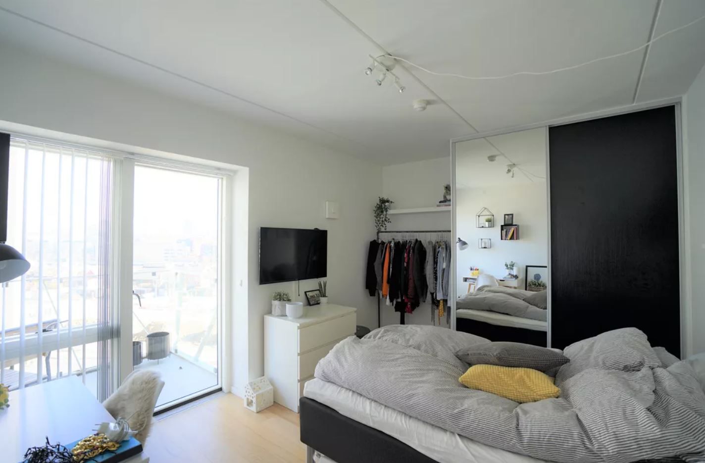 The bedroom is furnished with 2 single beds, nightstand and closet. Here you will also find a desk placed in front of the bedroom window, with a view of the green areas around the building. The bathroom has white tiles, vinyl floors and a shower. The property has a nice garden, with several terraces. The property has a common launderette for the apartments. The rent is incl. electricity, water, heating and internet.