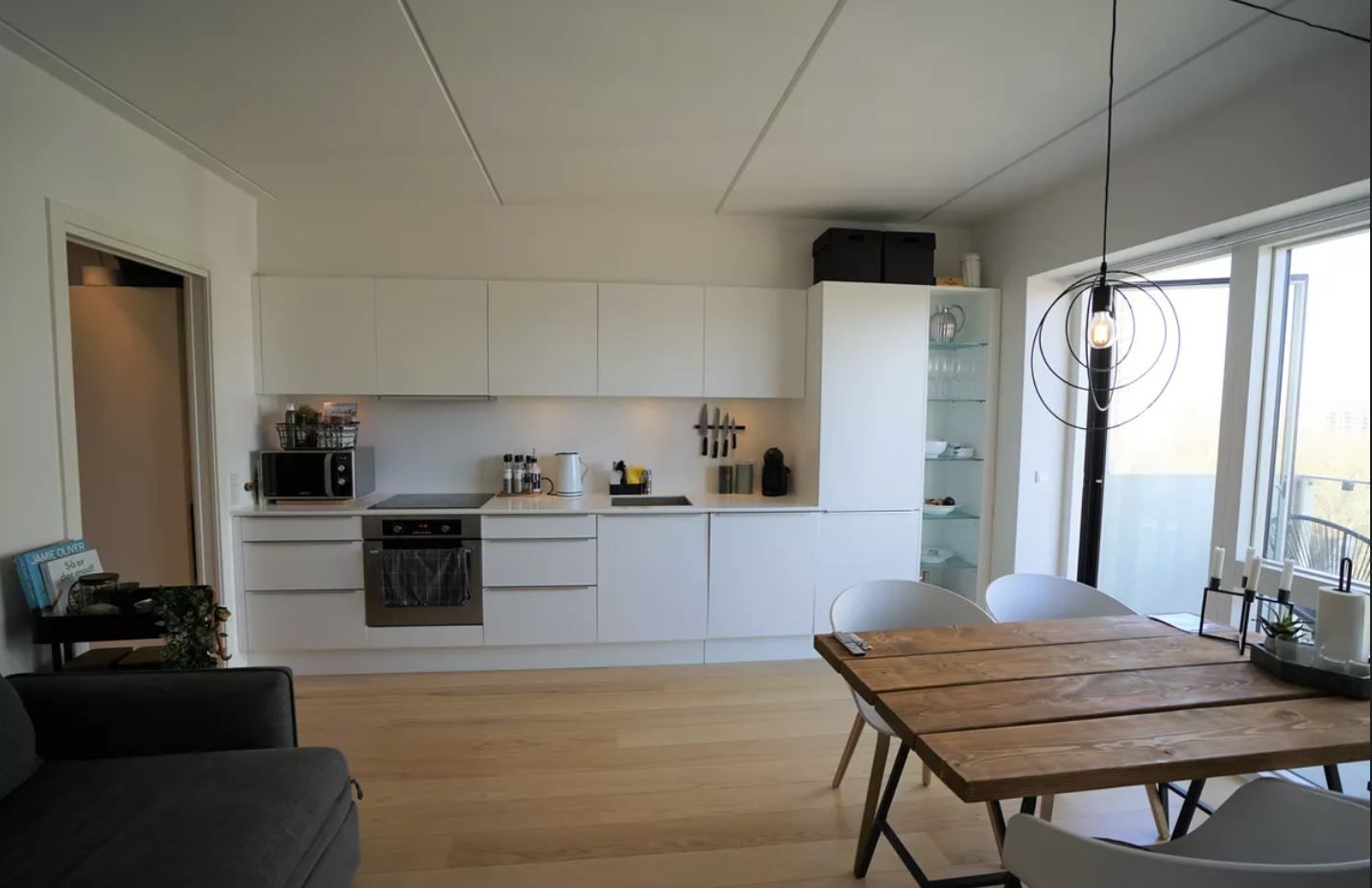A French balcony creates a light and welcoming atmosphere in the room. The living room and kitchen are divided by a half wall, and the light kitchen is furnished with white cupboards and tiles above the kitchen counter. The kitchen is fitted with fridge-freezer, stove, microwave oven, and a dishwasher.