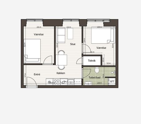 En veludnyttet 2-værelses lejlighed. Boligen har entré i forbindelse med en lys stue og et åbent, linjeformet køkken med integrerede hvidevarer. Soveværelset har plads til en dobbeltseng og opbevaring. Badeværelset indeholder seperat bruseniche og vaskemaskine/tørretumbler. En praktisk og moderne bolig med enkel planløsning. 🏠 SideBySide – et moderne hjem i Viby Mere kant til Viby SideBySide er en del af den forandring, der lige nu løfter Vibys bymidte. Flere flytter til, nye butikker åbner, og et tidligere overset område får ny energi uden at miste den kant, der gør Viby til Viby. Her får du en bolig, der både giver ro og nærhed til byens liv. Den grønne, hævede have binder ejendommene sammen og giver et stille frirum midt i byen, mens tagterrasserne åbner op med udsigt til Aarhus i horisonten. En veltænkt oase for dig, der vil have høj boligkvalitet og bo tæt på det hele. Side om side med byens liv. SideBySide tilbyder helt nye lejeboliger midt i Viby, designet med moderne komfort og funktionalitet i fokus. Boligerne har lyst køkken-alrum, flotte gulve og indretning, der gør det nemt at falde til — uanset om du bor alene, som par, som familie eller med venner. - Nybygget lejlighed i høj kvalitet - 1-4 værelser - 42-85 m2 - Moderne badeværelse med vaskesøjle af mærket Siemens - Åbent alrum med køkken fra Invita i støvgrå farve og hårdehvidevarer fra Siemens - Udvalgte lejligheder har privat altan med udsigt til gårdhave. 🌳 Fællesområder & faciliteter SideBySide tilbyder mere end bare en bolig. Der er planlagt grønne fællesområder — blandt andet en gårdhave, tagterrasser med orangeri og faciliteter til udendørs træning. Derudover kommer der en Lidl i stueetagen, hvilket gør dagligvareindkøb praktisk og tæt på hjemmet. 🚲 Beliggenhed & transport SideBySide ligger centralt i Viby, med god adgang til offentlig transport og byens faciliteter — det giver dig fleksibilitet i hverdagen. Letbanen ligger tæt på, flere buslinjer stopper lige i nærheden, og du kan cykle til Aarhus C på kun et kvarter. Placeringen giver dig frihed til hurtigt at komme til og fra byen – uanset om du skal på arbejde, til studie eller ud i det aarhusianske byliv. Området Viby kombinerer byens bekvemmeligheder med grønne områder og mere roligere rammer.