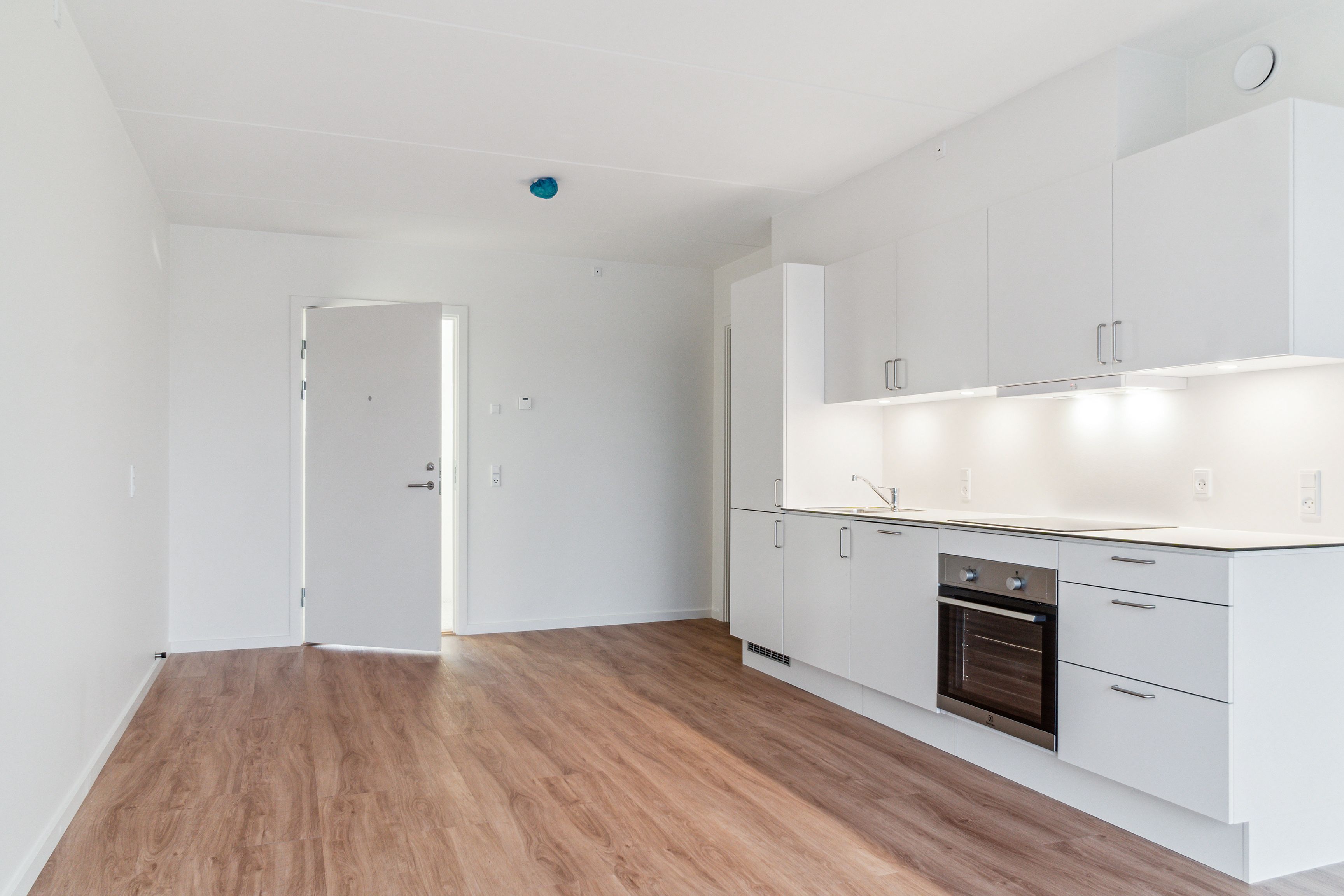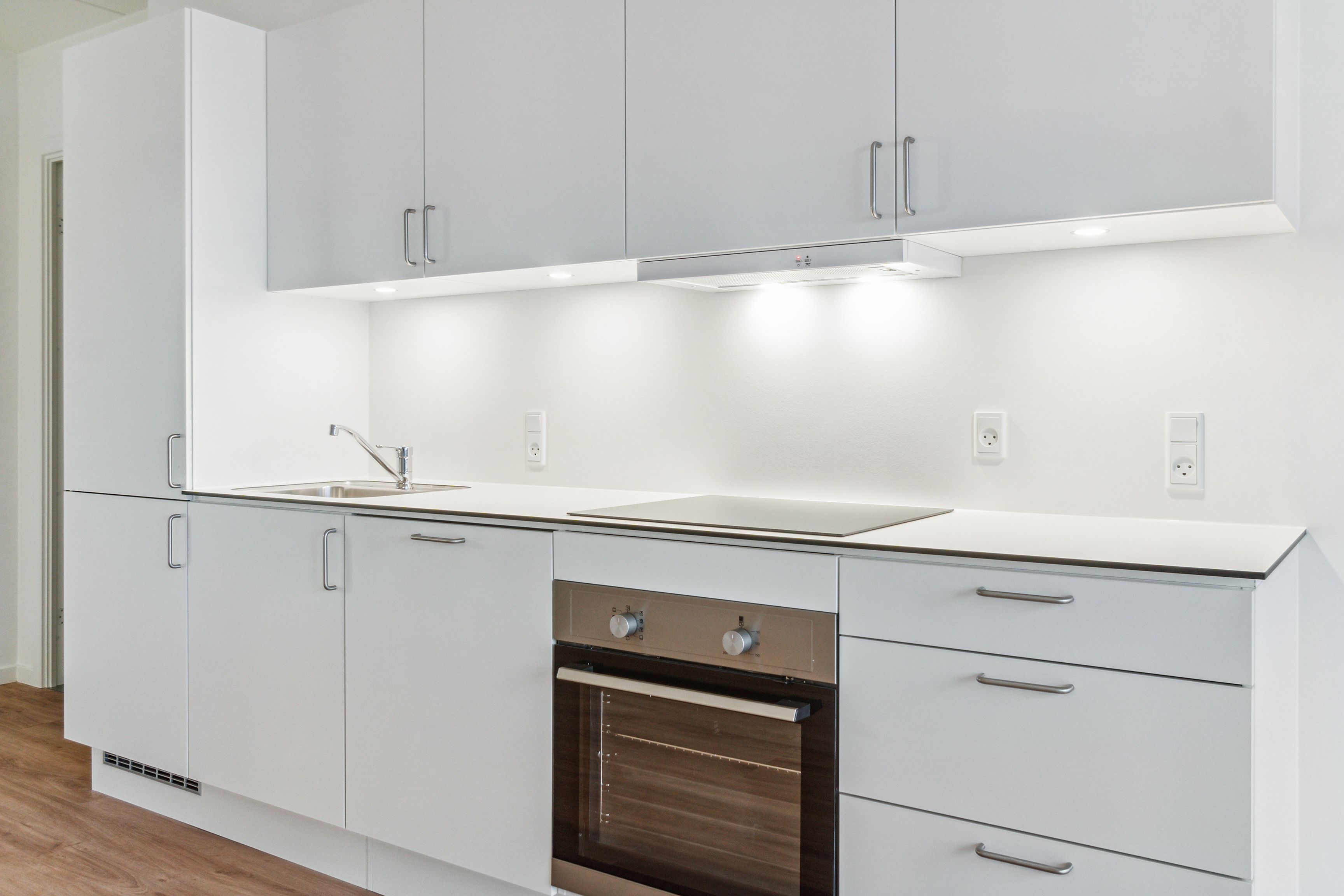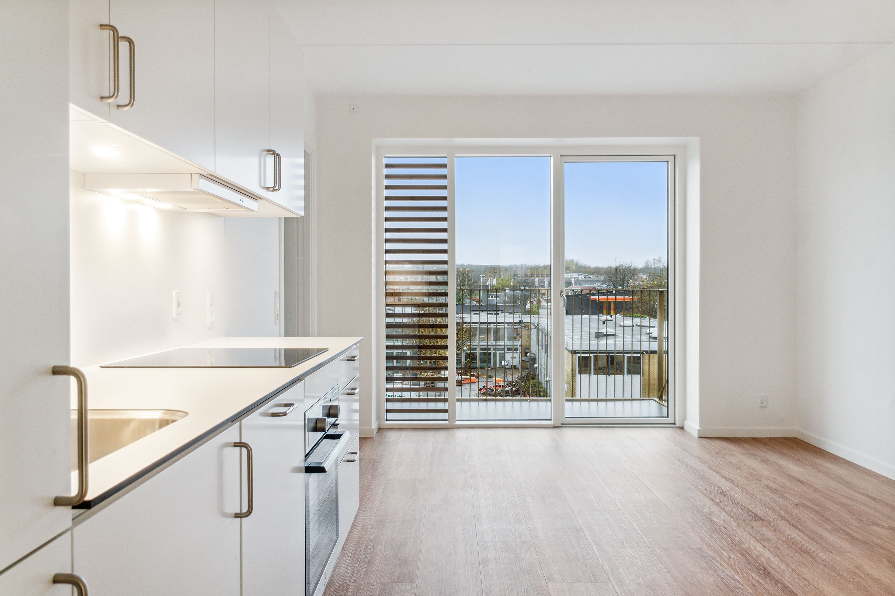 - Et lyst og åbent køkken-alrum med Svane køkken og alt i hårde hvidevarer.
