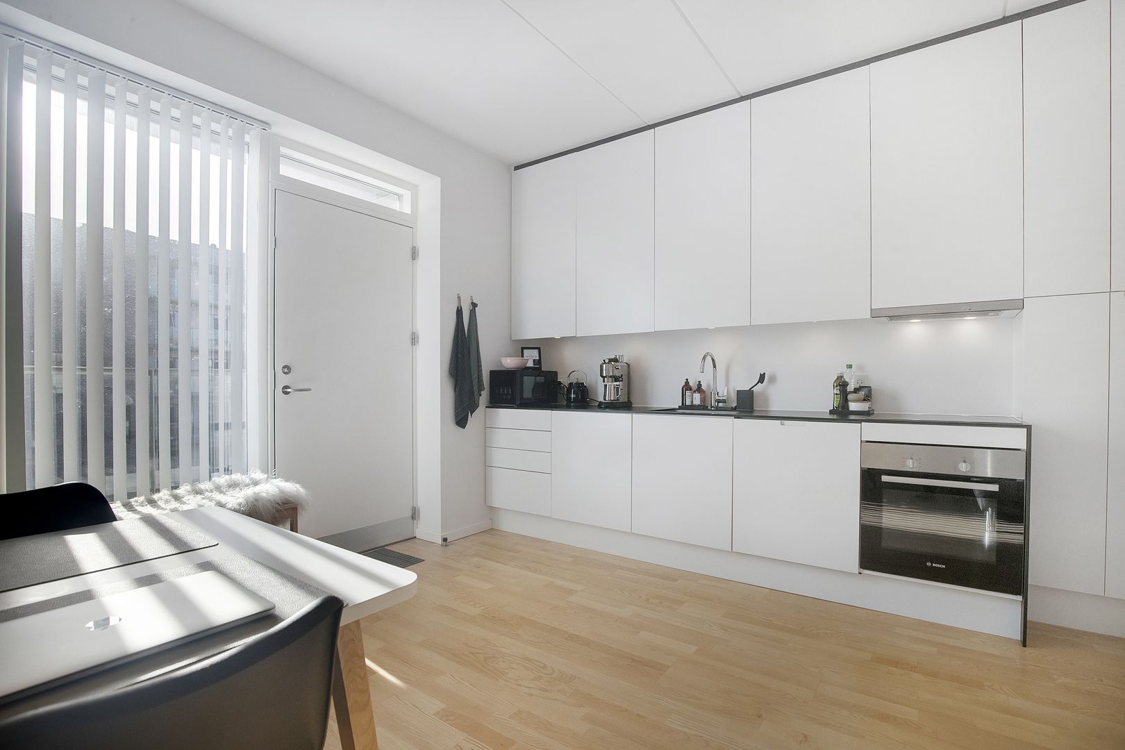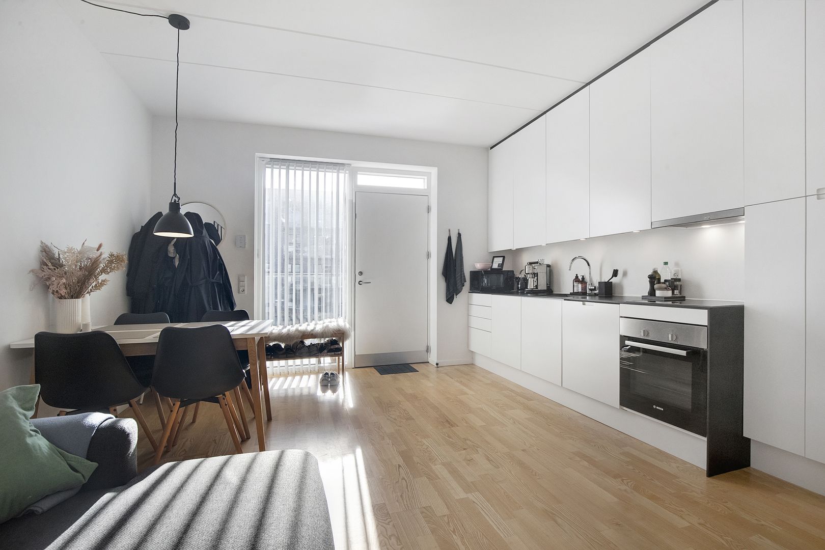 Køkkenet er fra Byg & Design og fremstår stilfuldt med sorte flader, hvide grebsfrie fronter og alt, hvad du drømmer om i hårde hvidevarer. Badeværelset er holdt i samme stil med hvide vægge, sorte klinker på gulvet, gulvvarme og både tørretumbler og vaskemaskine.