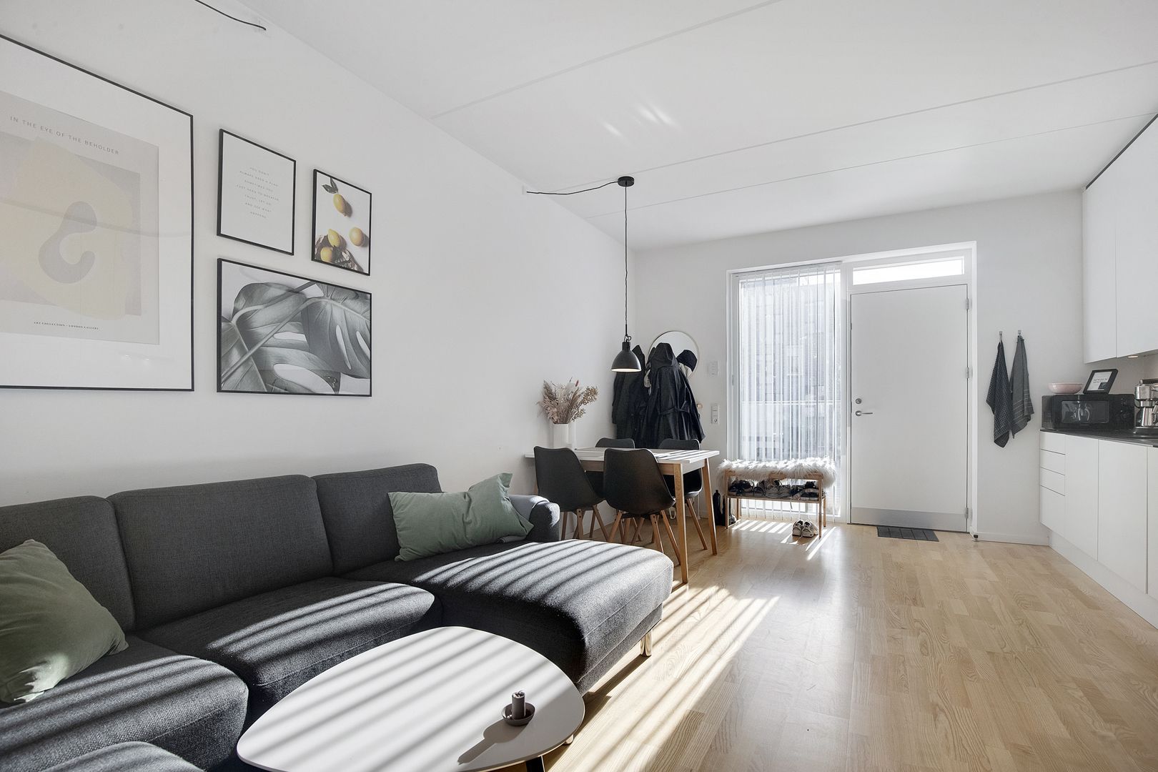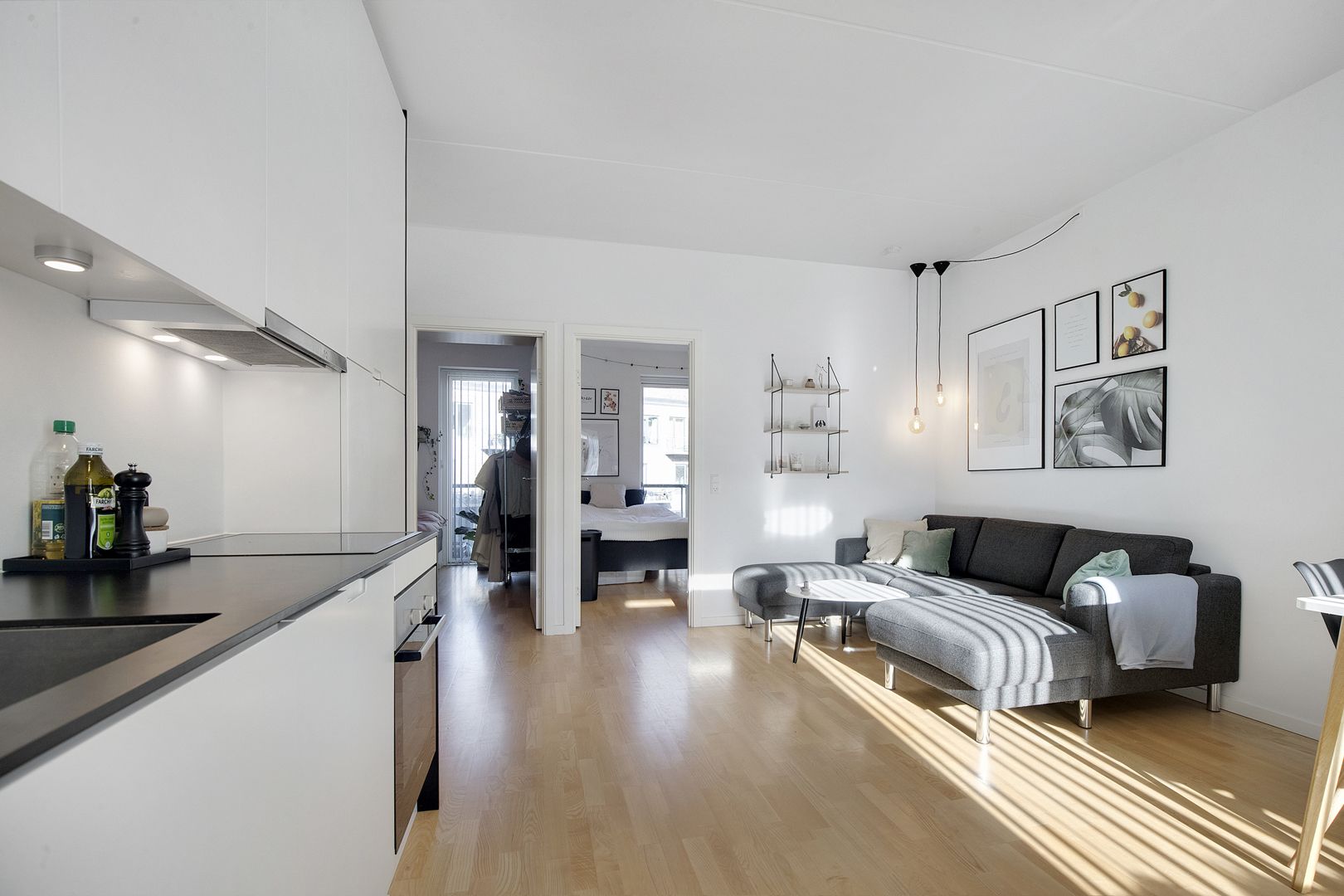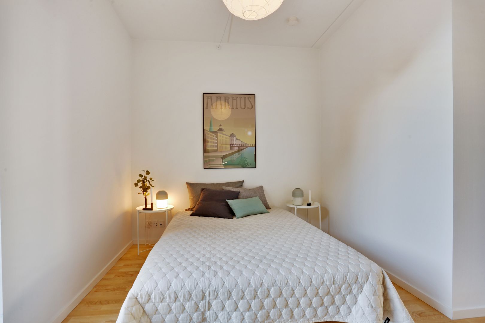 Lejligheden er indrettet i en moderne skandinavisk stil med lyse parketgulve samt hvide vægge og lofter, så du nemt kan sætte dit eget personlige præg på indretningen. Derudover er der tænkt kreativt for at udnytte pladsen bedst muligt. Værelserne har skabe fra gulv til loft, og i køkkenet går overskabene helt til loftet, så du har ekstra opbevaringsplads.