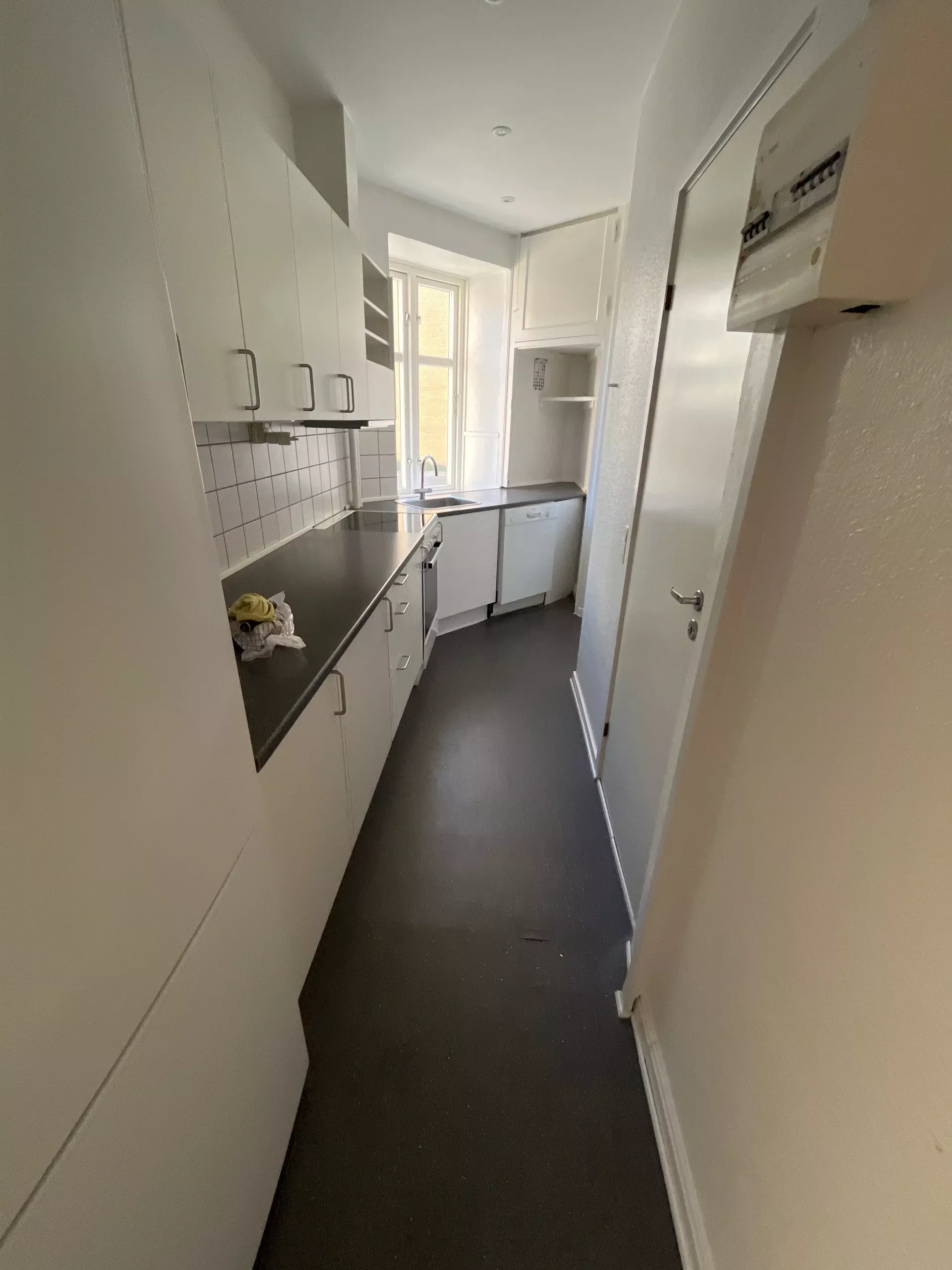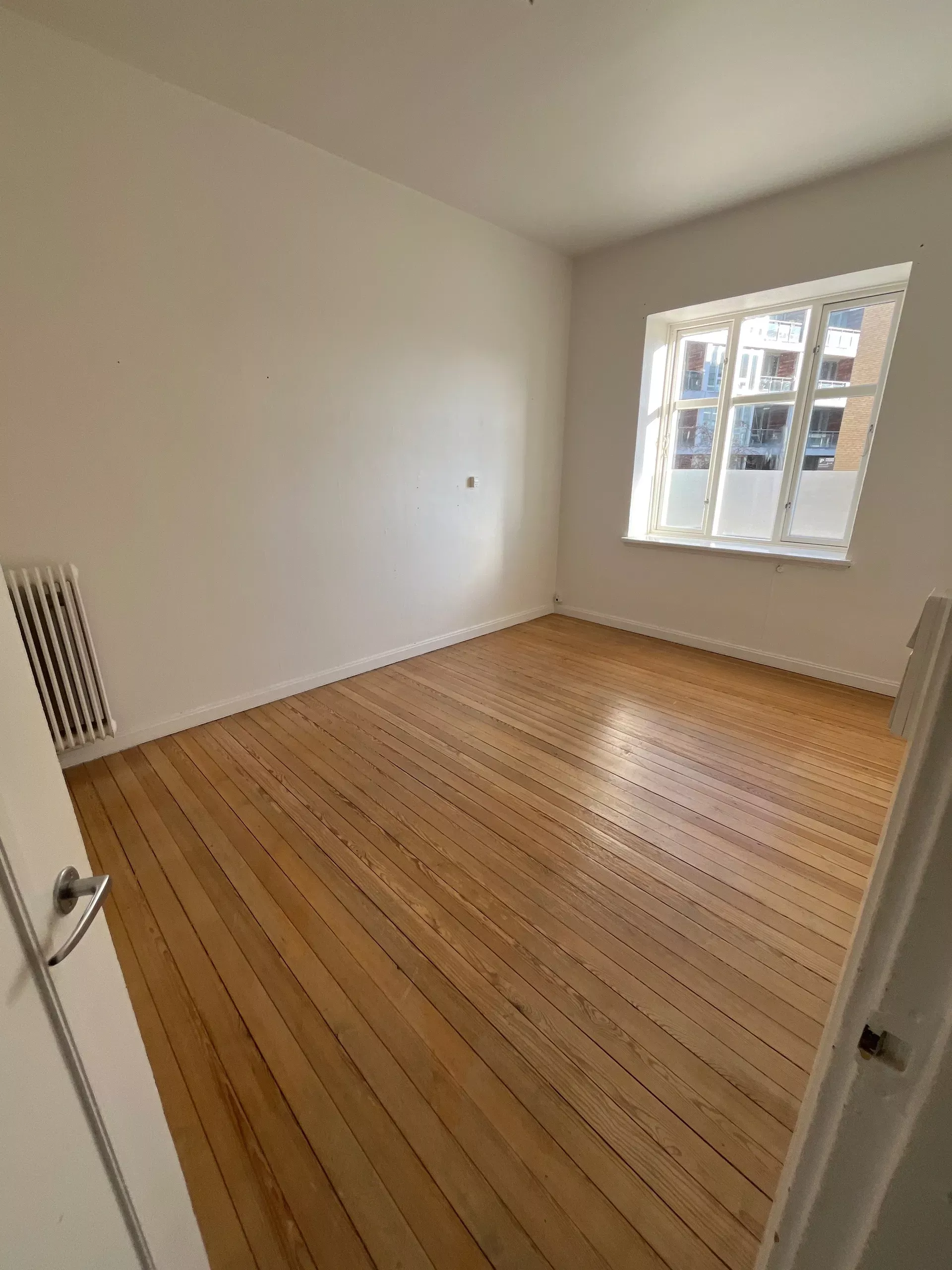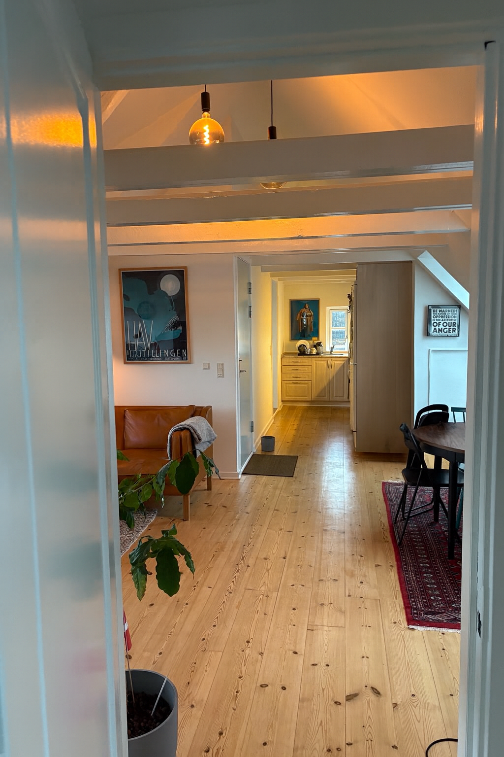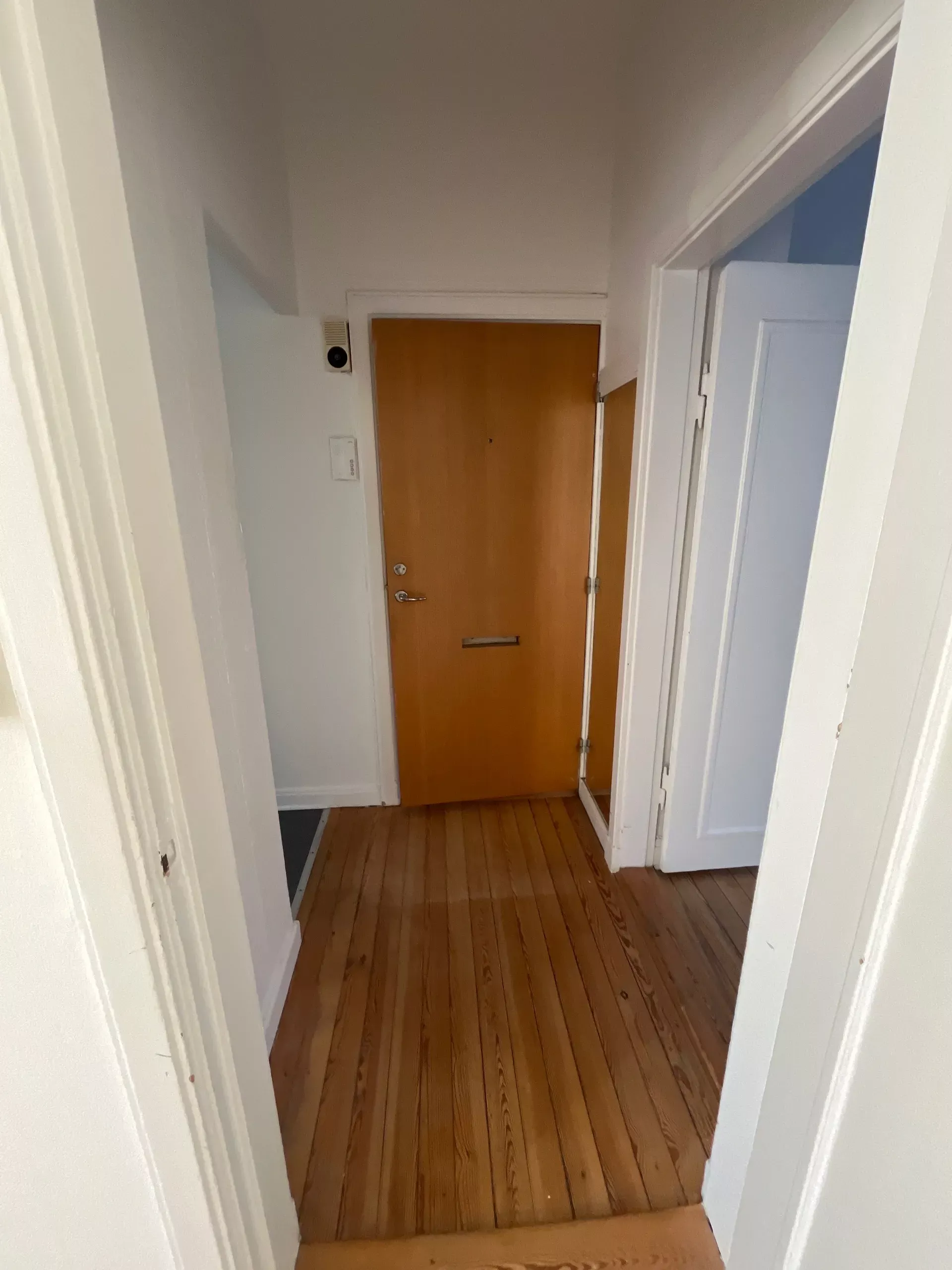 Boligen er beliggende på 1. sal (trapper ikke elevator) Og man får adgang via et mindre repos, hvor man sagtens kan have lidt krukker stående samt et par stole og et bord.