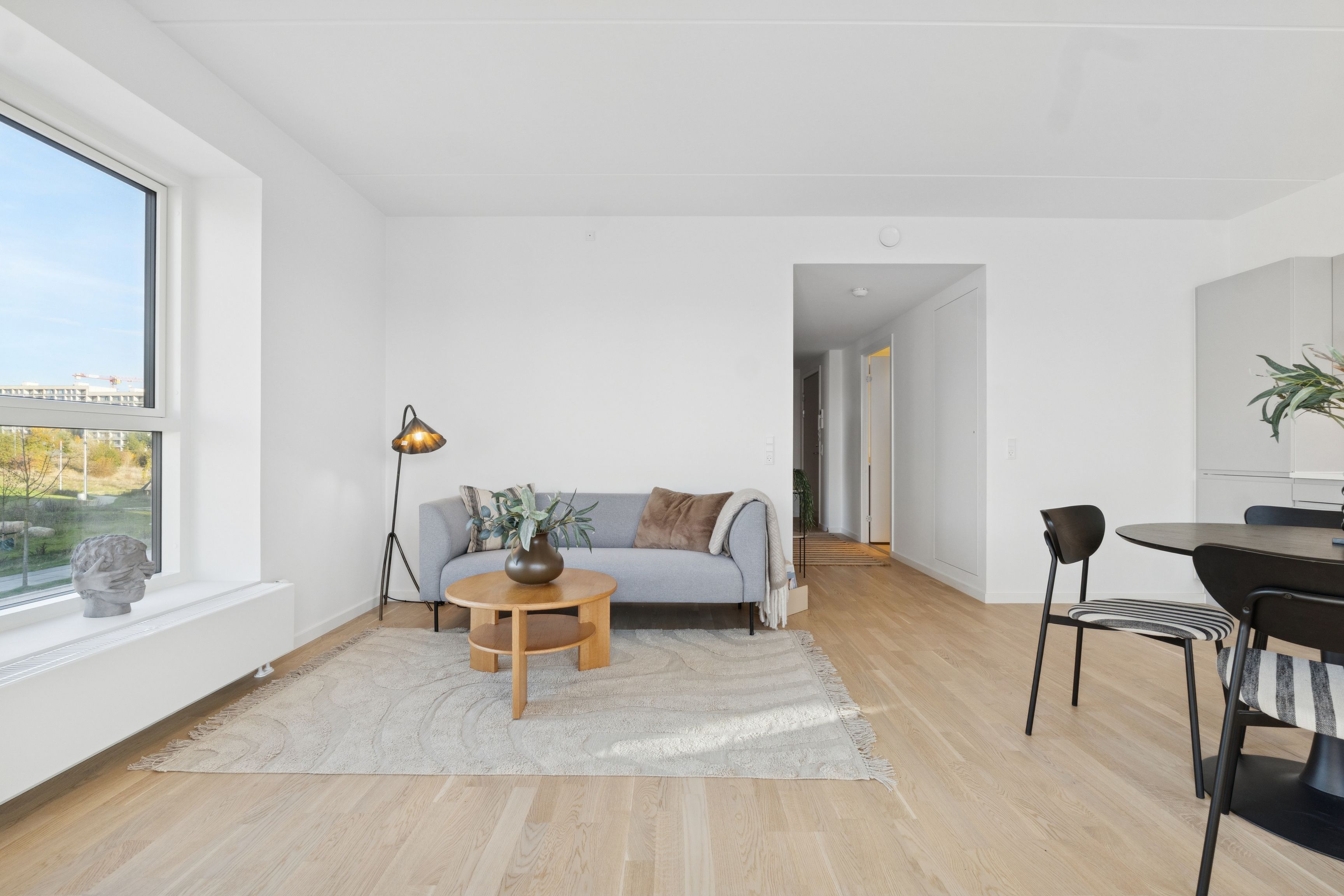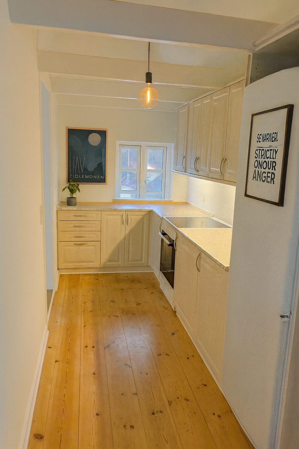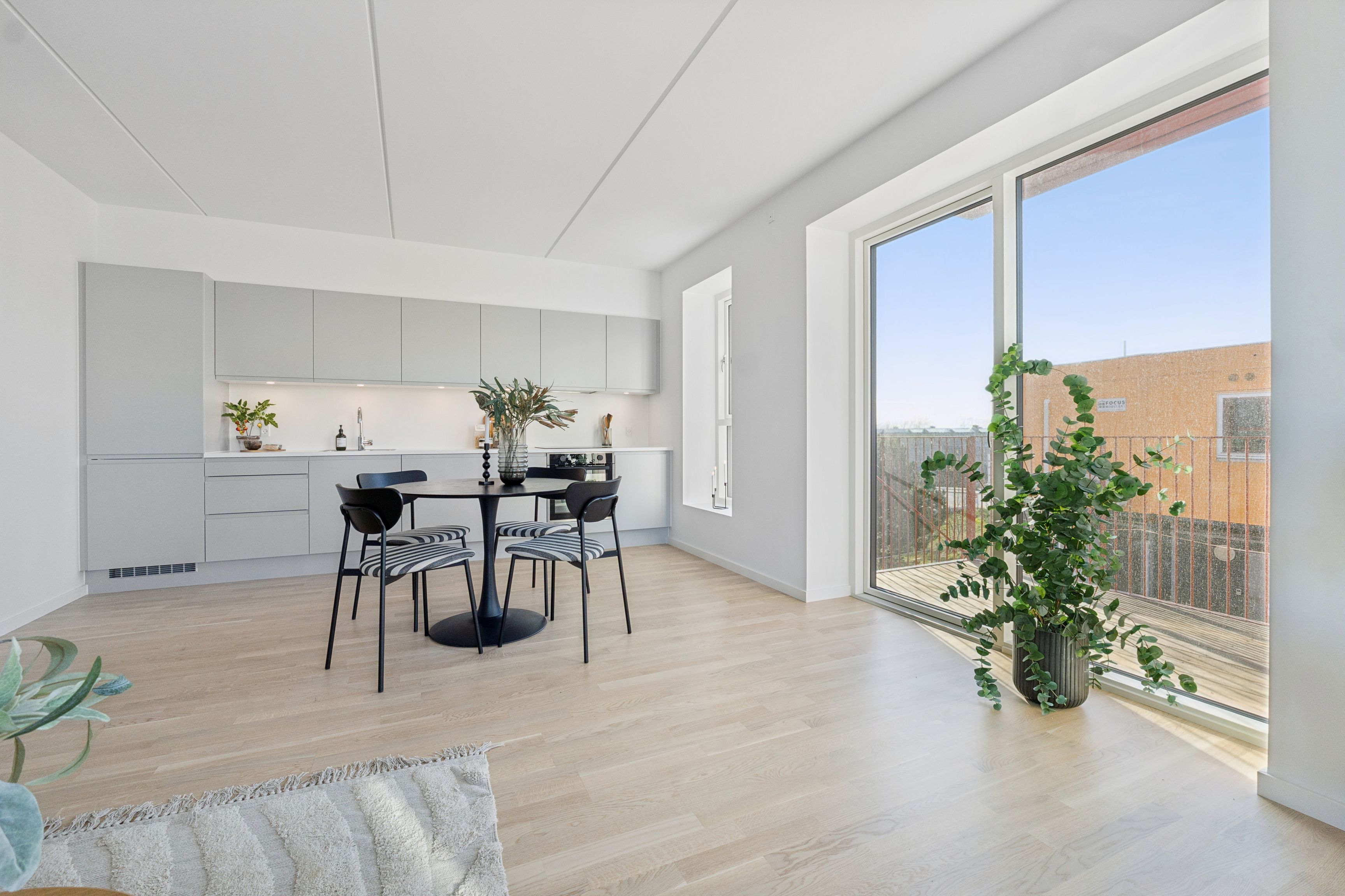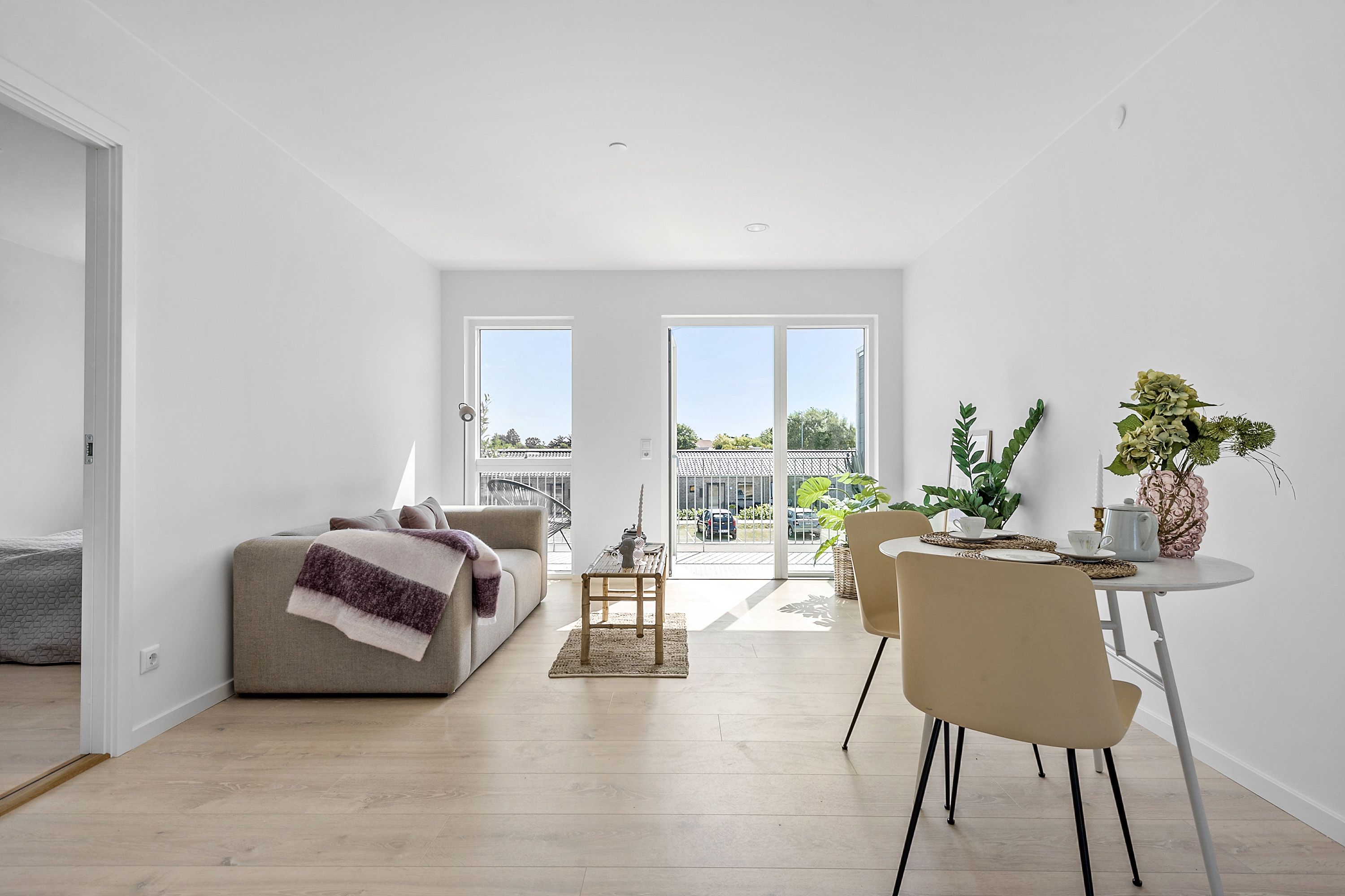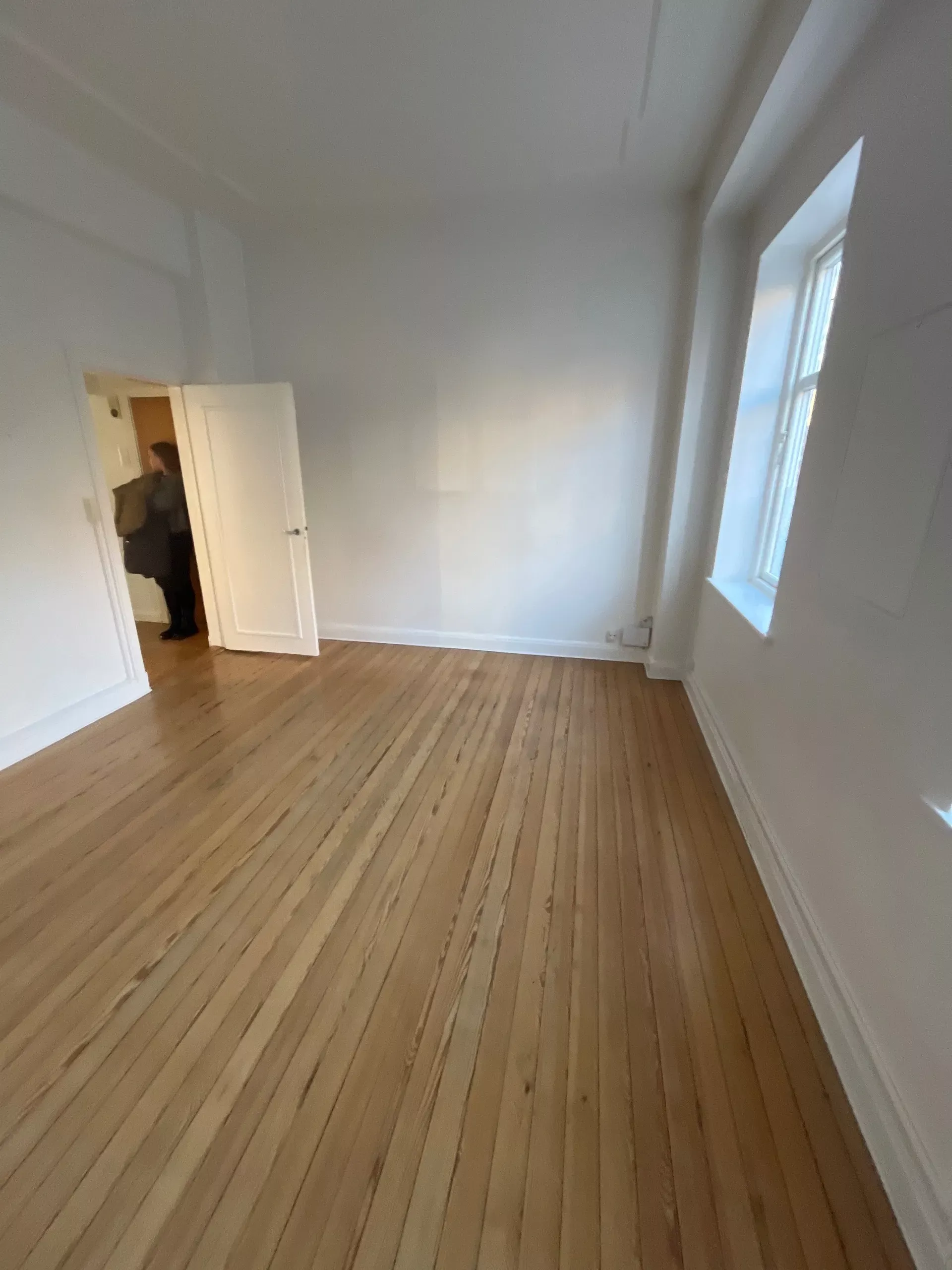 Boligen er beliggende på 1. sal (trapper ikke elevator) Og man får adgang via et mindre repos, hvor man sagtens kan have lidt krukker stående samt et par stole og et bord.