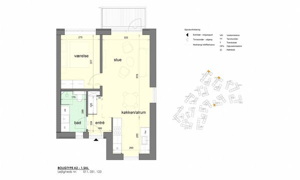 Fin entré med adgang til lejemålets depotrum, samt videre indgang til det kombinerede stue/køkken alrum. Derudover fint soveværelse og dejligt stort badeværelse med mulighed for at tilsluttet vaskemaskine og kondenstørretumbler.