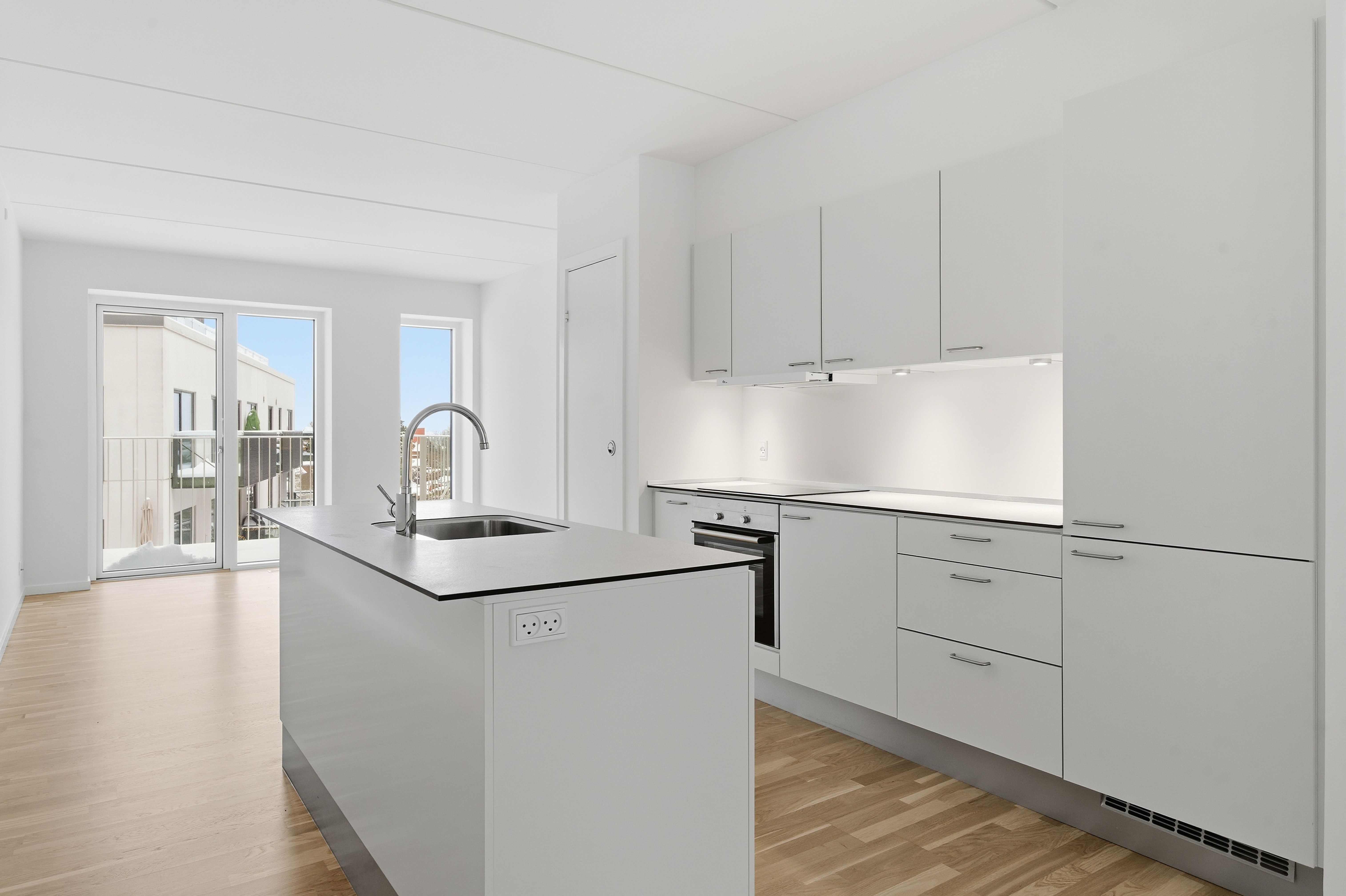 Lejlighederne er indrettet med store vinduespartier, og hjertet i boligen er det store, lækre køkkenalrum, hvor dagslyset i mange af dem strømmer ind fra begge sider. De fleste boliger har desuden en smuk karnap, der åbner rummet endnu mere op og fylder det med lys.