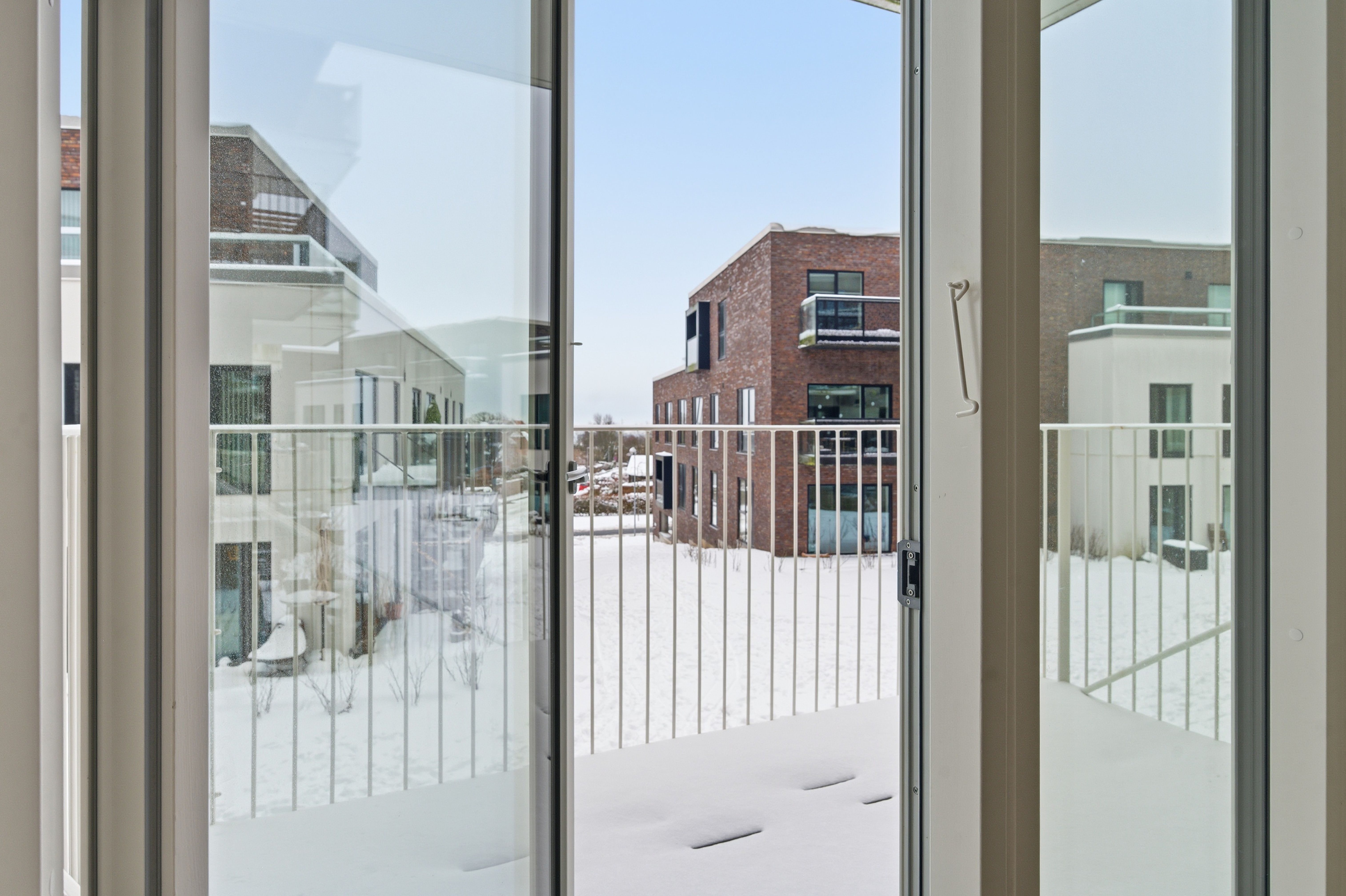 Alle lejligheder har adgang til deres eget private uderum i form af en terrasse i stueetagen eller skønne altaner med strækmetal, der giver lidt læ og privatliv og samtidig masser af lys og udsyn.