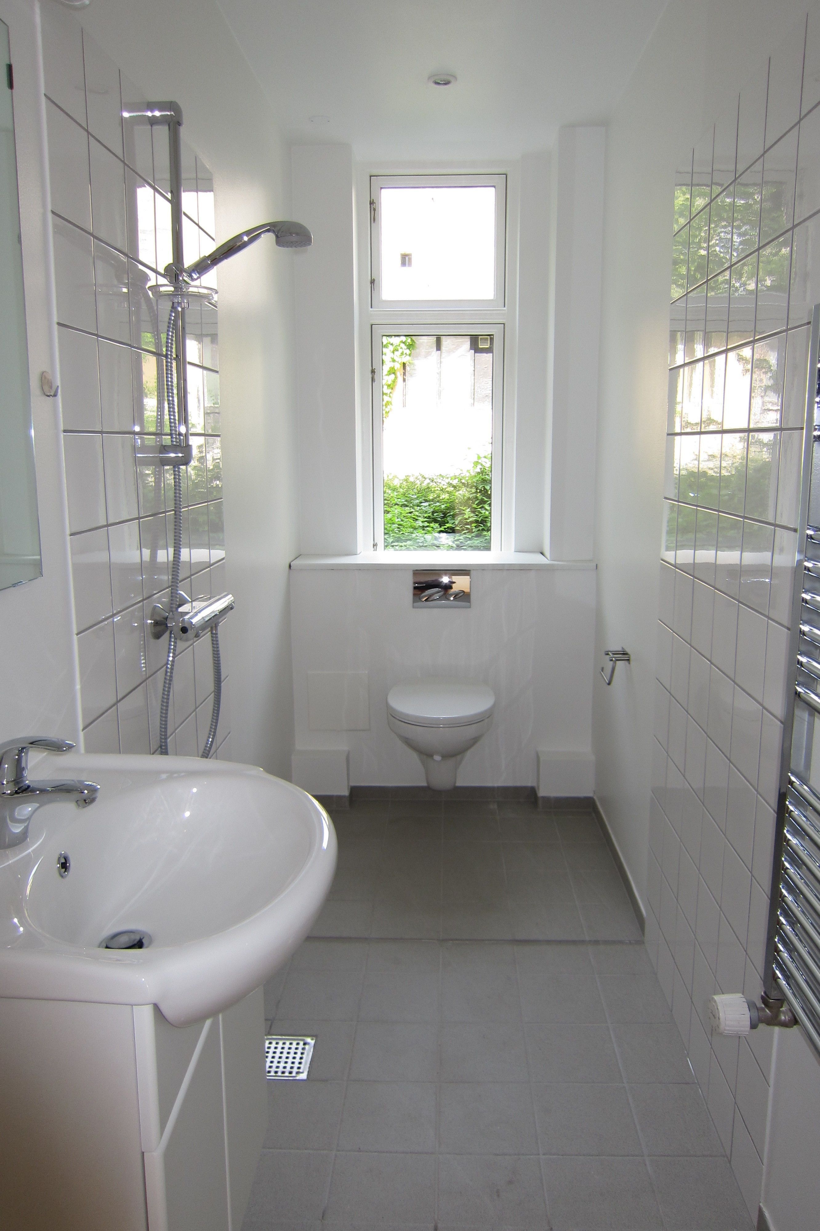 Badeværelset er rummeligt med væghængt toilet, vaskesøjle og håndvask med integreret underskab, så du har dine ting lige ved hånden. Og så har brusekabinen glasdør, så lyset kommer uhindret ind, og rummet virker større.