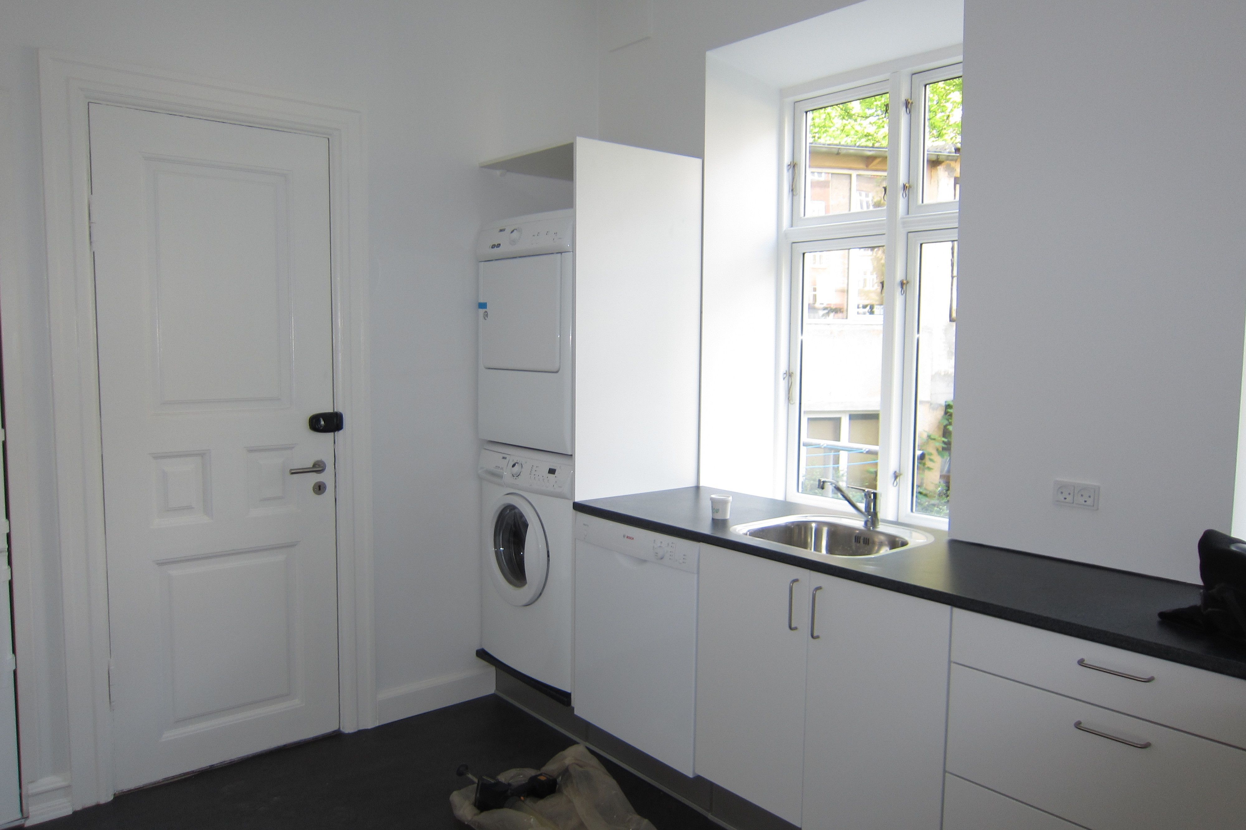 Det store køkkenalrum er designet til hverdagsliv, gæster og god mad. Her er der god plads til spisebordet, rummet er lyst og indbydende, og selve køkkenet er nordisk-inspireret med et rent minimalistisk udtryk. Låger og skuffer er grebsfrie, hvidevarerne er integreret og indbyggede spots giver godt arbejdslys på en diskret måde. Herfra er der udgang til en skøn overdækket terrasse.