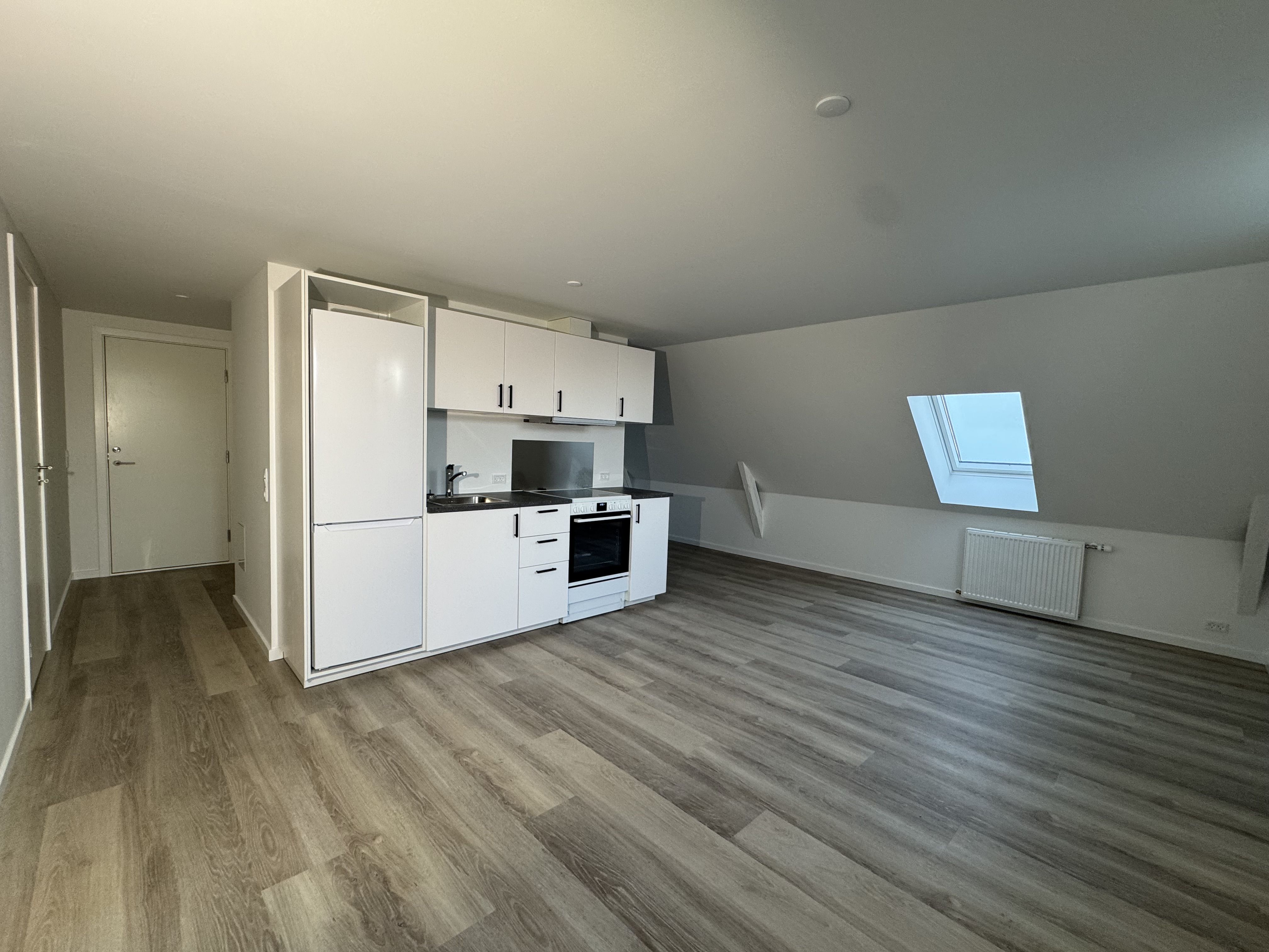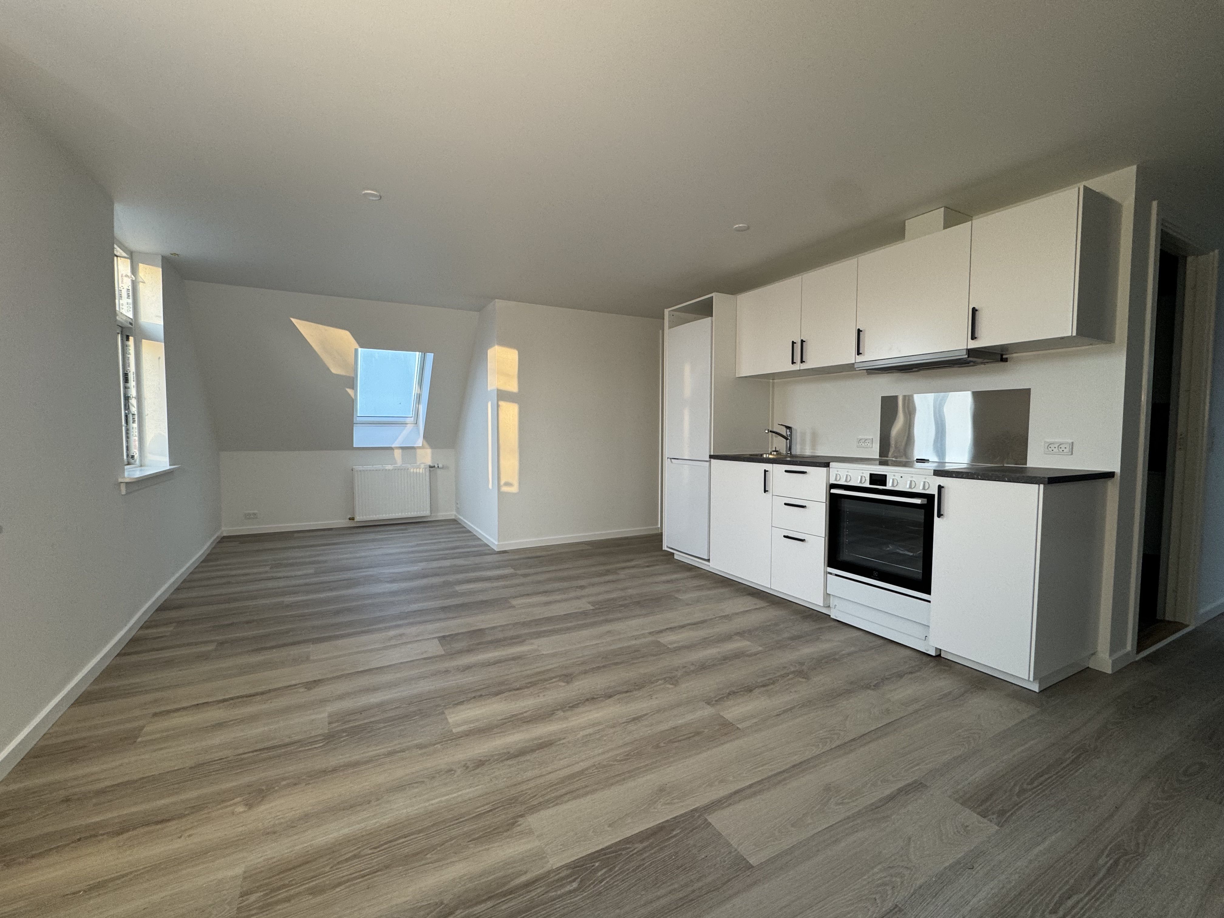 Lys, 100% ny renoveret lejelejlighed ved togstationen. Lejligheden fremstår total ny renoveret med lyse og funktionelle rum og moderne planløsning i et plan. Lejligheden indeholder stue/køkken/alrum i åben løsning med nyt elementkøkken inkl. hvidevarer ovn, kogeplade og kølefryseskab og emhætte. Der høre til køkkenet keramisk kogeplade, indbygningsovn. Badeværelse fremstår helt nye og vægfliser opsat i brusezone samt sanitet. Vægoverflader og lofter er hvidmalet. Hele ejendommen for nye hvinduer og døre, sat nyt tag. Ydermere bliver hele området omkring ejendommen sat i stand, sådan det fremstår flot. Klimaskærmen er forsynet med nye vinduer med termoglas og indgangsdøre. Der er nyt radiatoranlæg samt meget andet. Til lejligheden følger en parkeringsplads.