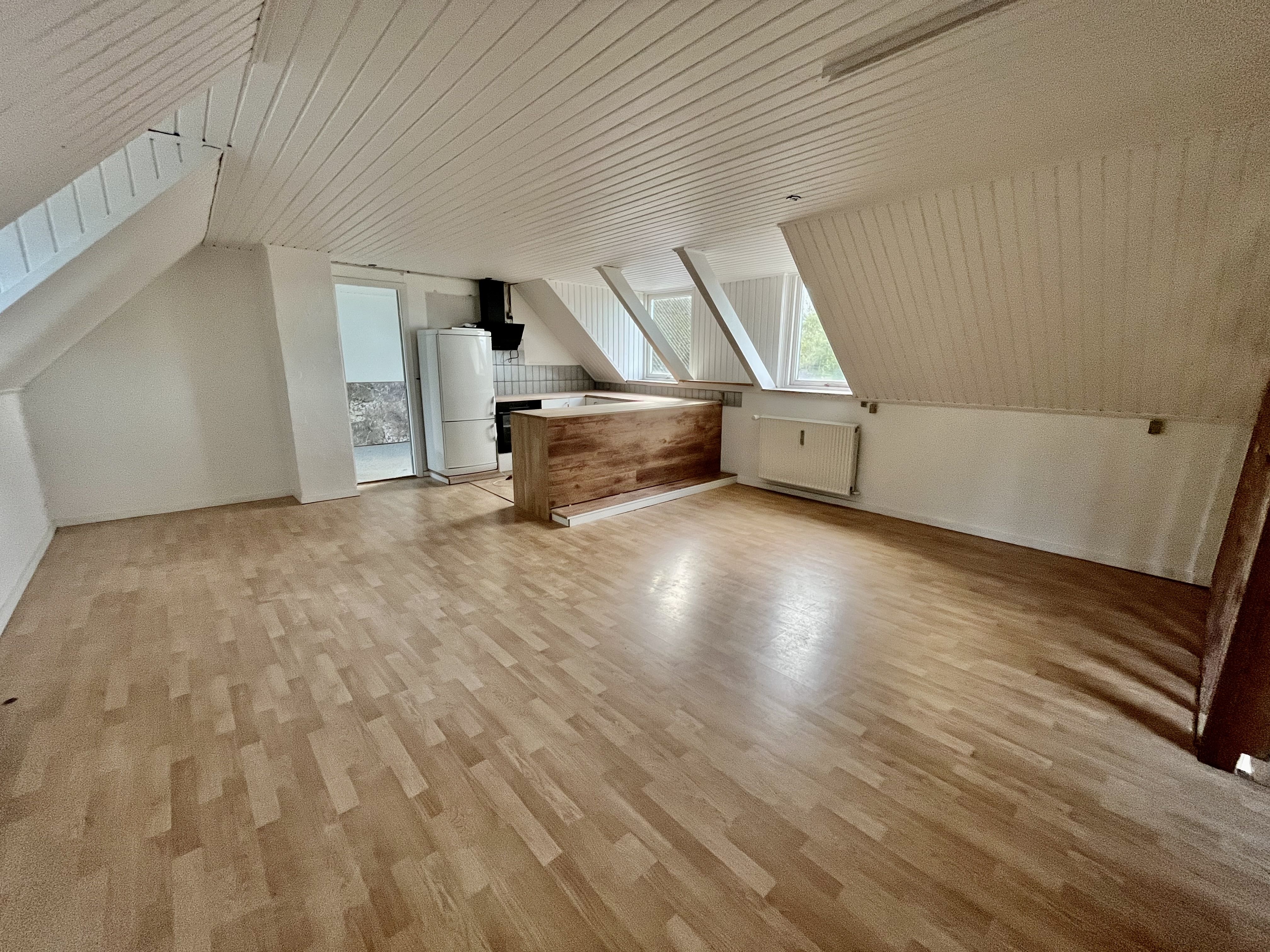 Fin lille 2-værelses lejlighed med eget køkken, badeværelse, stue og stort soveværelse.