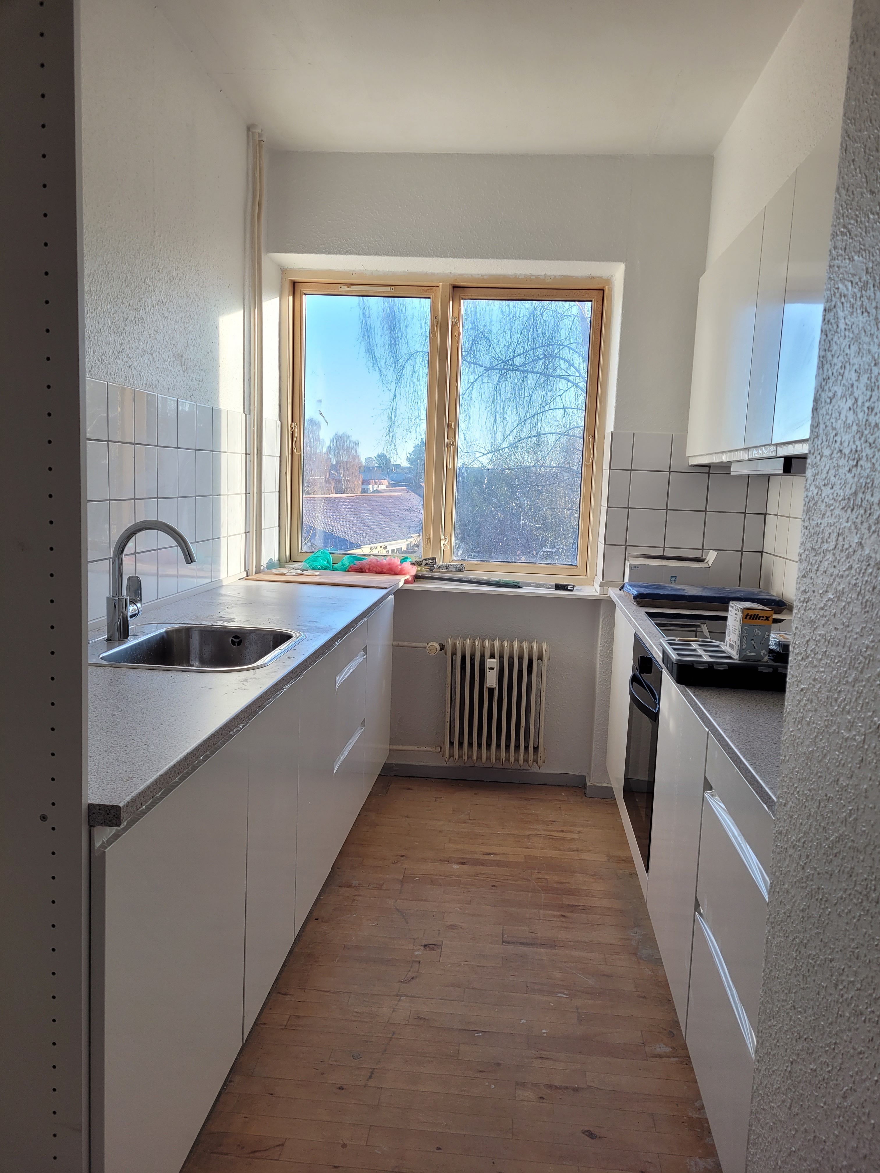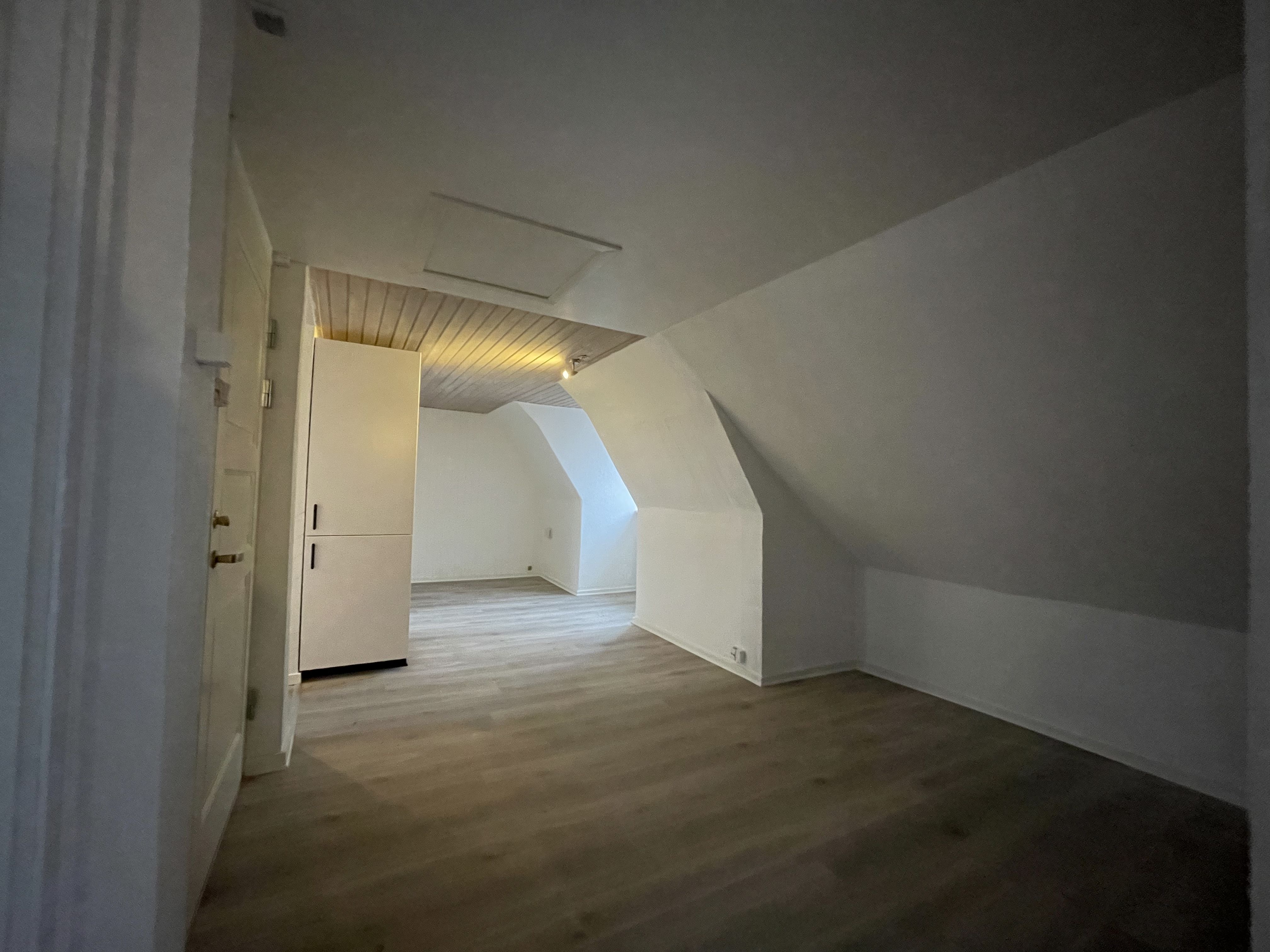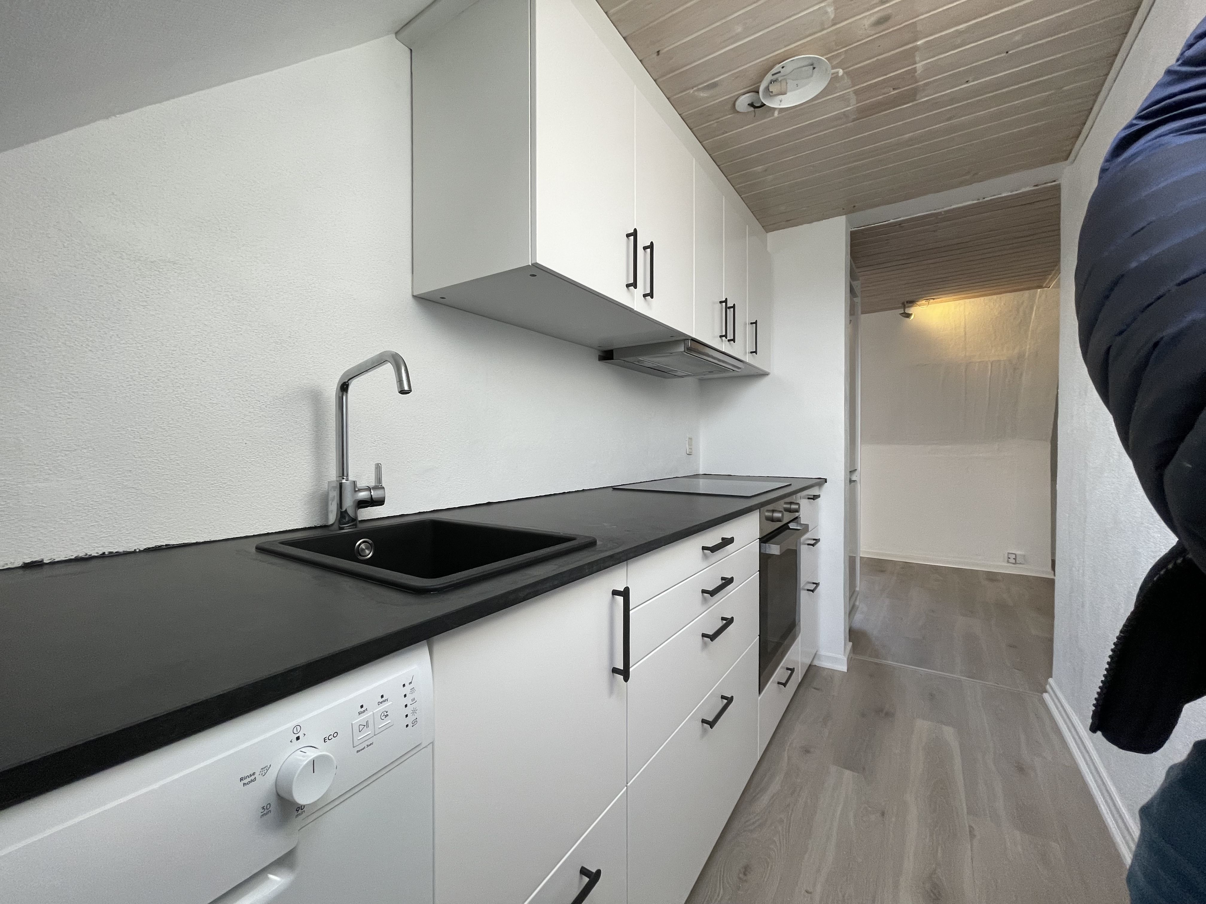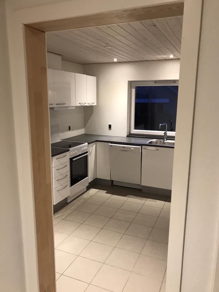 Soveværelset toner også frem med nyt tøjskab, nyslebet og nylakeret gulv. Lilleværelse med nyt tøjskab er også på etablering. På badeværelset er der bruseniche og gulvvarme under klinkerne. Køkkenet har 10-15 år på bagen men ikke ret meget brugt og er forsynet med god bordplads, vaskemaskine, lille opvaskemaskine, køle-fryseskab, emhætte, kogeplade og ovn. Sidst, men ikke mindst, er der entréen med kommode og garderober til overtøj og diverse ting.