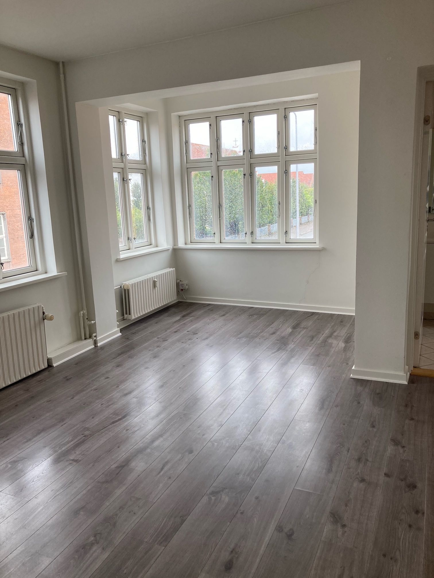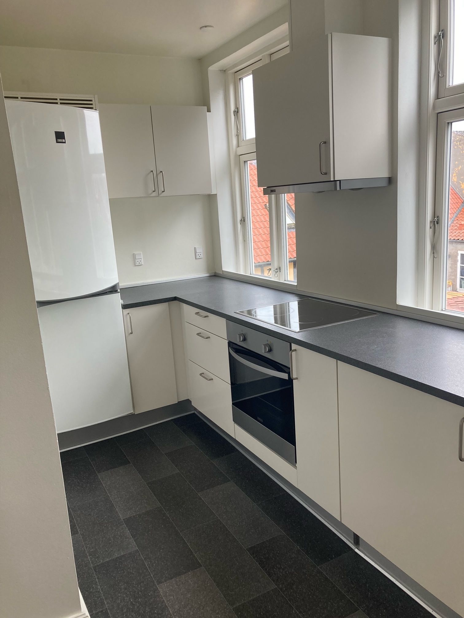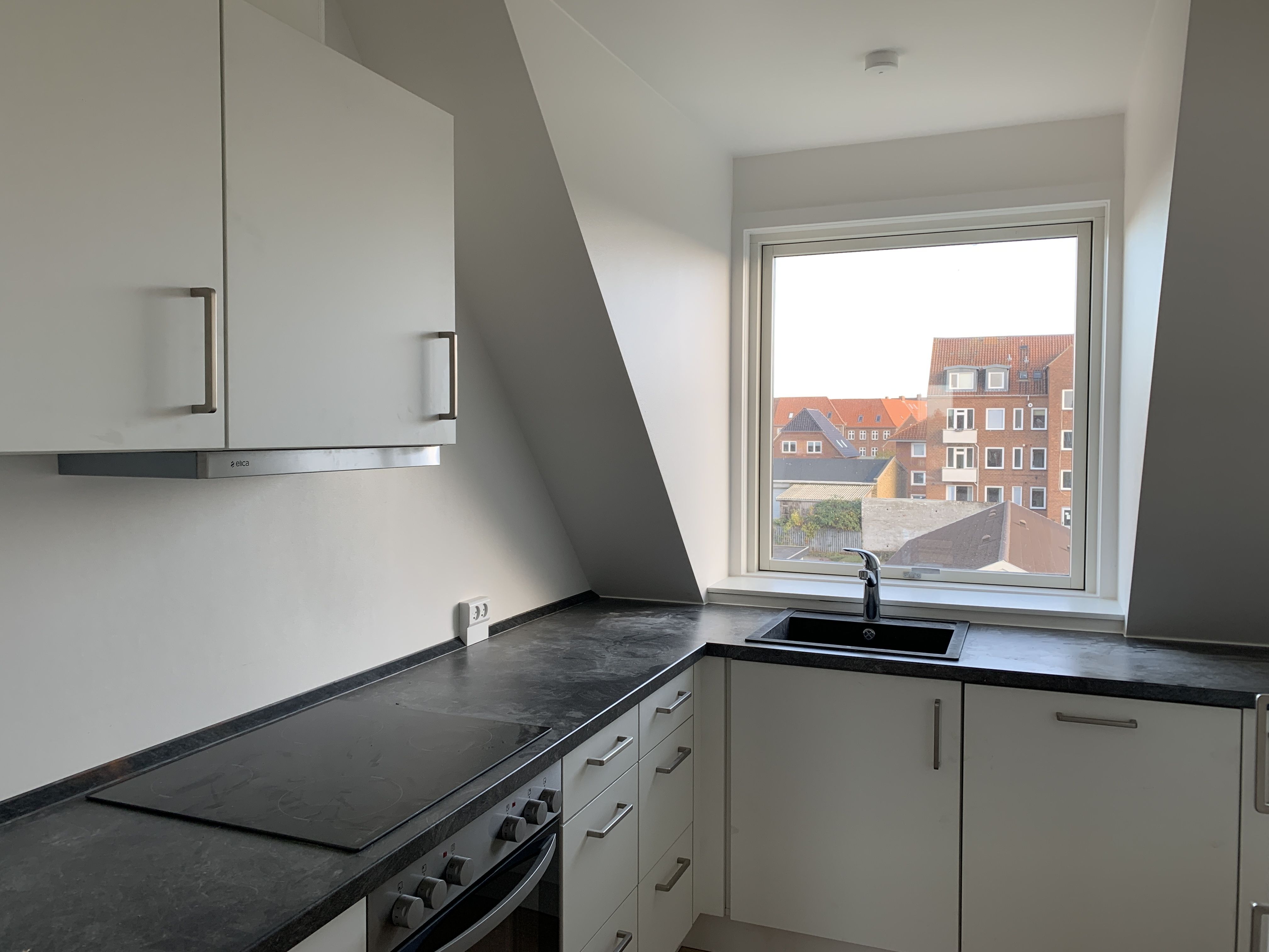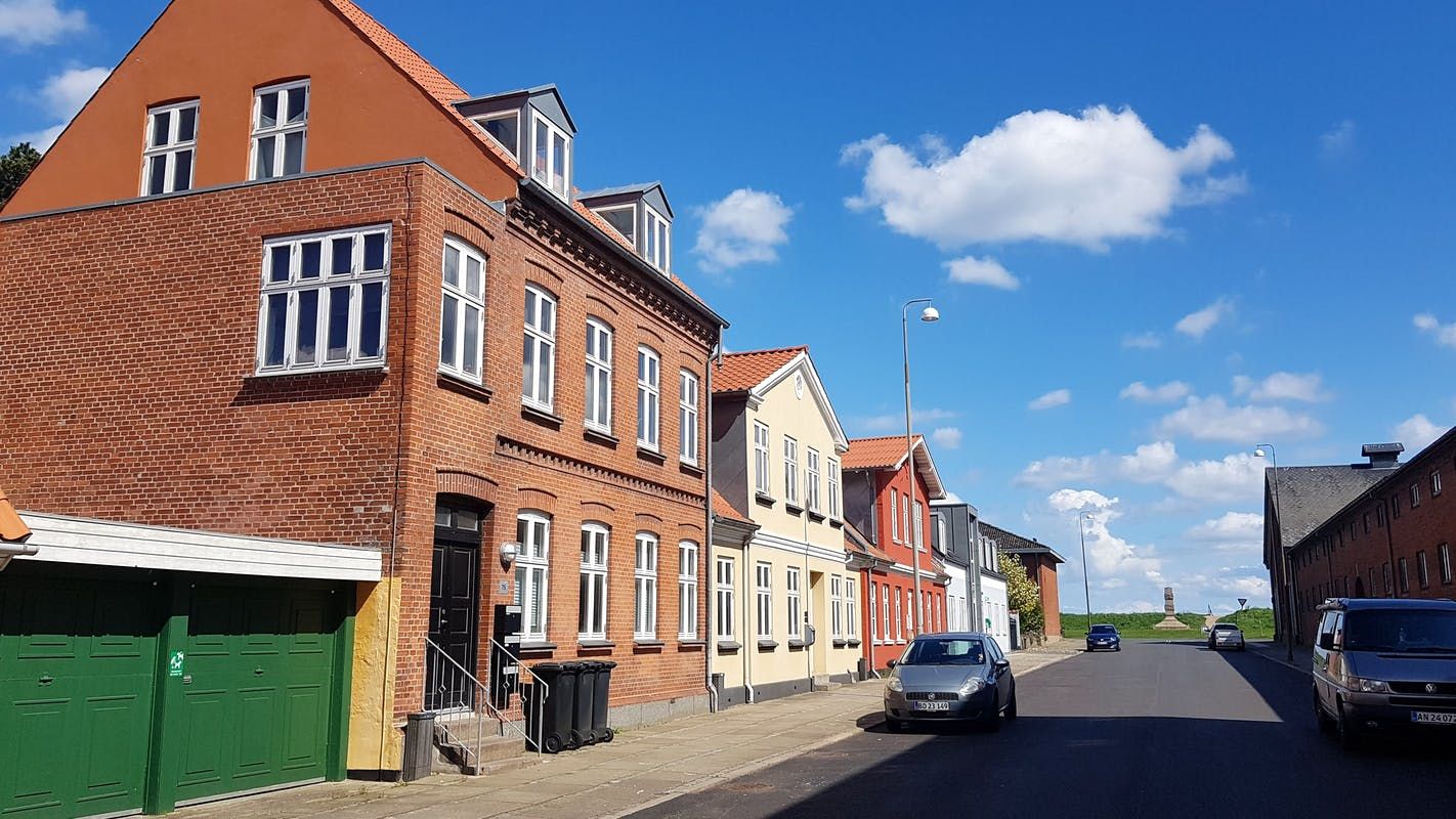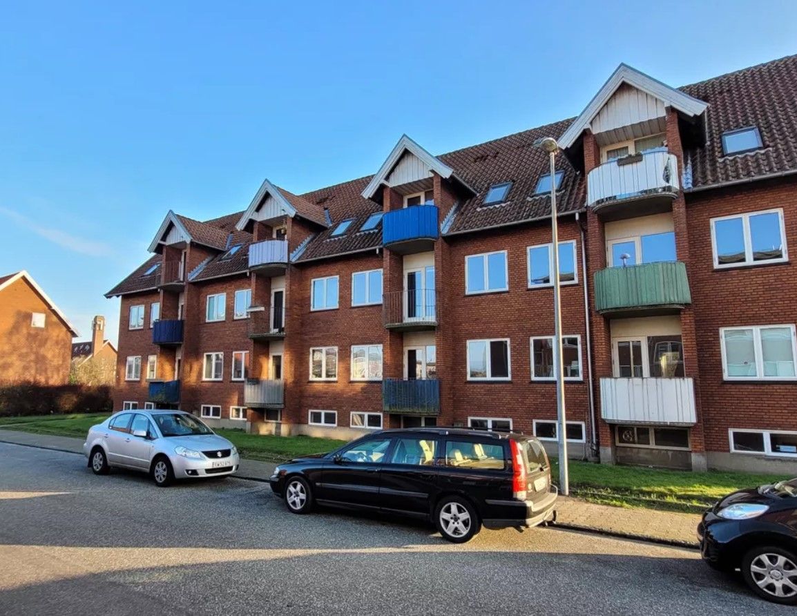 Perfekt beliggenhed, tæt i byen, banegård, havnen men i rolig kvarter. Skole og idrætshal er lige overfor døren. I 200 m gåafstand er der Netto og SuperBrugsen . Der strømmer et behageligt lysindfald ind ad de brede vinduespartier, som fremhæver det nyslebne og lakerede gulv.