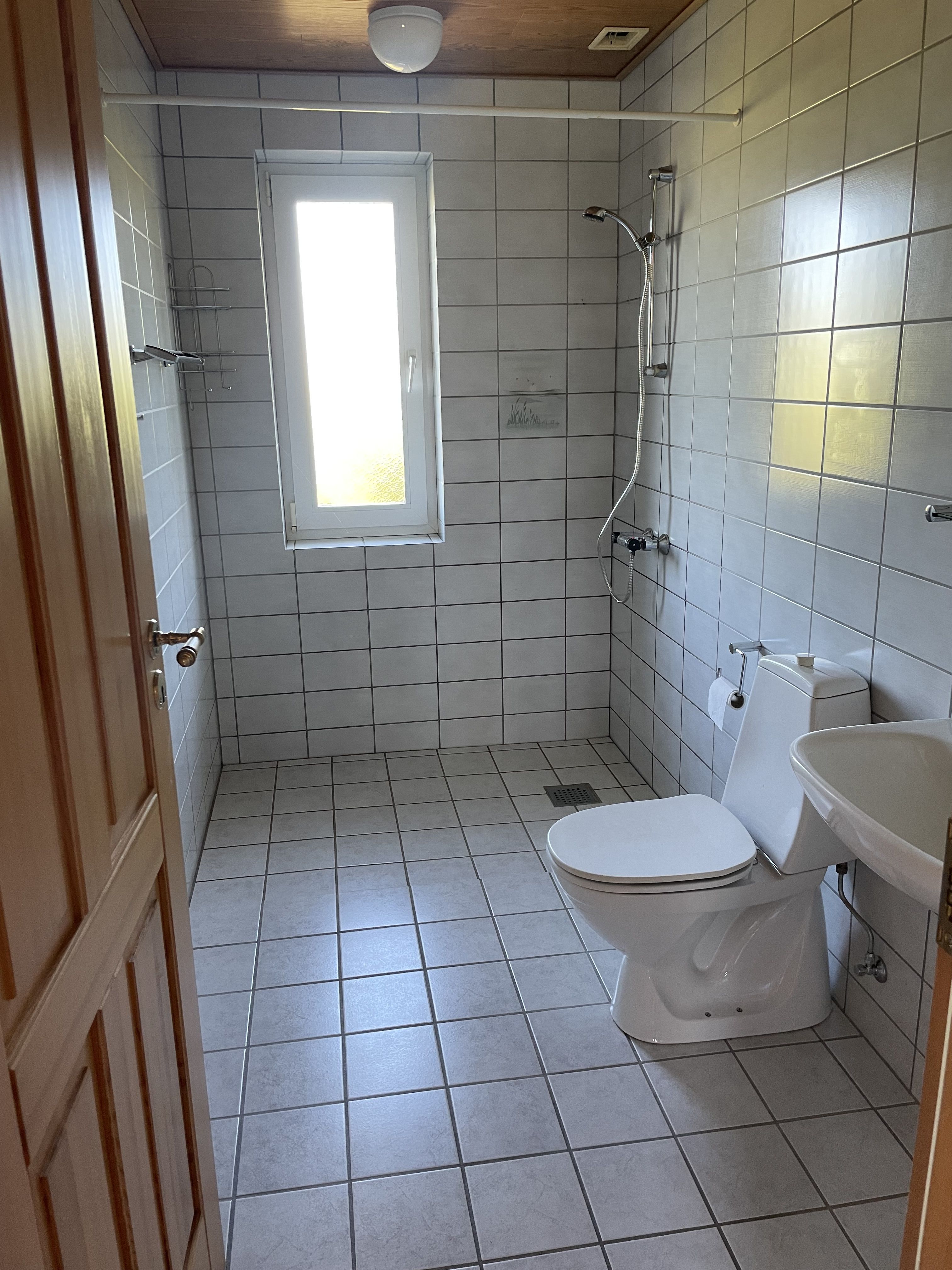Rummeligt badeværelse med fliser og separat bruseniche