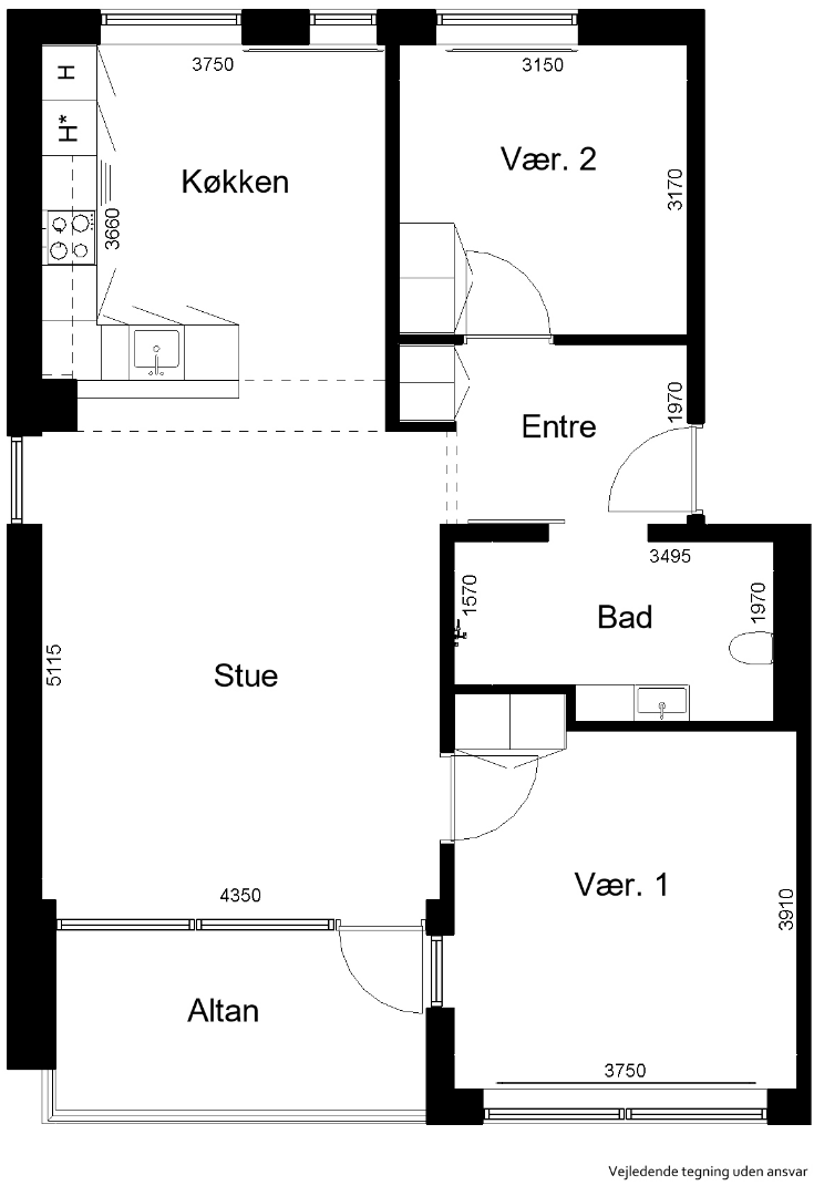 3 rm. apartment of 55 m²
