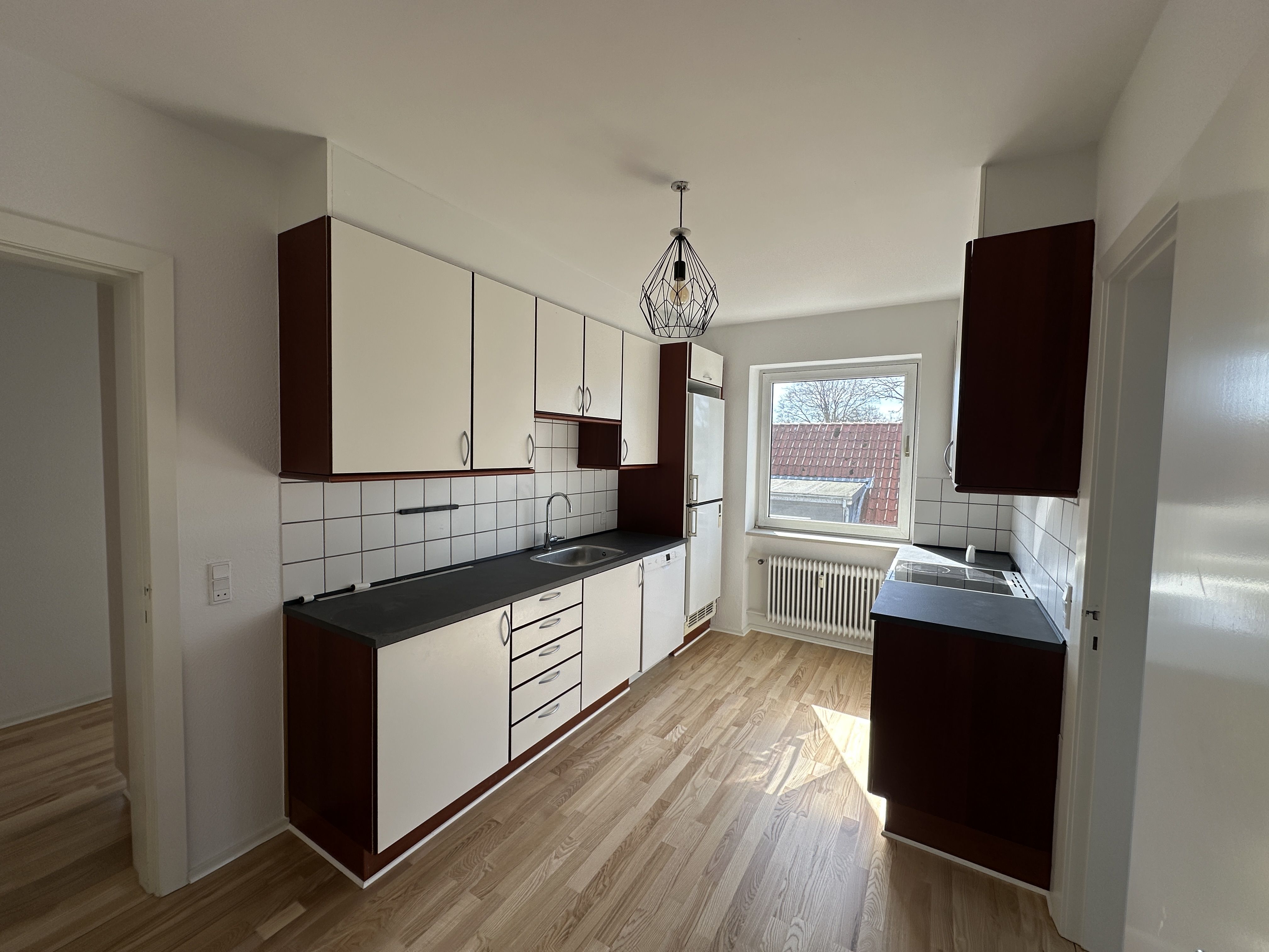 Der er massive egetræs gulve overalt i lejligheden.