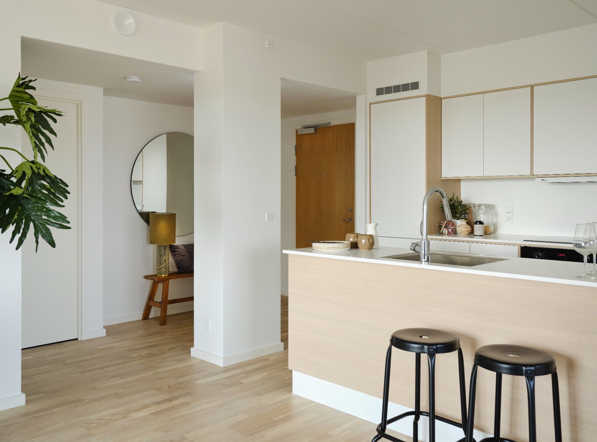 Lejligheden fremstår lys og rummelig med åbent køkken, spiseplads og opholdsstue. Kvaliteten er i højsædet med matlakeret gulv i ask, hvidt køkken fra Invita, der er udstyret med det nyeste inden for hårde hvidevarer - alle fra Bosch Siemens i energiklasse A+. Badeværelset er stort nok til at rumme den travle familie og har indbygget gulvvarme til de køligere dage. På badeværelset finder du også en integreret energivenlig vaskesøjle fra Bosch Siemens. OBS: ønskes der mål af lejligheden skal du selv huske opmålings udstyr til fremvisning, da der ikke er mål på plantegningen.
