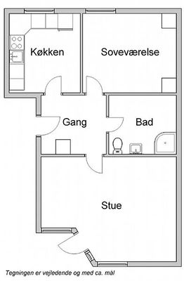 - Entre, stue, køkken, soveværelse og bad