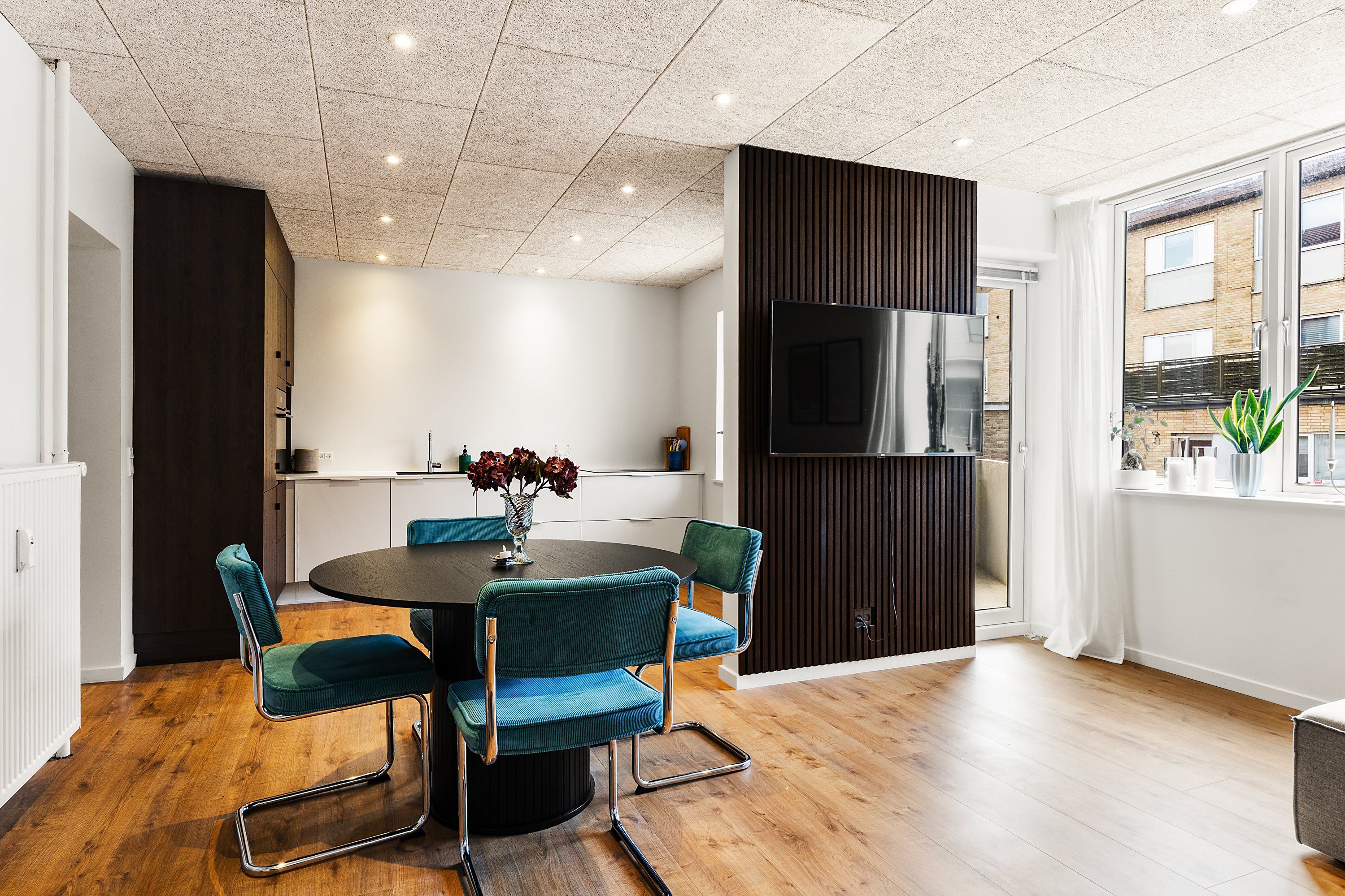 Lejemålet er i alt 60 m² og indrettet med et stort køkken-alrum, et værelse samt badeværelse.