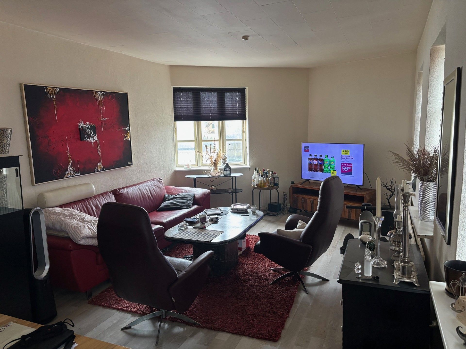 Lejligheden består af 2 store værelser og et meget stort køkkenalrum med nyt flot Svane køkken.