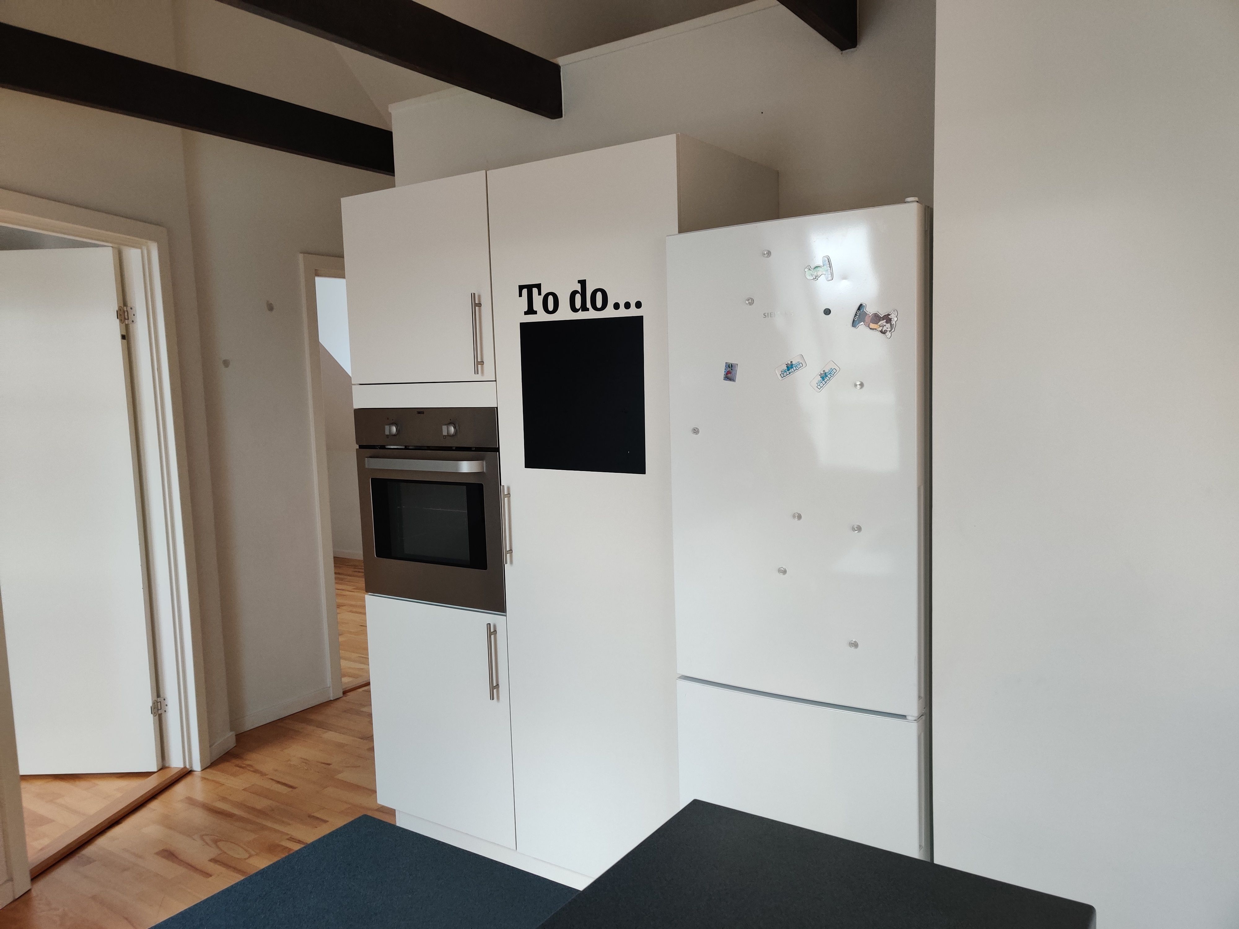 Her er en rummelig entrè, køkken med alle hårde hvidevarer (nye), spisestue og opholdsstue med franske glasdøre imellem.