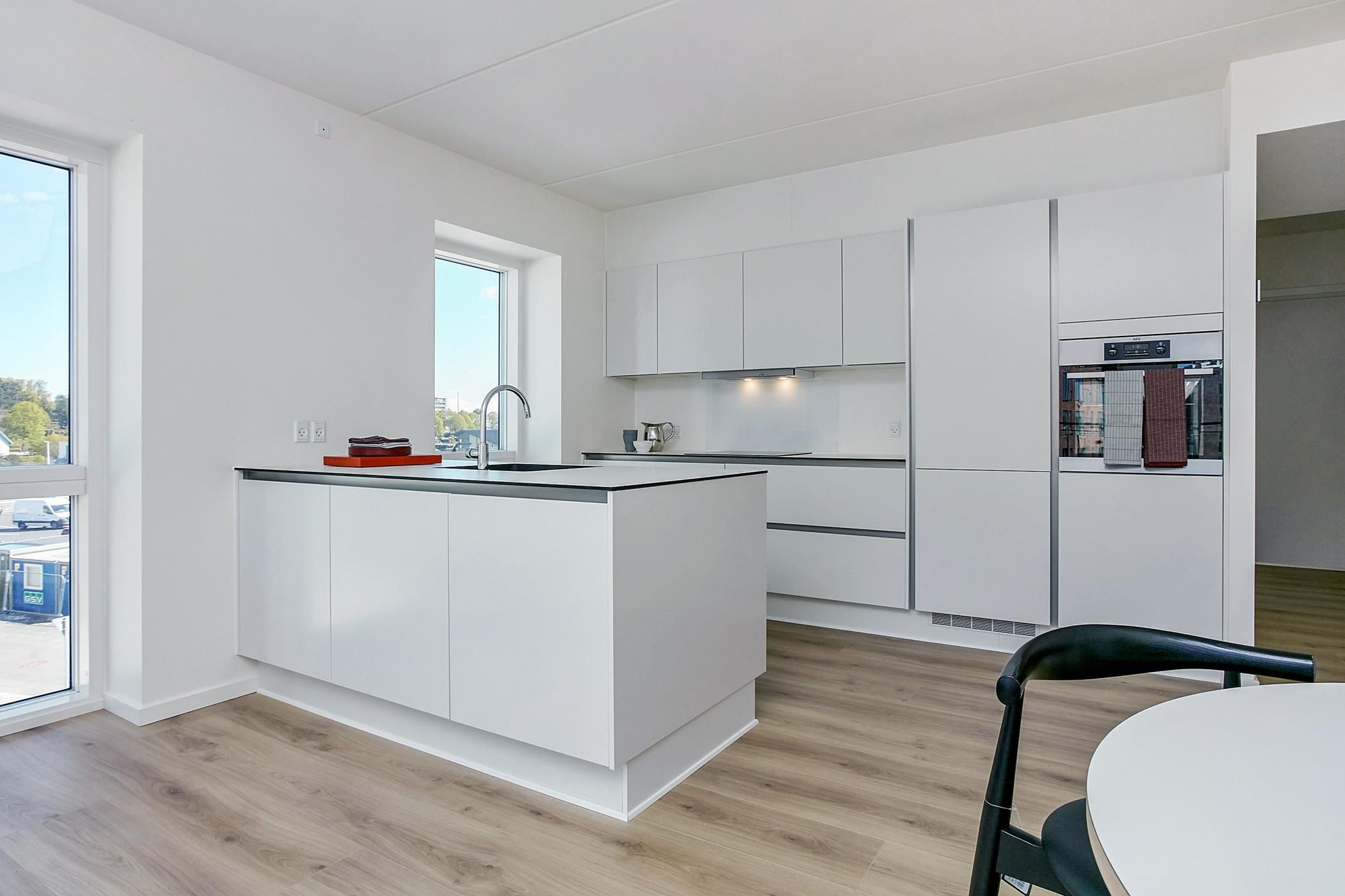 Leder du efter en bolig, der ikke bare er et sted at sove, men et statement? Øverst i en rolig ejendom centralt i Horsens finder du denne luksuriøse 2-værelses lejlighed, der mest af alt minder om noget fra et boligmagasin, man normalt kun tør røre ved med hvide handsker. Som den eneste lejer på 3. sal har du hele etagen for dig selv. Det første, der rammer dig, er rumfornemmelsen. Her er loft til kip, blottede spær og hanebånd, der giver sjæl til de i alt 117 kvadratmeter. Takket være de mange ovenlysvinduer strømmer dagslyset ind og minder dig om, at du bor højere end de fleste – både fysisk og i boligstandard. Hjertet i hjemmet er den store stue i åben forbindelse med et køkken-alrum, der indbyder til alt fra gastronomiske eksperimenter til de helt store samtaler over et glas kold hvidvin. Selvom lejligheden i realiteten "kun" er en 2-værelses, føles den som meget mere. De smarte hemse flere steder i boligen udnytter højden og giver plads til alt det, du ikke vil have stående fremme – eller måske et diskret læsehjørne. Du får desuden en entré, et lækkert badeværelse, en dedikeret gang til vaskefaciliteter (slut med at slæbe vasketøj ned ad trapperne!) og et soveværelse, hvor du vågner op med udsigt til himlen. Som kronen på værket kan du træde direkte ud på din altan og nyde roen over byens tage. Dette er boligen til den kræsne lejer, der sætter pris på arkitektoniske detaljer og masser af luft omkring sig. Det er ikke bare en lejlighed; det er din egen private oase midt i byen.